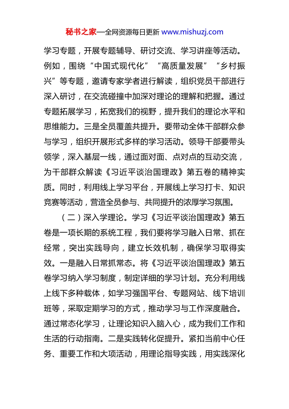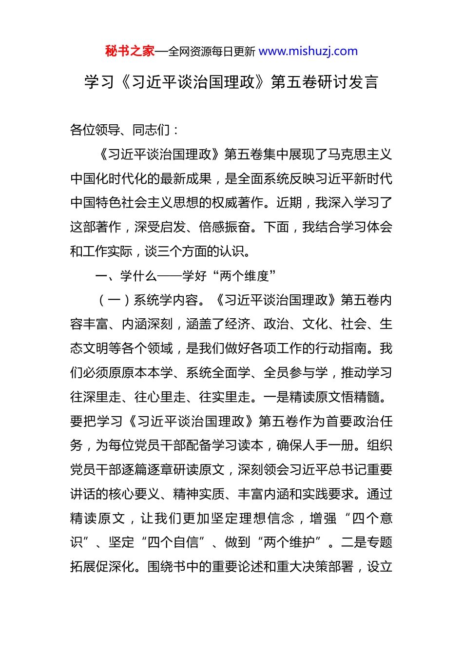 秘书之家—全网资源每日更新 www.mishuzj.com学习《习近平谈治国理政》第五卷研讨发言 各位领导、同志们:《习近平谈治国理政》第五卷集中展现了马克思主义中国化时代化的最新成果,是全面系统反映习近平新时代中国特色社会主义思想的权威著作。近期,我深入学习了这部著作,深受启发、倍感振奋。下面,我结合学习体会和工作实际,谈三个方面的认识。一、学什么——学好“两个维度”(一)系统学内容。《习近平谈治国理政》第五卷内容丰富、内涵深刻,涵盖了经济、政治、文化、社会、生态文明等各个领域,是我们做好各项工作的行动指南。我们必须原原本本学、系统全面学、全员参与学,推动学习往深里走、往心里走、往实里走。一是精读原文悟精髓。要把学习《习近平谈治国理政》第五卷作为首要政治任务,为每位党员干部配备学习读本,确保人手一册。组织党员干部逐篇逐章研读原文,深刻领会习近平总书记重要讲话的核心要义、精神实质、丰富内涵和实践要求。通过精读原文,让我们更加坚定理想信念,增强“四个意识”、坚定“四个自信”、做到“两个维护”。二是专题拓展促深化。围绕书中的重要论述和重大决策部署,设立秘书之家—全网资源每日更新 www.mishuzj.com学习专题,开展专题辅导、研讨交流、学习讲座等活动。例如,围绕“中国式现代化”“高质量发展”“乡村振兴”等专题,邀请专家学者进行解读,组织党员干部进行深入研讨,在交流碰撞中加深对理论的理解和把握。通过专题拓展学习,拓宽我们的视野,提升我们的理论水平和思维能力。三是全员覆盖共提升。要带动全体干部群众参与学习,组织开展形式多样的学习活动。领导干部要带头领学,深入基层一线,通过面对面、点对点的互动交流,为干部群众解读《习近平谈治国理政》第五卷的精神实质。同时,利用线上学习平台,开展线上学习打卡、知识竞赛等活动,营造全员参与、共同提升的浓厚学习氛围。(二)深入学理论。学习《习近平谈治国理政》第五卷是一项长期的系统工程,我们要将学习融入日常、抓在经常,突出实践导向,建立长效机制,确保学习取得实效。一是融入日常抓常态。将《习近平谈治国理政》第五卷学习纳入学习制度,制定详细的学习计划。充分利用线上线下多种载体,如学习强国平台、专题网站、线下培训班等,采取定期学习的方式,推动学习与工作深度融合。通过常态化学习,让理论知识入脑入心,成为我们工作和生活的行动指南。二是实践转化促提升。紧扣当前中心任务、重要工作和大项活动,用理论指导实践,用实践深化秘书之家—全网资源每日更新 www.mishuzj.com理论。例如,在推动经济高质量发展中,运用书中关于新发展理念的论述,指导我们优化产业结构、推动科技创新;在乡村振兴工作中,运用书中关于农业农村现代化的论述,指导我们加强农村基础设施建设、促进农民增收致富。通过实践转化,不断提升我们把握规律、破解难题的能力。三是机制保障促长效。制定《习近平谈治国理政》第五卷学习方案计划,明确学习目标、学习内容、学习方式和考核标准。将理论学习成效纳入考核体系,对学习认真、成效显著的单位和个人进行表彰奖励,对学习不认真、敷衍了事的进行督促整改。通过建立长效机制,推动形成自觉主动学、持续深入学的良好局面。二、想什么——想好“两个为本”(一)想以民为本。《习近平谈治国理政》第五卷始终贯穿以人民为中心的发展思想,体现了中国共产党的根本宗旨和价值追求。我们要牢记为人民服务的宗旨,想群众之所想,急群众之所急,解群众之所难。一是响应需求解民忧。要深入基层、深入群众,了解群众的需求和诉求。通过开展问卷调查、实地走访、召开座谈会等方式,广泛收集群众的意见和建议,建立群众需求台账。对群众反映的问题,要及时进行梳理和分类,明确责任单位和责任人,限时办理,确保群众的需求得到及时响应。二是办秘书之家—全网资源每日更新 www.mishuzj.com好实事暖民心。持续开展为基层服务、为群众办实事活动,聚焦群众关心的教育、医疗、就业、住房等热点难点问题,加大投入力度,采取有效措施,切实解决群众的实际困难。例如,加强教育基础设施建设,提高教育教学质量;加大...