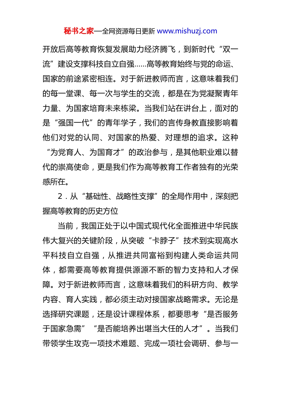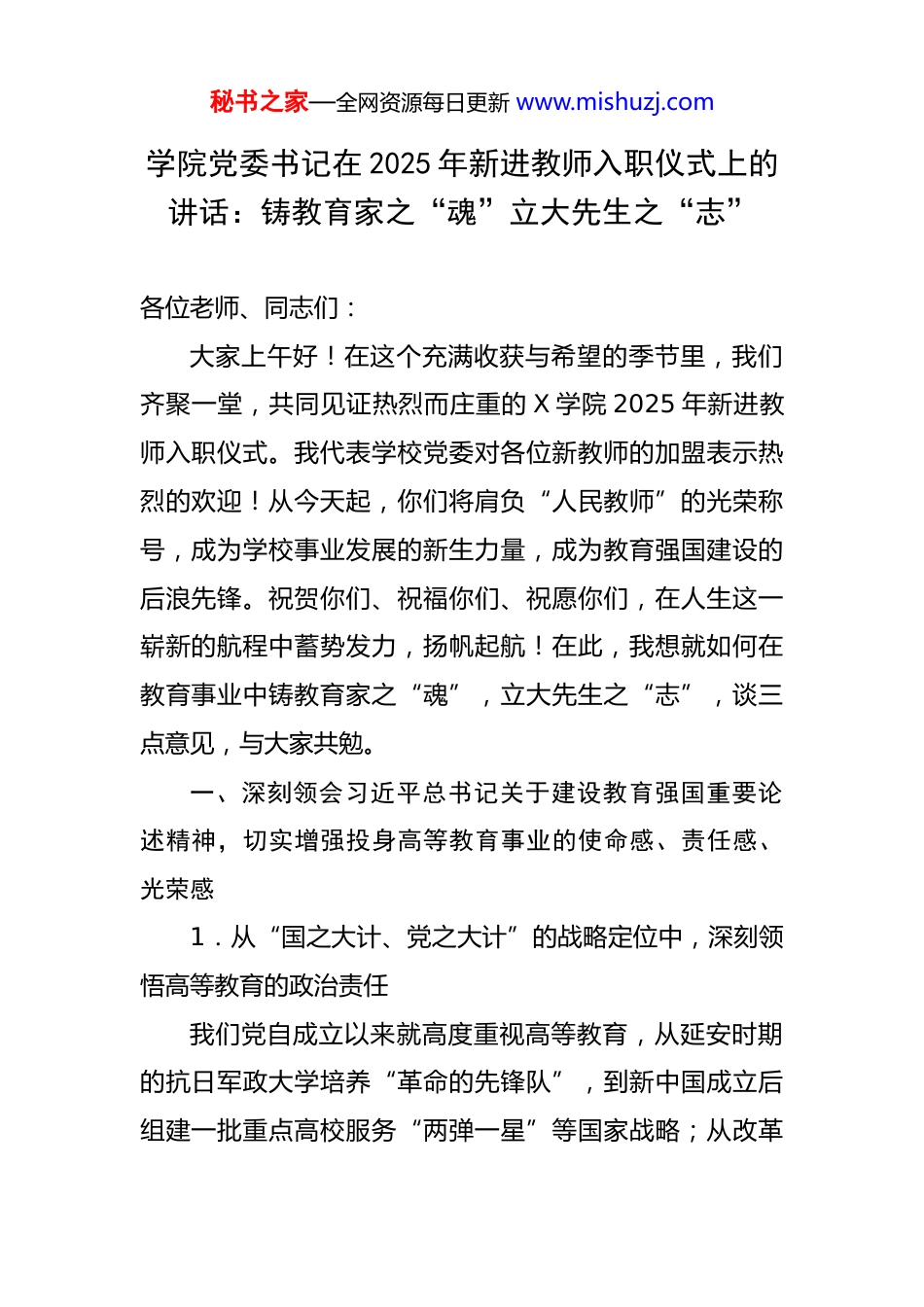 秘书之家—全网资源每日更新 www.mishuzj.com学院党委书记在 2025 年新进教师入职仪式上的讲话:铸教育家之“魂”立大先生之“志” 各位老师、同志们:大家上午好!在这个充满收获与希望的季节里,我们齐聚一堂,共同见证热烈而庄重的 X 学院 2025 年新进教师入职仪式。我代表学校党委对各位新教师的加盟表示热烈的欢迎!从今天起,你们将肩负“人民教师”的光荣称号,成为学校事业发展的新生力量,成为教育强国建设的后浪先锋。祝贺你们、祝福你们、祝愿你们,在人生这一崭新的航程中蓄势发力,扬帆起航!在此,我想就如何在教育事业中铸教育家之“魂”,立大先生之“志”,谈三点意见,与大家共勉。一、深刻领会习近平总书记关于建设教育强国重要论述精神,切实增强投身高等教育事业的使命感、责任感、光荣感1.从“国之大计、党之大计”的战略定位中,深刻领悟高等教育的政治责任我们党自成立以来就高度重视高等教育,从延安时期的抗日军政大学培养“革命的先锋队”,到新中国成立后组建一批重点高校服务“两弹一星”等国家战略;从改革秘书之家—全网资源每日更新 www.mishuzj.com开放后高等教育恢复发展助力经济腾飞,到新时代“双一流”建设支撑科技自立自强……高等教育始终与党的命运、国家的前途紧密相连。对于新进教师而言,这意味着我们的每一堂课、每一次与学生的交流,都是在为党凝聚青年力量、为国家培育未来栋梁。当我们站在讲台上,面对的是“强国一代”的青年学子,我们的言传身教直接影响着他们对党的认同、对国家的热爱、对理想的追求。这种“为党育人、为国育才”的政治参与,是其他职业难以替代的崇高使命,更是我们作为高等教育工作者独有的光荣感所在。2.从“基础性、战略性支撑”的全局作用中,深刻把握高等教育的历史方位当前,我国正处于以中国式现代化全面推进中华民族伟大复兴的关键阶段,从突破“卡脖子”技术到实现高水平科技自立自强,从推进共同富裕到构建人类命运共同体,都需要高等教育提供源源不断的智力支持和人才保障。对于新进教师而言,这意味着我们的科研方向、教学内容、育人实践,都必须主动对接国家战略需求。无论是选择研究课题,还是设计课程体系,都要思考“是否服务于国家急需”“是否能培养出堪当大任的人才”。当我们带领学生攻克一项技术难题、完成一项社会调研、参与一秘书之家—全网资源每日更新 www.mishuzj.com项国家项目时,我们不仅在推动学术进步,更是在为国家的现代化建设添砖加瓦。这种“与国家同频共振”的参与感,正是“为党育人、为国育才”使命感的最生动体现。3.从“立德树人”的根本任务中,深刻体会高等教育的时代价值习近平总书记指出:“培养什么人、怎样培养人、为谁培养人,是教育的根本问题。”今天的学生,是未来 30年全面建设社会主义现代化国家的主力军。他们的人生黄金期与“第二个百年”奋斗目标高度重合,他们的思想观念、能力素养,直接关系到国家未来的社会风貌和发展方向。作为高校教师,我们是学生“拔节孕穗期”的守护者,我们的课堂不仅是知识的传递场,更是价值观的塑造场;我们的实验室不仅是科研的攻关地,更是创新精神的孵化池;我们的办公室不仅是答疑的场所,更是人生困惑的疏导站。我们要用坚定的理想信念引导学生扣好人生第一粒扣子,用扎实的学识功底激发学生探索未知的好奇心,用高尚的师德风范教会学生如何做人做事。当看到学生在我们的指导下从迷茫走向坚定、从稚嫩走向成熟、从“小我”走向“大我”时,我们才能真正体会到“立德树人”这份责任的重量与温度。二、大力弘扬教育家精神争做立德树人“大先生”,秘书之家—全网资源每日更新 www.mishuzj.com自觉树立奉献高等教育事业的大境界、大智慧、大情怀教师是立教之本、兴教之源。党的十八大以来,以习近平同志为核心的党中央高度重视教师队伍建设,围绕“为何要加强、建设什么样的、如何加强”等根本性问题,作出了一系列重大决策和部署,最终凝练成“心有大我、至诚报国的理想信念,言为士则、行为世范的道德情操,启智润心、因材施教的育人智慧,勤学笃行、求是创新的躬耕态度,乐教爱生、甘于奉献的仁爱之...