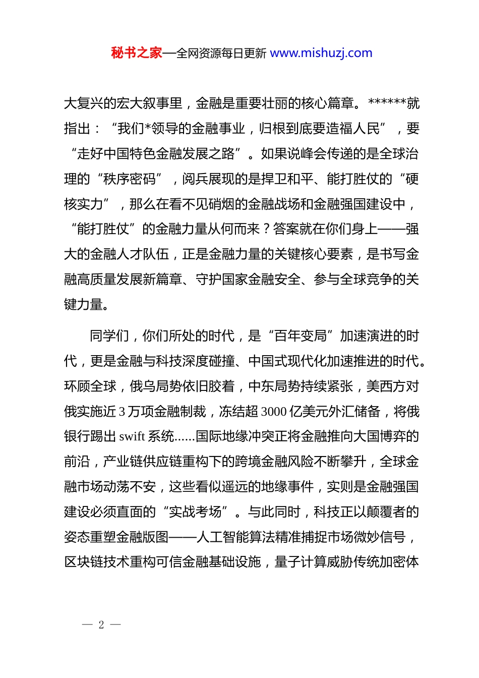 秘书之家—全网资源每日更新 www.mishuzj.com在 2025 级迎新大会上的讲话:做走好中国特色金融发展之路的南开金融人南开大学金融学院院长(2025 年 9 月 23 日)亲爱的 2025 级同学们,老师们:大家好!我首先代表金融学院全体师生,向你们致以最热烈的欢迎欢迎 2025 级新同学带着对未来的憧憬加入这个温暖的大家庭,特别要向首届技术转移项目的同学们道一声“热烈欢迎”!你们选择了南开金融,就是选择了一片浸润着百年荣光的热土,选择了一段与时代脉搏同频的成长旅程;而南开金融能成为你们青春里最灿烂的注脚,是我们无上的荣幸与郑重的承诺。今年,南开金融学院建院 10 周年,我参加了十载迎新,每一年都有新的感动,但今年的相聚尤为特殊。当上合峰会的“团结之声”传递中国智慧,当九三阅兵的“力量之音”彰显和平底气,在中国强盛的画卷在我们面前徐徐展开之时,我们更深刻地意识到:在推进中国式现代化建设,实现中华民族伟— 1 —秘书之家—全网资源每日更新 www.mishuzj.com大复兴的宏大叙事里,金融是重要壮丽的核心篇章。******就指出:“我们*领导的金融事业,归根到底要造福人民”,要“走好中国特色金融发展之路”。如果说峰会传递的是全球治理的“秩序密码”,阅兵展现的是捍卫和平、能打胜仗的“硬核实力”,那么在看不见硝烟的金融战场和金融强国建设中,“能打胜仗”的金融力量从何而来?答案就在你们身上——强大的金融人才队伍,正是金融力量的关键核心要素,是书写金融高质量发展新篇章、守护国家金融安全、参与全球竞争的关键力量。同学们,你们所处的时代,是“百年变局”加速演进的时代,更是金融与科技深度碰撞、中国式现代化加速推进的时代。环顾全球,俄乌局势依旧胶着,中东局势持续紧张,美西方对俄实施近 3 万项金融制裁,冻结超 3000 亿美元外汇储备,将俄银行踢出 swift 系统……国际地缘冲突正将金融推向大国博弈的前沿,产业链供应链重构下的跨境金融风险不断攀升,全球金融市场动荡不安,这些看似遥远的地缘事件,实则是金融强国建设必须直面的“实战考场”。与此同时,科技正以颠覆者的姿态重塑金融版图——人工智能算法精准捕捉市场微妙信号,区块链技术重构可信金融基础设施,量子计算威胁传统加密体— 2 —秘书之家—全网资源每日更新 www.mishuzj.com系,金融与科技的融合已从“附加题”变为“必答题”。在这种复杂严峻背景下,中国式现代化正在开启壮阔征程:人口规模巨大的现代化需要金融支持创新驱动、实现经济增长模式转型;共同富裕的现代化呼唤金融提升服务的普惠性、包容性;物质文明与精神文明协调发展的现代化要求金融坚守伦理底线;人与自然和谐共生的现代化亟待绿色金融创新赋能;和平发展的现代化需要重塑更加公平、安全的国际货币具体体系。这些交织的系统命题,对金融人才提出了更深刻的需求:既要能在地缘冲突中敢扛重担、善破难题、能为金融安全筑起防线的新时代金融实干之才,又要懂 ai 算法与区块链逻辑、驾驭金融科技前沿;既要胸怀家国、扎根中国土壤理解实体经济的真实需求,又要有国际视野参与全球金融治理;既要做“顶天”的理论研究者,更要做“立地”的实践破局者——这,正是我们南开金融师生的共同使命,也是你们需要回答的“时代问卷”。为了培养这样的复合型人才,南开金融学院始终胸怀“金融强国”,坚守“为*育人、为国育才”的初心,以服务国家战略需求为导向,全力推动“人文+科技+金融”深度融合的新金融人才培养体系。在本科教育中,我们新增金融科技专业,开设“智能金融领军人才创新班”本硕贯通项目,推出“智能— 3 —秘书之家—全网资源每日更新 www.mishuzj.com金融”、“金融合规与反洗钱监管”等“金融+科技+法学+x”交叉微专业;专业硕士项目聚焦金融科技、智能银行管理、科创金融等产教融合、交叉复合方向;在教育部和天津市政府大力支持下,今年全新设立的技术转移项目,充分发挥南开大学文、理、工、医综合学科优势,汇聚金融家、科学家、企业家共同授课,致力于构建“金融-科技-产业-管理”知识体系;博士培养也深度融入学校交叉学科建设之中。因为我...
