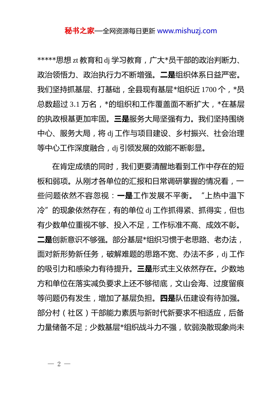 秘书之家—全网资源每日更新 www.mishuzj.com在 2025 年全县基层 dj 重点任务推进会上的讲话同志们:今天我们召开全县基层 dj 重点任务推进会,主要任务是深入学习贯彻全市基层 dj 重点任务调度会议精神,总结分析当前我县基层 dj 工作形势,研究部署下一阶段的重点任务。刚才,几个乡镇和县直单位的负责同志作了很好的发言,既谈了成绩,也指出了问题,听了很受启发。下面,结合大家的发言和当前工作实际,我讲三点意见。一、统一思想,认清形势,深刻把握新时代基层 dj 的极端重要性*的十八大以来,以***同志为核心的*中央高度重视基层 dj工作,作出了一系列重大决策部署,推动基层 dj 取得了历史性成就。近年来,全县各级*组织认真贯彻落实中央和省委、市委要求,牢固树立“抓好 dj 是最大政绩”的理念,履职尽责、担当作为,推动基层 dj 工作取得了新进展、新成效。主要体现在:一是理论武装持续深化。全县上下扎实开展学习贯彻*********— 1 —秘书之家—全网资源每日更新 www.mishuzj.com*****思想 zt 教育和 dj 学习教育,广大*员干部的政治判断力、政治领悟力、政治执行力不断增强。二是组织体系日益严密。我们坚持抓基层、打基础,全县现有基层*组织近 1700 个,*员总数超过 3.1 万名,*的组织和工作覆盖面不断扩大,*在基层的执政根基更加牢固。三是服务大局坚强有力。我们坚持围绕中心、服务大局,将 dj 工作与项目建设、乡村振兴、社会治理等中心工作深度融合,dj 引领发展的效能不断彰显。在肯定成绩的同时,我们更要清醒地看到工作中存在的短板和弱项。从刚才各单位的汇报和日常调研掌握的情况看,一些问题依然不容忽视:一是工作发展不平衡。“上热中温下冷”的现象依然存在,有的单位 dj 工作抓得紧、抓得实,但也有少数单位重视不够、投入不足,工作标准不高、成效不彰。二是创新意识不够强。部分基层*组织习惯于老思路、老办法,面对新形势新任务,破解难题的思路不宽、办法不多,dj 工作的吸引力和感染力有待提升。三是形式主义依然存在。少数地方和单位在落实减负要求上还不够彻底,文山会海、过度留痕等问题仍有发生,增加了基层负担。四是队伍建设有待加强。部分村(社区)干部能力素质与新时代新要求不相适应,后备力量储备不足;少数基层*组织战斗力不强,软弱涣散现象尚未— 2 —秘书之家—全网资源每日更新 www.mishuzj.com彻底根除。据初步摸排,我县仍有少数基层*组织处于软弱涣散状态,约占总数的 5%左右,这块“短板”必须下大力气补齐。同志们,基础不牢,地动山摇。我们必须深刻认识到,基层*组织是*的肌体的“神经末梢”,是*执政大厦的地基。截至 2025年初,我们*拥有超过 1 亿名*员和 525 万个基层*组织这是我们*的力量所在、优势所在。抓好基层 dj,既是巩固*的执政基础、实现*的执政使命的必然要求,也是推动*县高质量发展、实现高效能治理的现实需要。全县各级*组织和广大*员干部要进一步提高政治站位,切实增强抓好基层 dj 的责任感和使命感,将思想和行动统一到*中央决策部署和省市工作要求上来,以更高标准、更实举措推动我县基层 dj 工作全面进步、全面过硬。二、聚焦重点,攻坚克难,全面提升基层 dj 工作质量水平做好下一阶段的基层 dj 工作,必须坚持问题导向、目标导向、结果导向相统一,紧盯重点任务,集中力量攻坚。第一,要高标准、严要求,扎实有序做好村(社区)“两委”换届各项准备工作。村(社区)“两委”换届是明年全县基层政治生活中的一件大事,直接关系到未来五年我们基层政权的稳定和发展。这既是一项重大政治任务,也是对我们各级*组织驾驭复杂局面、组织动员群众能力的一次集中检验。各乡— 3 —秘书之家—全网资源每日更新 www.mishuzj.com镇*委要切实负起主体责任,把这项工作牢牢抓在手上,确保换届工作平稳、健康、有序进行。一要抓好摸底研判。要对全县所有村(社区)“两委”班子运行情况、干部队伍现状、后备力量储备、社情民意等进行一次全面深入的调查摸底,做到“一村一策、心中有数”。特别是对选情复杂的重点村、难点村,要提前介入、分析...