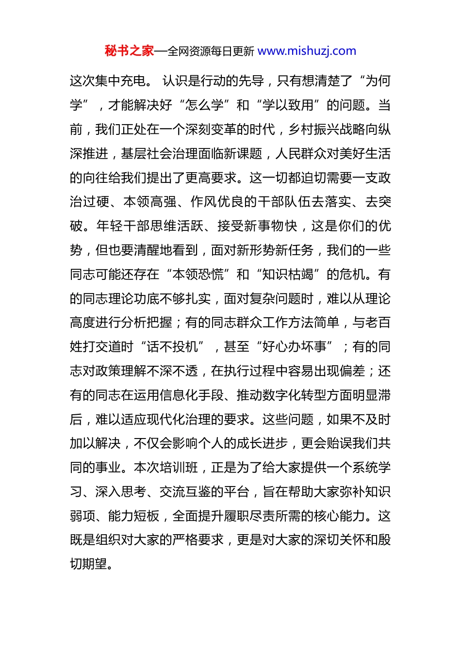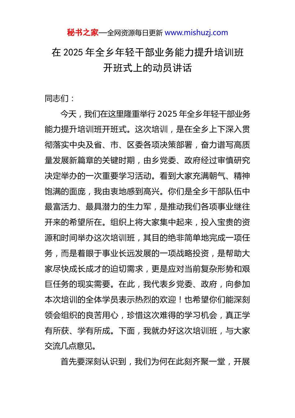秘书之家—全网资源每日更新 www.mishuzj.com在 2025 年全乡年轻干部业务能力提升培训班开班式上的动员讲话 同志们:今天,我们在这里隆重举行 2025 年全乡年轻干部业务能力提升培训班开班式。这次培训,是在全乡上下深入贯彻落实中央及省、市、区委各项决策部署,奋力谱写高质量发展新篇章的关键时期,由乡党委、政府经过审慎研究决定举办的一次重要学习活动。看到大家充满朝气、精神饱满的面庞,我由衷地感到高兴。你们是全乡干部队伍中最富活力、最具潜力的生力军,是推动我们各项事业继往开来的希望所在。组织上将大家集中起来,投入宝贵的资源和时间举办这次培训班,其目的绝非简单地完成一项任务,而是着眼于事业长远发展的一项战略投资,是帮助大家尽快成长成才的迫切需求,更是应对当前复杂形势和艰巨任务的现实需要。在此,我代表乡党委、政府,向参加本次培训的全体学员表示热烈的欢迎!也希望你们能深刻领会组织的良苦用心,珍惜这次难得的学习机会,真正学有所获、学有所成。下面,我就办好这次培训班,与大家交流几点意见。首先要深刻认识到,我们为何在此刻齐聚一堂,开展秘书之家—全网资源每日更新 www.mishuzj.com这次集中充电。 认识是行动的先导,只有想清楚了“为何学”,才能解决好“怎么学”和“学以致用”的问题。当前,我们正处在一个深刻变革的时代,乡村振兴战略向纵深推进,基层社会治理面临新课题,人民群众对美好生活的向往给我们提出了更高要求。这一切都迫切需要一支政治过硬、本领高强、作风优良的干部队伍去落实、去突破。年轻干部思维活跃、接受新事物快,这是你们的优势,但也要清醒地看到,面对新形势新任务,我们的一些同志可能还存在“本领恐慌”和“知识枯竭”的危机。有的同志理论功底不够扎实,面对复杂问题时,难以从理论高度进行分析把握;有的同志群众工作方法简单,与老百姓打交道时“话不投机”,甚至“好心办坏事”;有的同志对政策理解不深不透,在执行过程中容易出现偏差;还有的同志在运用信息化手段、推动数字化转型方面明显滞后,难以适应现代化治理的要求。这些问题,如果不及时加以解决,不仅会影响个人的成长进步,更会贻误我们共同的事业。本次培训班,正是为了给大家提供一个系统学习、深入思考、交流互鉴的平台,旨在帮助大家弥补知识弱项、能力短板,全面提升履职尽责所需的核心能力。这既是组织对大家的严格要求,更是对大家的深切关怀和殷切期望。秘书之家—全网资源每日更新 www.mishuzj.com其次要准确把握,这次培训我们将重点学习和提升哪些方面的能力。 本次培训的课程设置,是经过乡党委组织部和党校精心谋划的,紧密结合了乡域发展的实际和年轻干部的特点,力求做到内容丰富、重点突出、务实管用。希望大家能够紧紧围绕提升政治能力这个核心,深刻领会党的创新理论,不断提高政治判断力、政治领悟力、政治执行力,确保在任何时候、任何情况下都能做到立场坚定、方向明确。要着力提升服务群众的能力,大家身处基层一线,直接与老百姓打交道,能否赢得群众的信任和支持,是检验我们工作成效的试金石。我们将安排学习如何深入田间地头开展调查研究,如何用群众听得懂的语言宣传党的方针政策,如何依法依规、用心用情化解基层矛盾纠纷,真正成为群众的贴心人和主心骨。要着力提升推动发展的能力,发展是解决一切问题的基础和关键。大家要聚焦乡村振兴的产业兴旺、生态宜居、乡风文明、治理有效、生活富裕的总要求,学习如何谋划项目、引进资源、培育特色产业,学习如何运用市场化、法治化的方式推动经济工作,努力成为懂经济、会管理、善发展的行家里手。要着力提升应急处突的能力,基层工作千头万绪,突发事件时有发生。大家要通过学习,增强风险意识,树立底线思维,掌握在急难险重任务面前保持定力、有效掌控秘书之家—全网资源每日更新 www.mishuzj.com局面、精准化解风险的方法,做到“乱云飞渡仍从容”。要着力提升改革创新的能力,固步自封没有出路,敢于突破才能开创未来。希望大家通过学习,进一步解放思想,勇于打破思维定势和路径依赖,积极探索基层治理的新机制、新方法,特别是在运用数字...