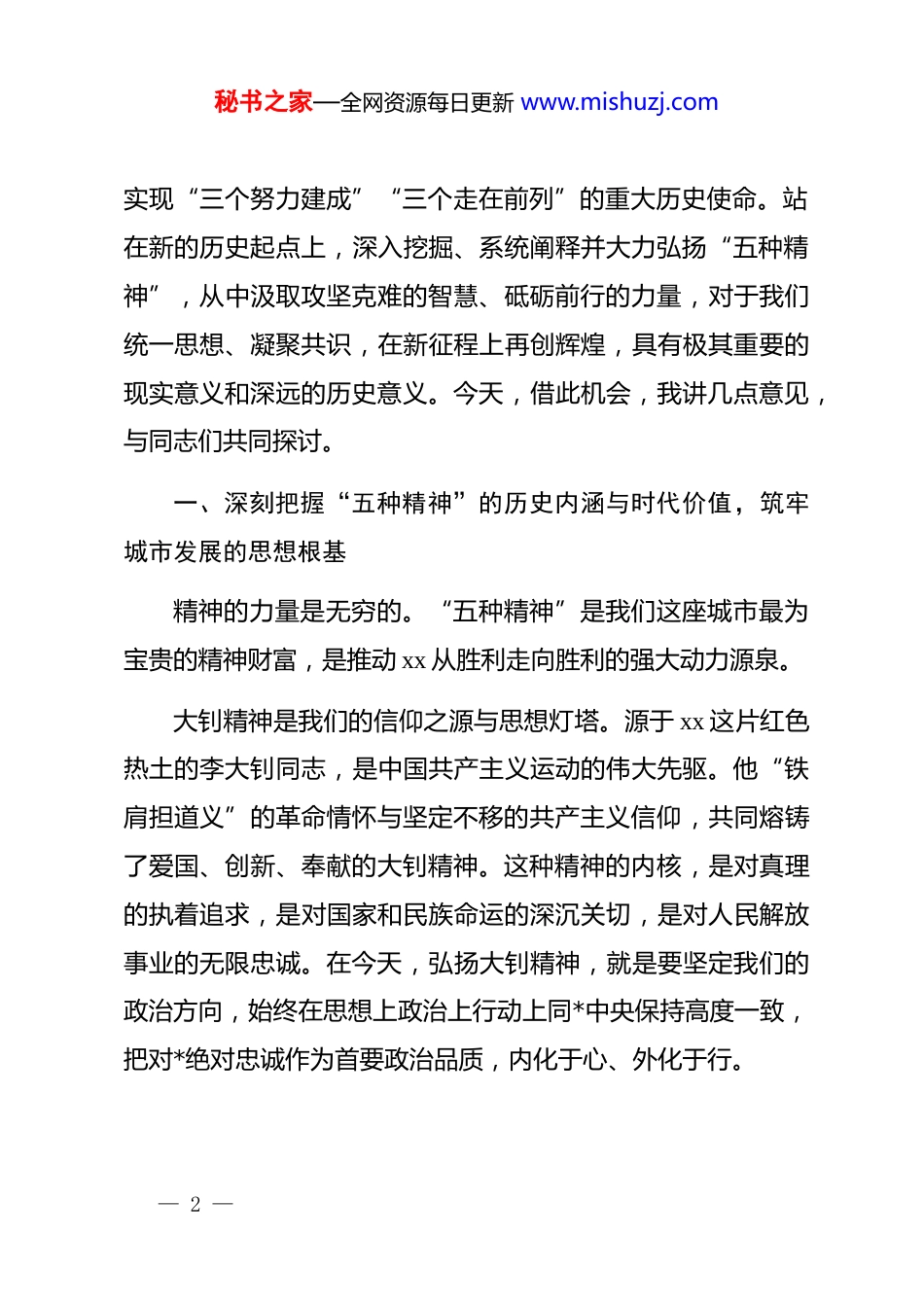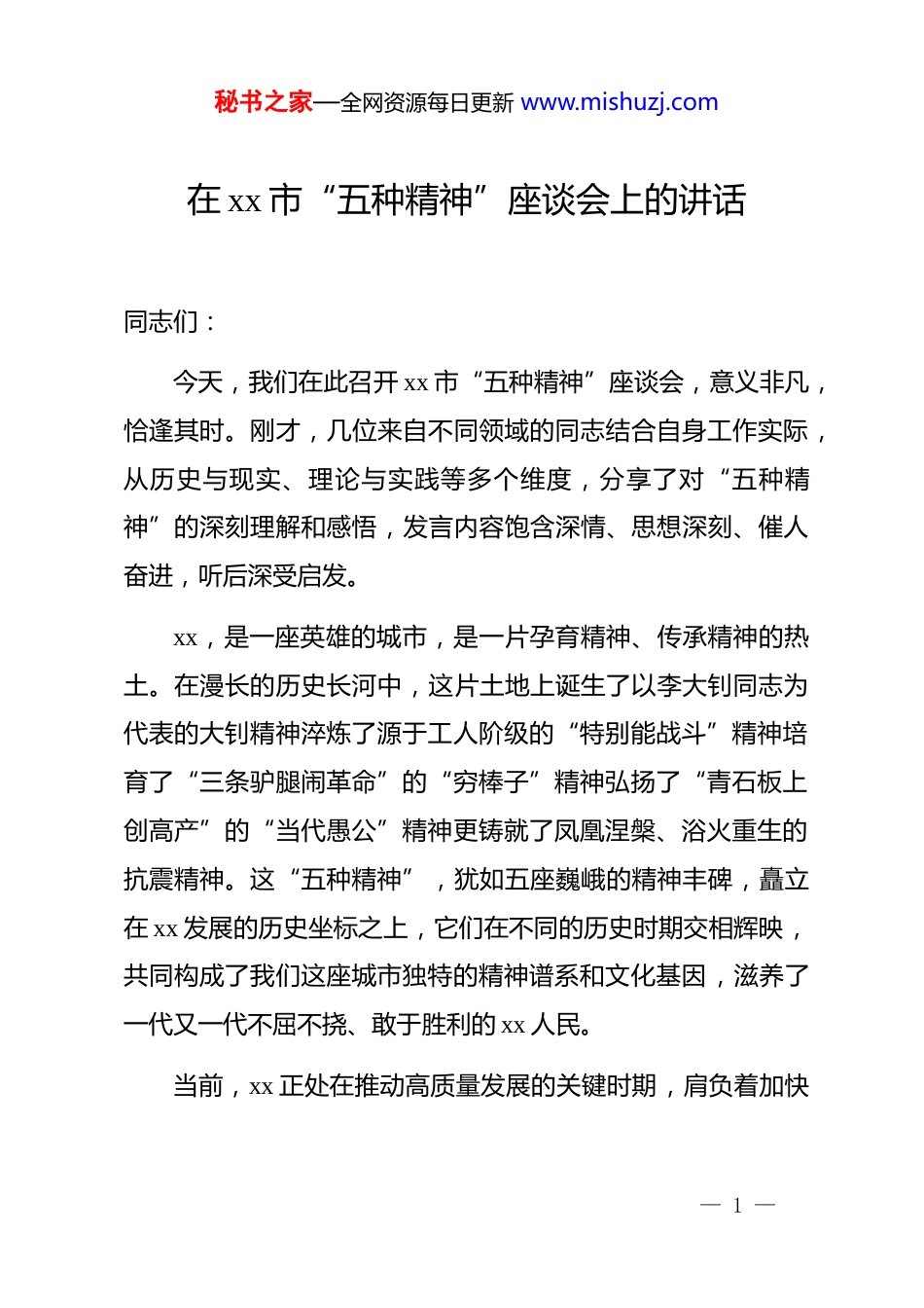 秘书之家—全网资源每日更新 www.mishuzj.com在 xx 市“五种精神”座谈会上的讲话同志们:今天,我们在此召开 xx 市“五种精神”座谈会,意义非凡,恰逢其时。刚才,几位来自不同领域的同志结合自身工作实际,从历史与现实、理论与实践等多个维度,分享了对“五种精神”的深刻理解和感悟,发言内容饱含深情、思想深刻、催人奋进,听后深受启发。xx,是一座英雄的城市,是一片孕育精神、传承精神的热土。在漫长的历史长河中,这片土地上诞生了以李大钊同志为代表的大钊精神淬炼了源于工人阶级的“特别能战斗”精神培育了“三条驴腿闹革命”的“穷棒子”精神弘扬了“青石板上创高产”的“当代愚公”精神更铸就了凤凰涅槃、浴火重生的抗震精神。这“五种精神”,犹如五座巍峨的精神丰碑,矗立在 xx 发展的历史坐标之上,它们在不同的历史时期交相辉映,共同构成了我们这座城市独特的精神谱系和文化基因,滋养了一代又一代不屈不挠、敢于胜利的 xx 人民。当前,xx 正处在推动高质量发展的关键时期,肩负着加快— 1 —秘书之家—全网资源每日更新 www.mishuzj.com实现“三个努力建成”“三个走在前列”的重大历史使命。站在新的历史起点上,深入挖掘、系统阐释并大力弘扬“五种精神”,从中汲取攻坚克难的智慧、砥砺前行的力量,对于我们统一思想、凝聚共识,在新征程上再创辉煌,具有极其重要的现实意义和深远的历史意义。今天,借此机会,我讲几点意见,与同志们共同探讨。一、深刻把握“五种精神”的历史内涵与时代价值,筑牢城市发展的思想根基精神的力量是无穷的。“五种精神”是我们这座城市最为宝贵的精神财富,是推动 xx 从胜利走向胜利的强大动力源泉。大钊精神是我们的信仰之源与思想灯塔。源于 xx 这片红色热土的李大钊同志,是中国共产主义运动的伟大先驱。他“铁肩担道义”的革命情怀与坚定不移的共产主义信仰,共同熔铸了爱国、创新、奉献的大钊精神。这种精神的内核,是对真理的执着追求,是对国家和民族命运的深沉关切,是对人民解放事业的无限忠诚。在今天,弘扬大钊精神,就是要坚定我们的政治方向,始终在思想上政治上行动上同*中央保持高度一致,把对*绝对忠诚作为首要政治品质,内化于心、外化于行。— 2 —秘书之家—全网资源每日更新 www.mishuzj.com“特别能战斗”精神是我们的力量之基与奋斗底色。这种精神诞生于百年前风起云涌的工人运动,开滦工人在反抗压迫、争取权益的斗争中,展现出“敢于斗争、敢于胜利”的大无畏气概。进入和平建设时期,它又转化为勇挑重担、争创一流的先锋精神。这种精神的本质,是面对困难不退缩、面对挑战不畏惧、面对任务冲锋在前的顽强意志和卓越执行力。在今天,弘扬“特别能战斗”精神,就是要锻造一支关键时刻拉得出、顶得上、打得赢的干部队伍,以永不懈怠的精神状态和一往无前的奋斗姿态,去破解发展难题、应对风险挑战。“穷棒子”精神和“当代愚公”精神是我们的创业之魂与实干坐标。上世纪五十年代,xx 市 xx 县的先辈们靠着“三条驴腿”的家底办起了合作社,创造了“整个国家的形象”;同样是在那片土地上,另一群先辈们在青石板上“万里千担一亩田”,创造了战天斗地的人间奇迹。这两种精神,集中体现了自力更生、艰苦创业的拼搏意志,体现了团结协作、勤俭办事的优良作风。它们告诉我们,任何伟大的事业都始于微末、成于实干。在今天,弘扬这两种精神,就是要激发全市上下的内生动力,坚持从实际出发,不好高骛远、不脱离实际,用勤劳的双手和踏实的脚步,一步一个脚印地把宏伟蓝图变为美好现— 3 —秘书之家—全网资源每日更新 www.mishuzj.com实。抗震精神是我们的重生之志与韧性之证。1976 年的那场特大地震,曾让这座城市满目疮痍。但在*的坚强领导和全国人民的无私援助下,英雄的 xx 人民以“公而忘私、患难与共、百折不挠、勇往直前”的抗震精神,在废墟上建立起一座更加雄伟壮丽的新城。这种精神,是中华民族面对灾难时坚韧不拔、自强不息民族品格的生动写照。在今天,弘扬抗震精神,就是要增强我们的忧患意识和底线思维,不仅要具备应对自然灾害的强大能力,更要具备防范化解经...