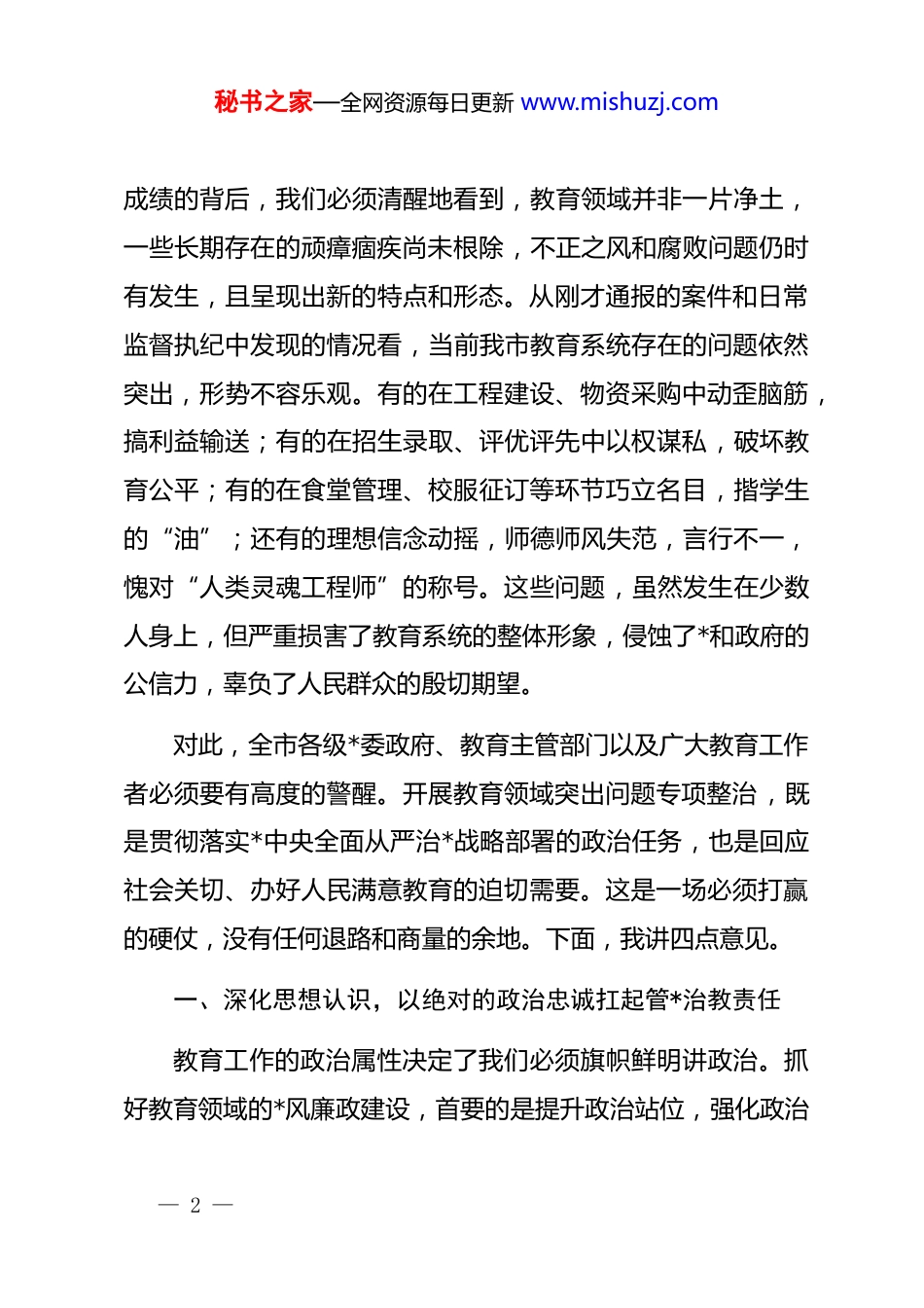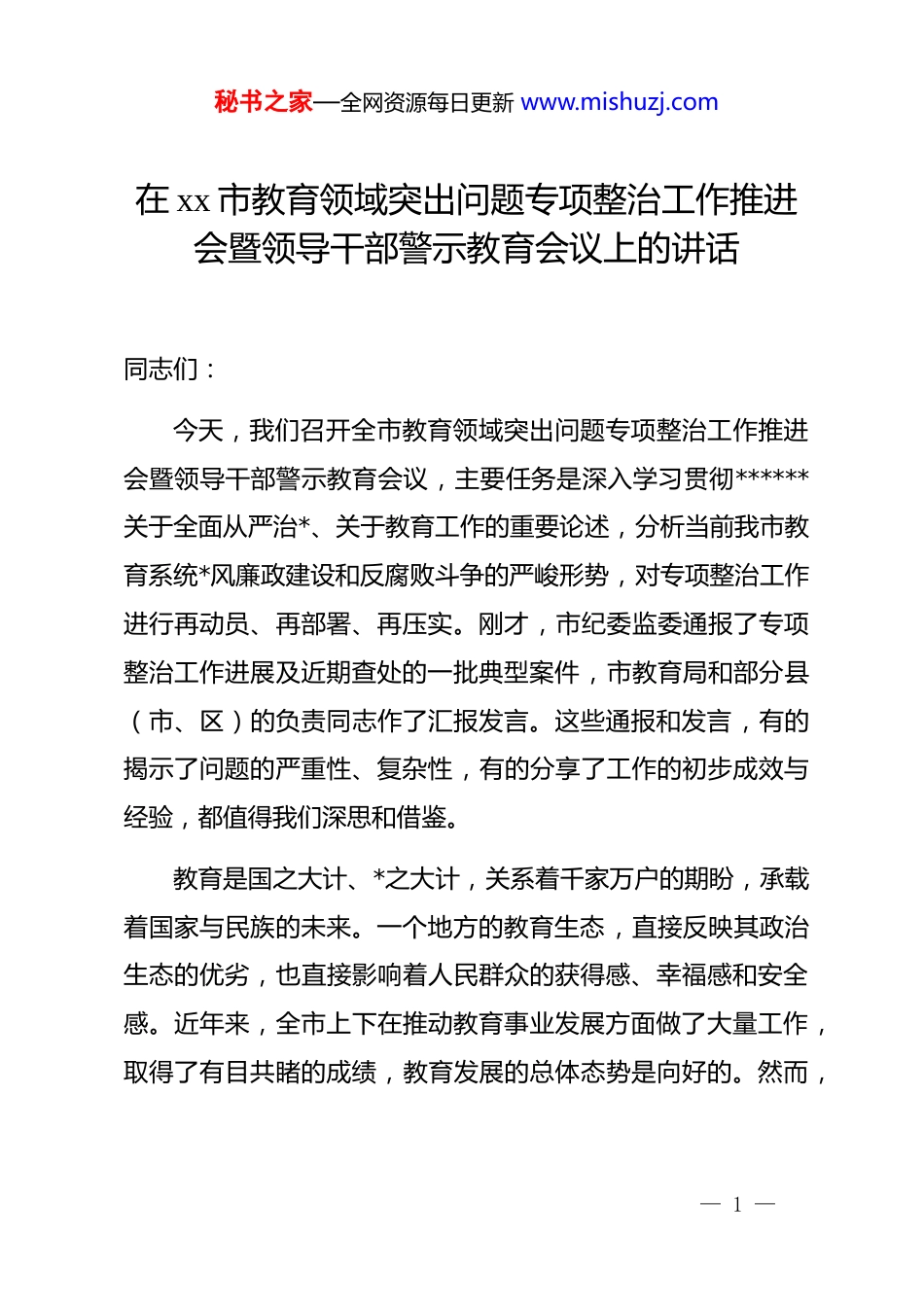 秘书之家—全网资源每日更新 www.mishuzj.com在 xx 市教育领域突出问题专项整治工作推进会暨领导干部警示教育会议上的讲话同志们:今天,我们召开全市教育领域突出问题专项整治工作推进会暨领导干部警示教育会议,主要任务是深入学习贯彻******关于全面从严治*、关于教育工作的重要论述,分析当前我市教育系统*风廉政建设和反腐败斗争的严峻形势,对专项整治工作进行再动员、再部署、再压实。刚才,市纪委监委通报了专项整治工作进展及近期查处的一批典型案件,市教育局和部分县(市、区)的负责同志作了汇报发言。这些通报和发言,有的揭示了问题的严重性、复杂性,有的分享了工作的初步成效与经验,都值得我们深思和借鉴。教育是国之大计、*之大计,关系着千家万户的期盼,承载着国家与民族的未来。一个地方的教育生态,直接反映其政治生态的优劣,也直接影响着人民群众的获得感、幸福感和安全感。近年来,全市上下在推动教育事业发展方面做了大量工作,取得了有目共睹的成绩,教育发展的总体态势是向好的。然而,— 1 —秘书之家—全网资源每日更新 www.mishuzj.com成绩的背后,我们必须清醒地看到,教育领域并非一片净土,一些长期存在的顽瘴痼疾尚未根除,不正之风和腐败问题仍时有发生,且呈现出新的特点和形态。从刚才通报的案件和日常监督执纪中发现的情况看,当前我市教育系统存在的问题依然突出,形势不容乐观。有的在工程建设、物资采购中动歪脑筋,搞利益输送;有的在招生录取、评优评先中以权谋私,破坏教育公平;有的在食堂管理、校服征订等环节巧立名目,揩学生的“油”;还有的理想信念动摇,师德师风失范,言行不一,愧对“人类灵魂工程师”的称号。这些问题,虽然发生在少数人身上,但严重损害了教育系统的整体形象,侵蚀了*和政府的公信力,辜负了人民群众的殷切期望。对此,全市各级*委政府、教育主管部门以及广大教育工作者必须要有高度的警醒。开展教育领域突出问题专项整治,既是贯彻落实*中央全面从严治*战略部署的政治任务,也是回应社会关切、办好人民满意教育的迫切需要。这是一场必须打赢的硬仗,没有任何退路和商量的余地。下面,我讲四点意见。一、深化思想认识,以绝对的政治忠诚扛起管*治教责任教育工作的政治属性决定了我们必须旗帜鲜明讲政治。抓好教育领域的*风廉政建设,首要的是提升政治站位,强化政治— 2 —秘书之家—全网资源每日更新 www.mishuzj.com担当。第一,必须深刻领悟专项整治的政治内涵。******反复强调,“江山就是人民,人民就是江山。”教育公平是社会公平的重要基石。教育领域的任何腐败和不正之风,侵害的都是群众最关心、最直接、最现实的利益,动摇的是*的执政根基。各级各部门要从坚定拥护“两个确立”、坚决做到“两个维护”的政治高度,深刻认识开展此次专项整治的极端重要性和紧迫性。这不仅是一项业务工作,更是一项严肃的政治任务。检验整治成效的标尺,不仅仅是查处了多少案件、挽回了多少损失,更重要的是看教育系统的政治生态是否得到根本性净化,看人民群众对教育的满意度是否得到实质性提升,看广大师生和家长的获得感是否可感知、可评判、可检验。第二,必须全面压实管*治教的主体责任。责任不落实,一切都等于零。教育主管部门和各级各类学校的*组织是本单位全面从严治*的领导者、执行者、推动者,必须坚决扛起主体责任。特别是各单位的“一把手”,作为第一责任人,要真正把责任放在心上、抓在手上、扛在肩上。要敢抓敢管、严抓严管,不能当“老好人”,更不能对眼皮子底下的问题视而不见、听之任之。要加强班子自身建设,严格执行民主集中制和“三重一— 3 —秘书之家—全网资源每日更新 www.mishuzj.com大”决策制度,确保权力在阳光下运行。要通过常态化的谈心谈话、述责述廉、民主生活会等方式,及时发现和纠正班子成员及下属的苗头性、倾向性问题,做到抓早抓小、防微杜渐。要坚持 dj 工作和业务工作同谋划、同部署、同推进、同考核,以高质量 dj 引领教育事业高质量发展。第三,必须切实强化权力运行的监督制约。信任不能代替监督,没有监督的权力必然导致腐败。教育系统掌握着大量...