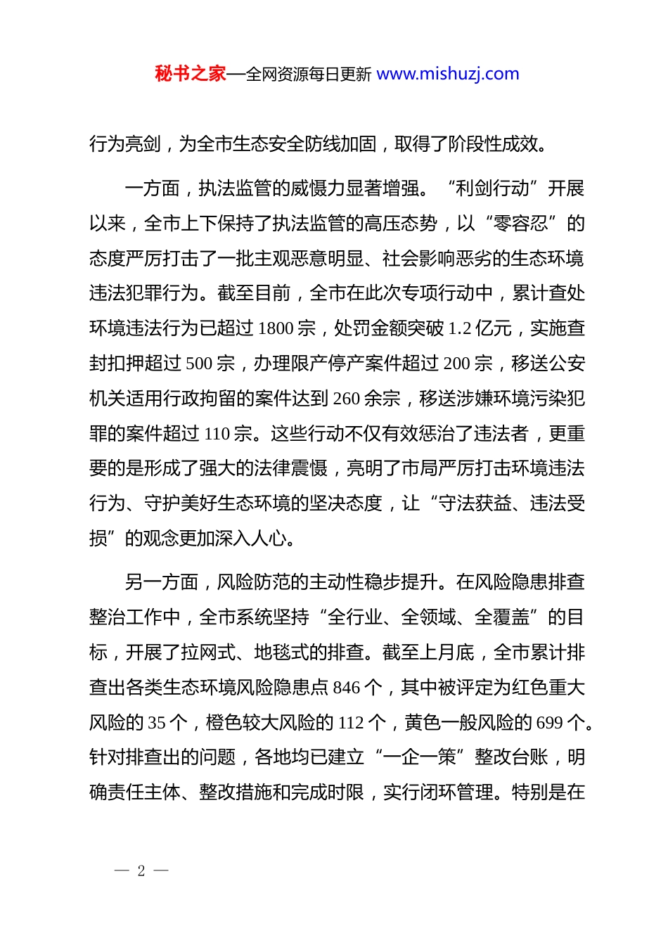 秘书之家—全网资源每日更新 www.mishuzj.com在 xx 市生态环境局全市生态环境违法行为查处“利剑行动”推进会暨风险隐患排查整治工作调度会上的讲话同志们:今天,我们在这里召开全市生态环境违法行为查处“利剑行动”推进会暨风险隐患排查整治工作调度会,主要任务是总结前一阶段的工作成效,分析当前面临的严峻形势,研究部署下一阶段的重点任务。这次会议既是一次回顾总结会,更是一次加压奋进的动员部署会。刚才,听取了各县(市、区)的汇报,总体上看,大家的工作是有力的、成效是显著的。下面,我讲几点意见。一、肯定成绩正视不足清醒认识当前生态环境保护的极端重要性生态环境是关系民生的重大社会问题,也是关系城市可持续发展的根本大计。今年以来,全市生态环境系统坚决贯彻落实市委、市政府的决策部署,以“利剑行动”的持续深入和风险隐患排查整治的扎实开展为两大抓手,向各类生态环境违法— 1 —秘书之家—全网资源每日更新 www.mishuzj.com行为亮剑,为全市生态安全防线加固,取得了阶段性成效。一方面,执法监管的威慑力显著增强。“利剑行动”开展以来,全市上下保持了执法监管的高压态势,以“零容忍”的态度严厉打击了一批主观恶意明显、社会影响恶劣的生态环境违法犯罪行为。截至目前,全市在此次专项行动中,累计查处环境违法行为已超过 1800 宗,处罚金额突破 1.2 亿元,实施查封扣押超过 500 宗,办理限产停产案件超过 200 宗,移送公安机关适用行政拘留的案件达到 260 余宗,移送涉嫌环境污染犯罪的案件超过 110 宗。这些行动不仅有效惩治了违法者,更重要的是形成了强大的法律震慑,亮明了市局严厉打击环境违法行为、守护美好生态环境的坚决态度,让“守法获益、违法受损”的观念更加深入人心。另一方面,风险防范的主动性稳步提升。在风险隐患排查整治工作中,全市系统坚持“全行业、全领域、全覆盖”的目标,开展了拉网式、地毯式的排查。截至上月底,全市累计排查出各类生态环境风险隐患点 846 个,其中被评定为红色重大风险的 35 个,橙色较大风险的 112 个,黄色一般风险的 699 个。针对排查出的问题,各地均已建立“一企一策”整改台账,明确责任主体、整改措施和完成时限,实行闭环管理。特别是在— 2 —秘书之家—全网资源每日更新 www.mishuzj.com对化工、重金属、危险废物、集中式饮用水源地等高风险领域的排查中,发现并督促整改了一批长期存在的管理漏洞,例如部分企业环保设施运行记录不完整、应急预案可操作性不强等问题,推动了环境治理从被动应对向主动预防的深刻转变。在肯定成绩的同时,我们更要清醒地看到,当前全市生态环境保护的形势依然严峻复杂,工作中的短板和弱项不容忽视。一是部分区域和行业的顽瘴痼疾依然存在。一些传统的高污染行业,违法排污问题屡禁不止,有的甚至玩起了“躲猫猫”的游戏,手段更加隐蔽,查处难度更大。二是风险隐患的存量和增量交织。一些历史遗留的环境问题尚未得到根本解决,同时,随着新产业、新业态的发展,新的环境风险点也在不断出现,对我们的监管能力提出了新的挑战。三是工作推进不平衡的问题较为突出。从刚才的汇报和日常调度情况看,部分县(市、区)在案件查办数量、处罚金额、风险排查深度上与其他地区存在明显差距,存在“上热下冷”、压力传导层层递减的现象。四是部分干部的系统思维和治本能力有待加强。在查处案件时,满足于就事论事,未能深挖违法行为背后的行业性、根本性问题,未能有效铲除非法产业的污染链条,导致一些问题反复出现,陷入“污染—治理—再污染”的怪圈。对于这些问题,我— 3 —秘书之家—全网资源每日更新 www.mishuzj.com们必须高度重视,采取更加有力的措施,切实加以解决。二、深化利剑行动提升执法精度以雷霆之势坚决维护生态环境法治权威法律的生命力在于实施,法律的权威也在于实施。“利剑行动”是法律赋予我们手中的一把利剑,必须敢用、善用、常用。下一阶段,全市生态环境执法工作要继续保持力度不减、尺度不松,在“严、准、狠”上下功夫,确保利剑高悬、震慑常在。第一,要聚焦重点领域,实施精准打击。执法资源...
