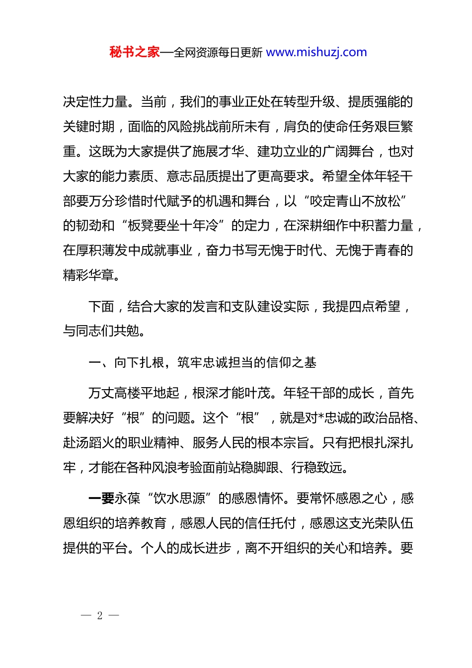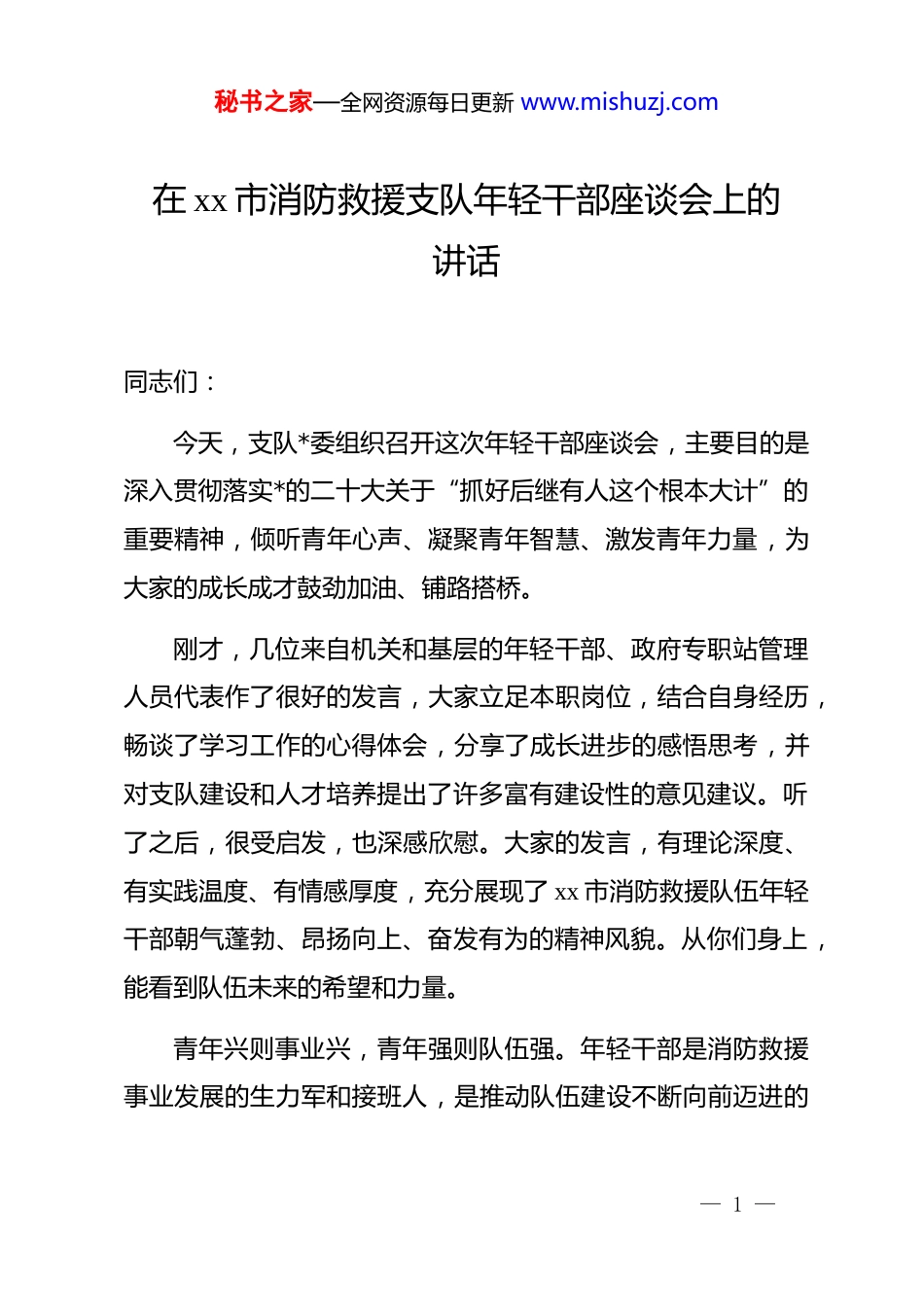 秘书之家—全网资源每日更新 www.mishuzj.com在 xx 市消防救援支队年轻干部座谈会上的讲话同志们:今天,支队*委组织召开这次年轻干部座谈会,主要目的是深入贯彻落实*的二十大关于“抓好后继有人这个根本大计”的重要精神,倾听青年心声、凝聚青年智慧、激发青年力量,为大家的成长成才鼓劲加油、铺路搭桥。刚才,几位来自机关和基层的年轻干部、政府专职站管理人员代表作了很好的发言,大家立足本职岗位,结合自身经历,畅谈了学习工作的心得体会,分享了成长进步的感悟思考,并对支队建设和人才培养提出了许多富有建设性的意见建议。听了之后,很受启发,也深感欣慰。大家的发言,有理论深度、有实践温度、有情感厚度,充分展现了 xx 市消防救援队伍年轻干部朝气蓬勃、昂扬向上、奋发有为的精神风貌。从你们身上,能看到队伍未来的希望和力量。青年兴则事业兴,青年强则队伍强。年轻干部是消防救援事业发展的生力军和接班人,是推动队伍建设不断向前迈进的— 1 —秘书之家—全网资源每日更新 www.mishuzj.com决定性力量。当前,我们的事业正处在转型升级、提质强能的关键时期,面临的风险挑战前所未有,肩负的使命任务艰巨繁重。这既为大家提供了施展才华、建功立业的广阔舞台,也对大家的能力素质、意志品质提出了更高要求。希望全体年轻干部要万分珍惜时代赋予的机遇和舞台,以“咬定青山不放松”的韧劲和“板凳要坐十年冷”的定力,在深耕细作中积蓄力量,在厚积薄发中成就事业,奋力书写无愧于时代、无愧于青春的精彩华章。下面,结合大家的发言和支队建设实际,我提四点希望,与同志们共勉。一、向下扎根,筑牢忠诚担当的信仰之基万丈高楼平地起,根深才能叶茂。年轻干部的成长,首先要解决好“根”的问题。这个“根”,就是对*忠诚的政治品格、赴汤蹈火的职业精神、服务人民的根本宗旨。只有把根扎深扎牢,才能在各种风浪考验面前站稳脚跟、行稳致远。一要永葆“饮水思源”的感恩情怀。要常怀感恩之心,感恩组织的培养教育,感恩人民的信任托付,感恩这支光荣队伍提供的平台。个人的成长进步,离不开组织的关心和培养。要— 2 —秘书之家—全网资源每日更新 www.mishuzj.com始终把组织的信任和重托作为前进的动力,把个人的理想追求融入到消防救援事业的宏伟蓝图中,以实际行动回报组织的培养。要时刻牢记,手中的权力、肩上的责任都来自于人民,必须始终把人民放在心中最高位置,在每一次警铃骤响的逆行中、在每一次赴汤蹈火的救援中,践行“人民消防为人民”的庄严承诺。二要永怀“如履薄冰”的敬畏情怀。心存敬畏,方能行有所止。要敬畏使命,深刻认识到消防救援工作“养兵千日、用兵千日”的特殊性,每一次出动都关系到人民群众的生命财产安全,容不得丝毫懈怠和马虎。要敬畏法纪,严格遵守国家的法律法规和队伍的条令条例,把纪律规矩挺在前面,做到知敬畏、存戒惧、守底线。要敬畏生命,无论是对待救援对象,还是对待身边的战友,都要以高度的责任心和严谨的科学态度,确保救援行动的安全高效。三要永怀“视若归家”的融入情怀。队伍是家,战友是亲人。要主动融入集体,把个人发展与队伍建设紧密相连,在集体中找准定位、发挥作用。去年以来,全市队伍共接处警 1685起,营救疏散群众 313 人,抢救保护财产价值超过 1882 万元。这些成绩的取得,不是靠某一个人的单打独斗,而是全体指战— 3 —秘书之家—全网资源每日更新 www.mishuzj.com员团结协作、共同奋斗的结果。特别是在处置 xx 小区“1·18”高层住宅火灾、xx 高速“9·4”危化品运输车辆侧翻泄漏事故等急难险重任务中,正是依靠集体主义精神和无间的团队配合,才一次次化险为夷,守护了一方平安。希望大家在红色教育中淬炼思想,在破解难题中磨砺本领,在应对挑战中锤炼意志,努力成长为让组织放心、让人民满意的行家里手。二、向上生长,锻造能打胜仗的过硬本领消防救援是一门科学,也是一门艺术,专业性、实战性极强。新时代的消防救援任务呈现出多样化、复杂化的新特点,对干部的专业素养和综合能力提出了前所未有的挑战。只有不断向上生长,练就过硬本领,才能在关键时刻拉得出、...