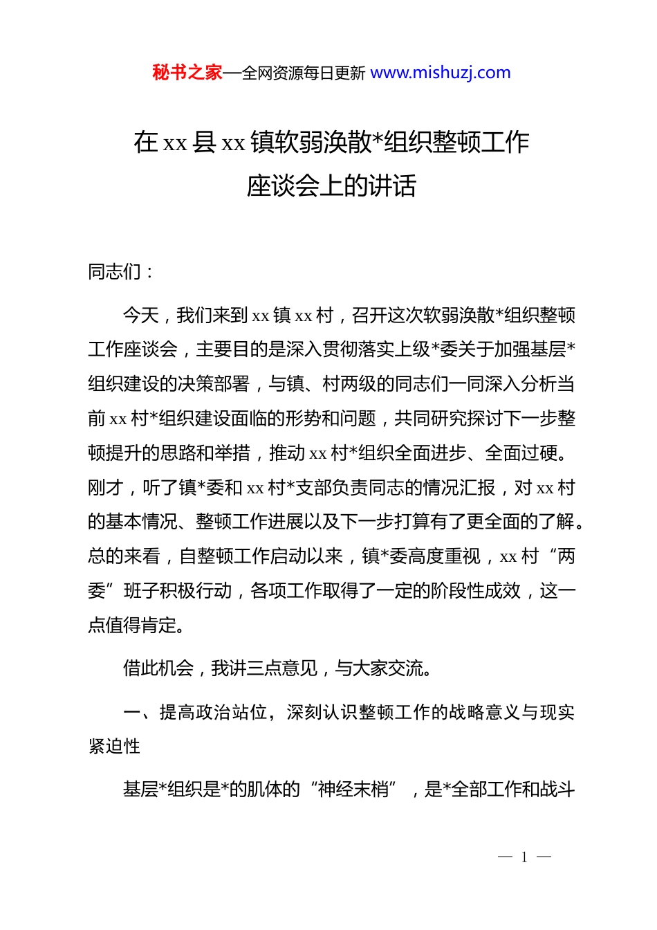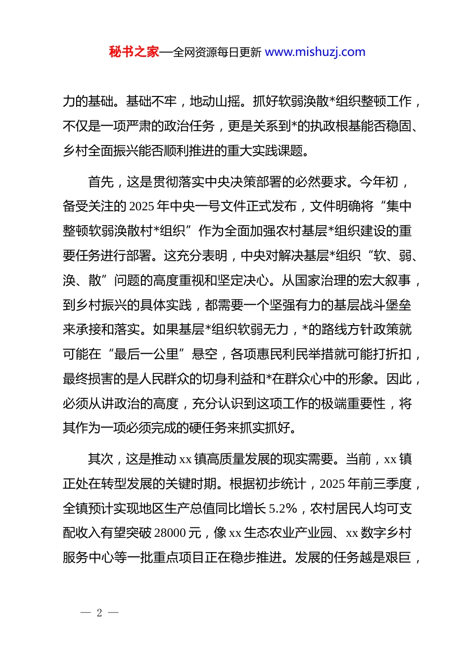 秘书之家—全网资源每日更新 www.mishuzj.com在 xx 县 xx 镇软弱涣散*组织整顿工作座谈会上的讲话同志们:今天,我们来到 xx 镇 xx 村,召开这次软弱涣散*组织整顿工作座谈会,主要目的是深入贯彻落实上级*委关于加强基层*组织建设的决策部署,与镇、村两级的同志们一同深入分析当前 xx 村*组织建设面临的形势和问题,共同研究探讨下一步整顿提升的思路和举措,推动 xx 村*组织全面进步、全面过硬。刚才,听了镇*委和 xx 村*支部负责同志的情况汇报,对 xx 村的基本情况、整顿工作进展以及下一步打算有了更全面的了解。总的来看,自整顿工作启动以来,镇*委高度重视,xx 村“两委”班子积极行动,各项工作取得了一定的阶段性成效,这一点值得肯定。借此机会,我讲三点意见,与大家交流。一、提高政治站位,深刻认识整顿工作的战略意义与现实紧迫性基层*组织是*的肌体的“神经末梢”,是*全部工作和战斗— 1 —秘书之家—全网资源每日更新 www.mishuzj.com力的基础。基础不牢,地动山摇。抓好软弱涣散*组织整顿工作,不仅是一项严肃的政治任务,更是关系到*的执政根基能否稳固、乡村全面振兴能否顺利推进的重大实践课题。首先,这是贯彻落实中央决策部署的必然要求。今年初,备受关注的 2025 年中央一号文件正式发布,文件明确将“集中整顿软弱涣散村*组织”作为全面加强农村基层*组织建设的重要任务进行部署。这充分表明,中央对解决基层*组织“软、弱、涣、散”问题的高度重视和坚定决心。从国家治理的宏大叙事,到乡村振兴的具体实践,都需要一个坚强有力的基层战斗堡垒来承接和落实。如果基层*组织软弱无力,*的路线方针政策就可能在“最后一公里”悬空,各项惠民利民举措就可能打折扣,最终损害的是人民群众的切身利益和*在群众心中的形象。因此,必须从讲政治的高度,充分认识到这项工作的极端重要性,将其作为一项必须完成的硬任务来抓实抓好。其次,这是推动 xx 镇高质量发展的现实需要。当前,xx 镇正处在转型发展的关键时期。根据初步统计,2025 年前三季度,全镇预计实现地区生产总值同比增长 5.2%,农村居民人均可支配收入有望突破 28000 元,像 xx 生态农业产业园、xx 数字乡村服务中心等一批重点项目正在稳步推进。发展的任务越是艰巨,— 2 —秘书之家—全网资源每日更新 www.mishuzj.com越需要坚强的组织保障。xx 村作为 xx 镇的重要组成部分,其发展状况直接关系到全镇的发展大局。一个软弱涣散的*组织,难以有效带领群众发展经济、改善民生,甚至可能成为发展的“绊脚石”。只有把 xx 村*组织建设成为能够团结带领群众攻坚克难的战斗堡垒,才能将发展蓝图转化为现实成果,让发展的红利更多更公平地惠及全体村民。最后,必须正确看待“软弱涣散”这顶帽子。我要特别强调,将一个*组织列为软弱涣散,不是对过去工作的全盘否定,更不是要打倒哪一批干部。它更像是一份精准的“体检报告”和“诊断书”,帮助我们清醒地看到自身存在的短板和弱项;它也是一个有力的“助推器”,为我们争取上级支持、集中力量解决问题提供了宝贵的契机。所以,xx 村的全体*员干部要放下思想包袱,摒弃“等、靠、要”的消极心态和“不光彩”的错误认识,把这次整顿作为一次刮骨疗毒、强身健体的机会,作为一次提升能力、改进作风的考验,以积极主动的姿态投入到整顿提升工作中来。二、聚焦关键环节,以重点突破带动*组织建设整体提升整顿工作千头万绪,必须坚持问题导向,抓住主要矛盾和矛盾的主要方面,精准施策、靶向发力。从刚才的汇报和前期— 3 —秘书之家—全网资源每日更新 www.mishuzj.com的调研来看,xx 村的整顿工作要取得实质性突破,必须在以下三个方面下足功夫。第一,聚焦班子建设,着力锻造担当作为的“领头雁”方阵。“村看村,户看户,群众看干部”。一个村庄的发展状况,很大程度上取决于村“两委”班子这个“火车头”的牵引力。班子强不强,关键看“头雁”。一是要强化支部书记的第一责任。村*支部书记作为班子的“班长”,是第一责任人,必须牢固树立“抓好 dj 是本职、不抓 dj 是失职、抓不好 dj 是不称职”的...