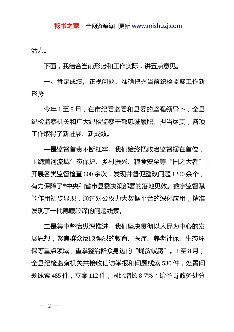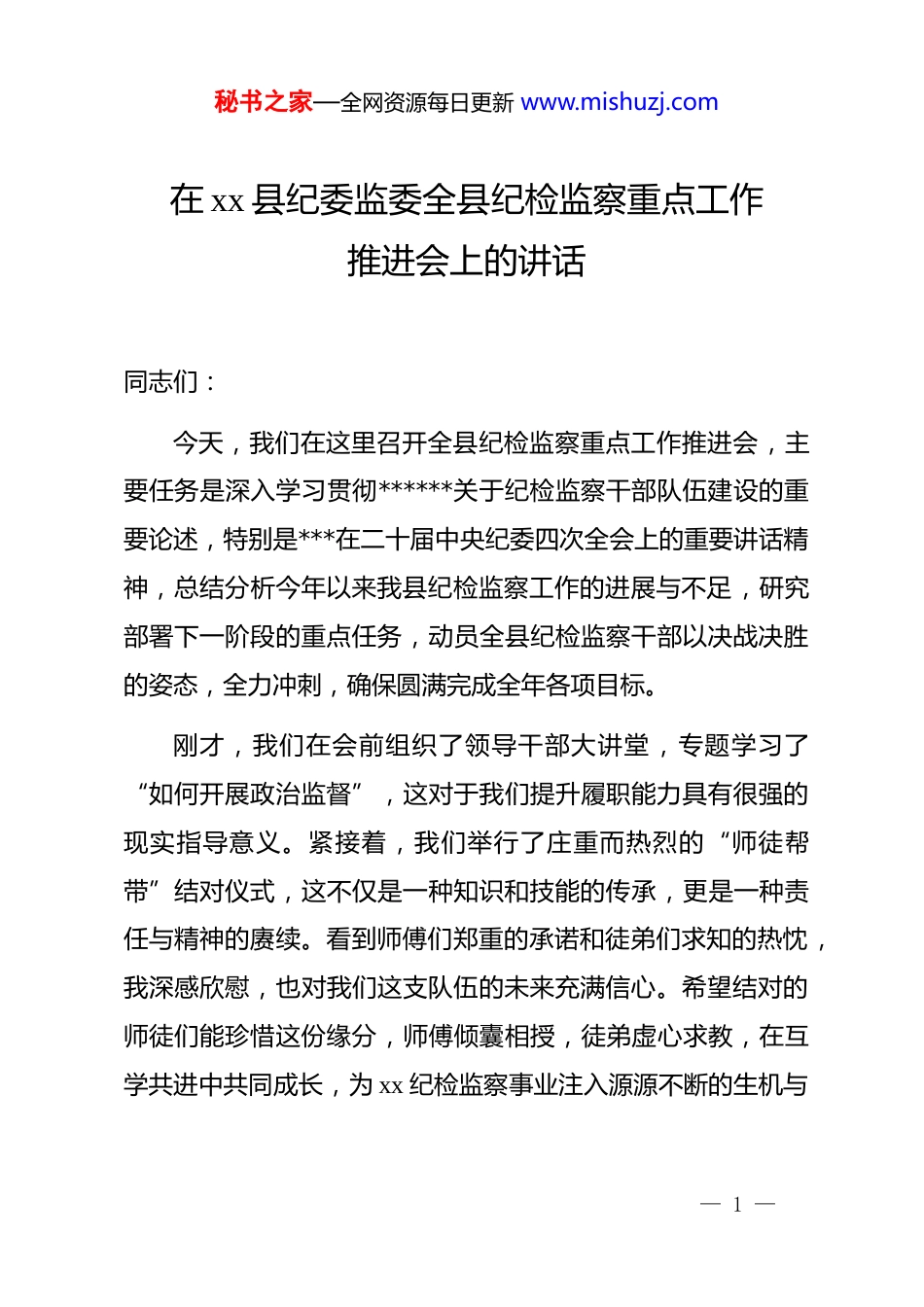 秘书之家—全网资源每日更新 www.mishuzj.com在 xx 县纪委监委全县纪检监察重点工作推进会上的讲话同志们:今天,我们在这里召开全县纪检监察重点工作推进会,主要任务是深入学习贯彻******关于纪检监察干部队伍建设的重要论述,特别是***在二十届中央纪委四次全会上的重要讲话精神,总结分析今年以来我县纪检监察工作的进展与不足,研究部署下一阶段的重点任务,动员全县纪检监察干部以决战决胜的姿态,全力冲刺,确保圆满完成全年各项目标。刚才,我们在会前组织了领导干部大讲堂,专题学习了“如何开展政治监督”,这对于我们提升履职能力具有很强的现实指导意义。紧接着,我们举行了庄重而热烈的“师徒帮带”结对仪式,这不仅是一种知识和技能的传承,更是一种责任与精神的赓续。看到师傅们郑重的承诺和徒弟们求知的热忱,我深感欣慰,也对我们这支队伍的未来充满信心。希望结对的师徒们能珍惜这份缘分,师傅倾囊相授,徒弟虚心求教,在互学共进中共同成长,为 xx 纪检监察事业注入源源不断的生机与— 1 —秘书之家—全网资源每日更新 www.mishuzj.com活力。下面,我结合当前形势和工作实际,讲五点意见。一、肯定成绩,正视问题,准确把握当前纪检监察工作新形势今年 1 至 8 月,在市纪委监委和县委的坚强领导下,全县纪检监察机关和广大纪检监察干部忠诚履职、担当尽责,各项工作取得了新进展、新成效。一是监督首责不断扛牢。我们始终把政治监督摆在首位,围绕黄河流域生态保护、乡村振兴、粮食安全等“国之大者”,开展各类监督检查 600 余次,发现并督促整改问题 1200 余个,有力保障了*中央和省市县委决策部署的落地见效。数字监督赋能作用初步显现,通过对公权力大数据平台的深化应用,精准发现了一批隐藏较深的问题线索。二是集中整治纵深推进。我们坚决贯彻以人民为中心的发展思想,聚焦群众反映强烈的教育、医疗、养老社保、生态环保等重点领域,重拳整治群众身边的“蝇贪蚁腐”。1 至 8 月,全县纪检监察机关共接收信访举报和问题线索 530 件,处置问题线索 485 件,立案 112 件,同比增长 8.7%;给予 dj 政务处分— 2 —秘书之家—全网资源每日更新 www.mishuzj.com135 人,同比增长 10.6%;移送司法机关 8 人。其中,在集中整治中立案查处问题 45 个,处理 68 人,追缴违纪违法资金 380余万元,人民群众的获得感、幸福感、安全感得到切实提升。三是“三化”建设落地见效。我们持续深化纪检监察工作规范化、法治化、正规化建设。办案设施标准化水平进一步提升,为安全文明办案提供了坚实保障。工作流程更加规范,从线索处置到案件审理,每一个环节都严格遵循制度规定。干部队伍专业能力通过系列培训和实战练兵得到增强,“三化”建设的成果正逐步转化为推动工作高质量发展的强大动力。四是作风建设持续深化。我们巩固拓展 zt 教育成果,驰而不息纠治“四风”。通过明察暗访、专项检查等方式,严肃查处了一批违规吃喝、违规收送礼品礼金等顶风违纪问题。同时,大力弘扬新风正气,深入开展纪律教育,积极推进“清廉 xx”建设,全县风清气正的政治生态持续向好。在肯定成绩的同时,我们更要清醒地看到工作中存在的短板和不足,这些问题如果不能及时解决,将严重制约我县纪检监察工作的高质量发展。主要表现在:一是攻坚克难的韧劲有所松懈。部分同志面对繁重任务和复杂案件,存在“歇歇脚、缓口气”的思想,一抓到底、久久为功的钉钉子精神有所弱化。— 3 —秘书之家—全网资源每日更新 www.mishuzj.com二是工作统筹的系统性有待加强。监督检查、审查调查、巡察监督、宣传教育等各项职能的贯通协同还不够顺畅,力量整合、成果共享的“一盘棋”格局尚未完全形成。三是案件查办的质效仍需提升。有的案件办理满足于“查结了事”,在深挖彻查、追根溯源上下的功夫不够;精准运用“四种形态”特别是第一、第二种形态的能力还有待提高,案件质量的“精品意识”树得不牢。四是队伍建设的标准还需从严。少数干部斗争精神不足,存在不愿监督、不敢碰硬的“老好人”思想;个别干部业务不精、本领恐慌的问题依然突出。这些问题,...