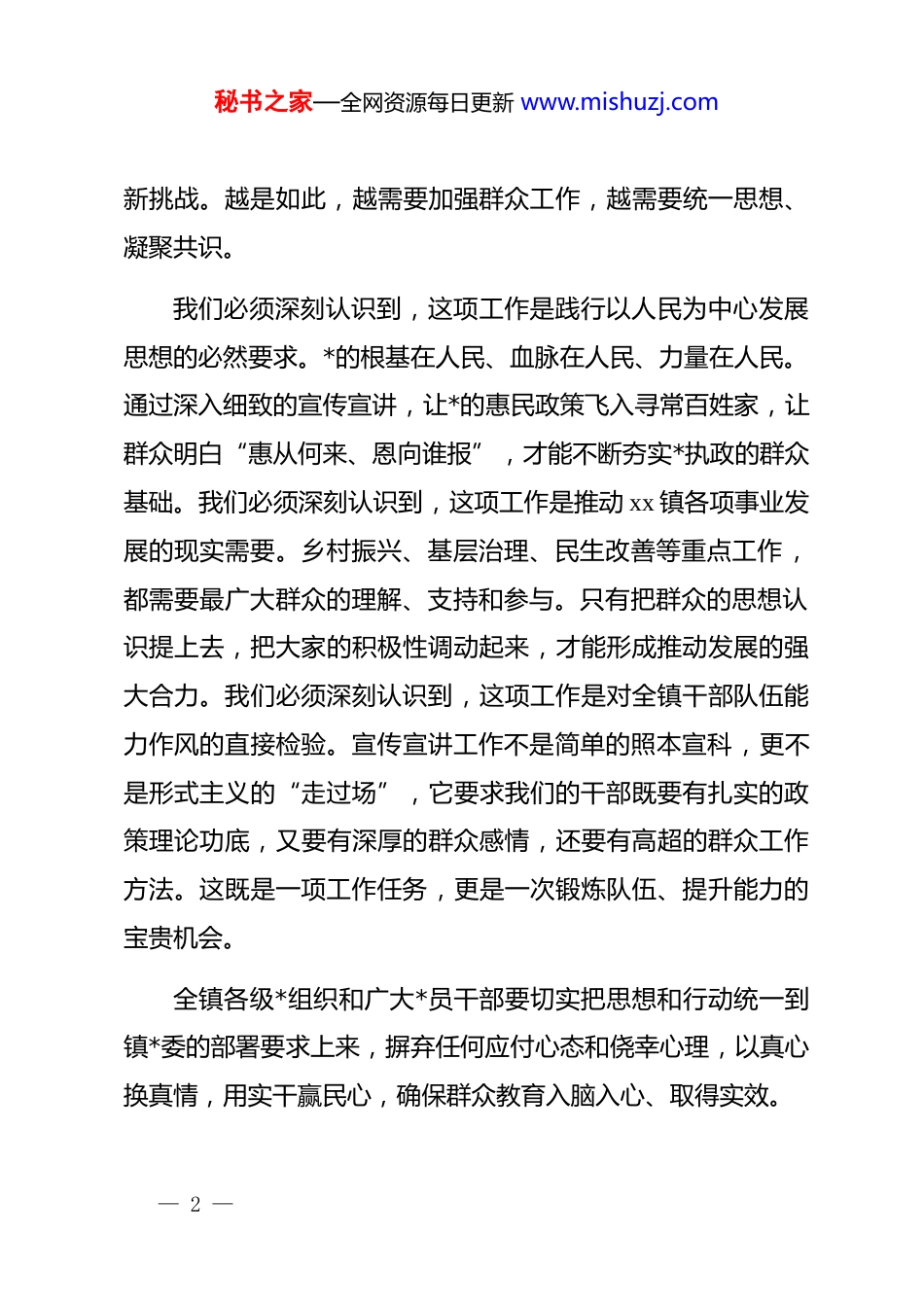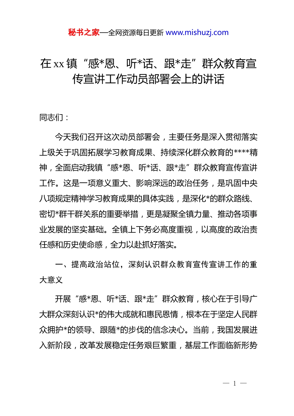 秘书之家—全网资源每日更新 www.mishuzj.com在 xx 镇“感*恩、听*话、跟*走”群众教育宣传宣讲工作动员部署会上的讲话同志们:今天我们召开这次动员部署会,主要任务是深入贯彻落实上级关于巩固拓展学习教育成果、持续深化群众教育的****精神,全面启动我镇“感*恩、听*话、跟*走”群众教育宣传宣讲工作。这是一项意义重大、影响深远的政治任务,是巩固中央八项规定精神学习教育成果的具体实践,是深化*的群众路线、密切*群干群关系的重要举措,更是凝聚全镇力量、推动各项事业发展的坚实基础。全镇上下务必高度重视,以高度的政治责任感和历史使命感,全力以赴抓好落实。一、提高政治站位,深刻认识群众教育宣传宣讲工作的重大意义开展“感*恩、听*话、跟*走”群众教育,核心在于引导广大群众深刻认识*的伟大成就和惠民恩情,根本在于坚定人民群众拥护*的领导、跟随*的步伐的信念决心。当前,我国发展进入新阶段,改革发展稳定任务艰巨繁重,基层工作面临新形势— 1 —秘书之家—全网资源每日更新 www.mishuzj.com新挑战。越是如此,越需要加强群众工作,越需要统一思想、凝聚共识。我们必须深刻认识到,这项工作是践行以人民为中心发展思想的必然要求。*的根基在人民、血脉在人民、力量在人民。通过深入细致的宣传宣讲,让*的惠民政策飞入寻常百姓家,让群众明白“惠从何来、恩向谁报”,才能不断夯实*执政的群众基础。我们必须深刻认识到,这项工作是推动 xx 镇各项事业发展的现实需要。乡村振兴、基层治理、民生改善等重点工作,都需要最广大群众的理解、支持和参与。只有把群众的思想认识提上去,把大家的积极性调动起来,才能形成推动发展的强大合力。我们必须深刻认识到,这项工作是对全镇干部队伍能力作风的直接检验。宣传宣讲工作不是简单的照本宣科,更不是形式主义的“走过场”,它要求我们的干部既要有扎实的政策理论功底,又要有深厚的群众感情,还要有高超的群众工作方法。这既是一项工作任务,更是一次锻炼队伍、提升能力的宝贵机会。全镇各级*组织和广大*员干部要切实把思想和行动统一到镇*委的部署要求上来,摒弃任何应付心态和侥幸心理,以真心换真情,用实干赢民心,确保群众教育入脑入心、取得实效。— 2 —秘书之家—全网资源每日更新 www.mishuzj.com二、聚焦重点任务,统筹推进群众教育与其他各项工作协同并进群众教育宣传宣讲工作不能孤立进行,必须注重统筹兼顾,与其他各项重点工作有机结合、一体推进,实现互促共进。一要同巩固拓展脱贫攻坚成果同乡村振兴有效衔接紧密结合。乡村振兴是新时代“三农”工作的总抓手。在入户宣讲过程中,要大力宣传*中央关于乡村振兴的战略部署和各项支农惠农政策,特别是针对我镇实际制定的具体举措。要详细了解群众在生产生活、产业发展、就业创业等方面的实际困难和需求,精准掌握动态信息,为后续制定更有针对性的帮扶措施提供依据。要激发群众内生动力,鼓励他们依靠自身努力和*的好政策,创造更加美好的生活。近三年来,我镇通过一系列精准帮扶措施,累计带动 xx 户群众稳定增收,农村基础设施和公共服务水平显著提升,这些实实在在的成果就是我们宣传宣讲最生动的教材。二要同矛盾纠纷排查化解工作紧密结合。基层是社会和谐稳定的基础。宣传宣讲的过程也是深入群众、了解民情、排查隐患的过程。要利用好这次全覆盖入户的契机,主动倾听群众诉求,及时发现苗头性、倾向性问题。对于能够当场解答解决— 3 —秘书之家—全网资源每日更新 www.mishuzj.com的,要立即处理;对于需要协调解决的,要详细记录、及时上报、跟踪督办。要宣传法律法规,引导群众依法理性表达诉求、解决纠纷,努力将矛盾化解在基层、化解在萌芽状态,以群众教育的深入开展促进社会大局的和谐稳定。三要同嘎查(社区)“两委”换届等基层组织建设工作紧密结合。坚强的基层组织是开展一切工作的保障。要通过宣传宣讲,向群众广泛宣传换届选举的政策规定、纪律要求,引导群众正确行使民主权利,选出群众信任、组织放心的“当家人”。同时,也要宣传我镇基层*组织在带领群众发展经济、改善民生、维护稳定等方面发挥的战斗堡垒作用...