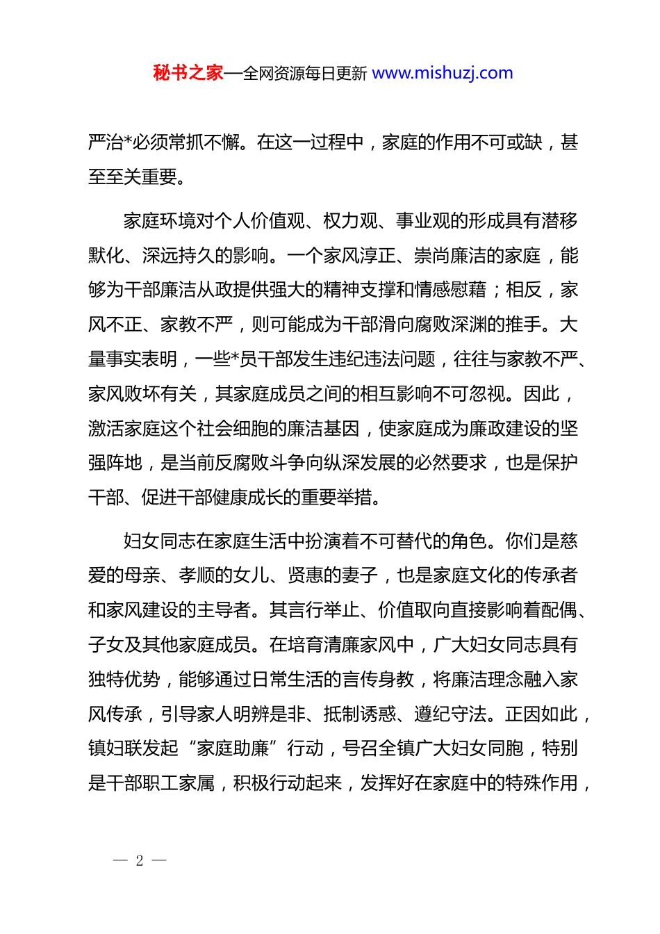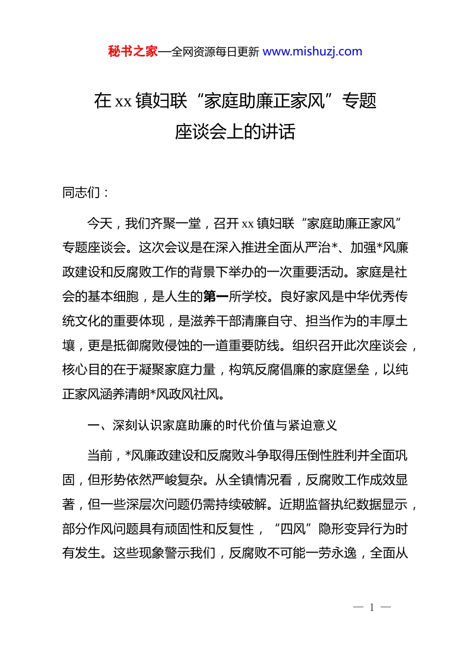 秘书之家—全网资源每日更新 www.mishuzj.com在 xx 镇妇联“家庭助廉正家风”专题座谈会上的讲话同志们:今天,我们齐聚一堂,召开 xx 镇妇联“家庭助廉正家风”专题座谈会。这次会议是在深入推进全面从严治*、加强*风廉政建设和反腐败工作的背景下举办的一次重要活动。家庭是社会的基本细胞,是人生的第一所学校。良好家风是中华优秀传统文化的重要体现,是滋养干部清廉自守、担当作为的丰厚土壤,更是抵御腐败侵蚀的一道重要防线。组织召开此次座谈会,核心目的在于凝聚家庭力量,构筑反腐倡廉的家庭堡垒,以纯正家风涵养清朗*风政风社风。一、深刻认识家庭助廉的时代价值与紧迫意义当前,*风廉政建设和反腐败斗争取得压倒性胜利并全面巩固,但形势依然严峻复杂。从全镇情况看,反腐败工作成效显著,但一些深层次问题仍需持续破解。近期监督执纪数据显示,部分作风问题具有顽固性和反复性,“四风”隐形变异行为时有发生。这些现象警示我们,反腐败不可能一劳永逸,全面从— 1 —秘书之家—全网资源每日更新 www.mishuzj.com严治*必须常抓不懈。在这一过程中,家庭的作用不可或缺,甚至至关重要。家庭环境对个人价值观、权力观、事业观的形成具有潜移默化、深远持久的影响。一个家风淳正、崇尚廉洁的家庭,能够为干部廉洁从政提供强大的精神支撑和情感慰藉;相反,家风不正、家教不严,则可能成为干部滑向腐败深渊的推手。大量事实表明,一些*员干部发生违纪违法问题,往往与家教不严、家风败坏有关,其家庭成员之间的相互影响不可忽视。因此,激活家庭这个社会细胞的廉洁基因,使家庭成为廉政建设的坚强阵地,是当前反腐败斗争向纵深发展的必然要求,也是保护干部、促进干部健康成长的重要举措。妇女同志在家庭生活中扮演着不可替代的角色。你们是慈爱的母亲、孝顺的女儿、贤惠的妻子,也是家庭文化的传承者和家风建设的主导者。其言行举止、价值取向直接影响着配偶、子女及其他家庭成员。在培育清廉家风中,广大妇女同志具有独特优势,能够通过日常生活的言传身教,将廉洁理念融入家风传承,引导家人明辨是非、抵制诱惑、遵纪守法。正因如此,镇妇联发起“家庭助廉”行动,号召全镇广大妇女同胞,特别是干部职工家属,积极行动起来,发挥好在家庭中的特殊作用,— 2 —秘书之家—全网资源每日更新 www.mishuzj.com当好“廉参谋”,把好“家门关”,吹好“枕边风”,共同守护家庭幸福,为干部职工廉洁履职提供坚实后盾。二、准确把握家庭助廉的核心要求与实践路径家庭助廉非一朝一夕之功,需要明确方向、找准路径、久久为功。结合我镇实际,家庭助廉应着力从以下几个方面深化实践:一要深化学习引领,做廉洁家风的积极倡导者。知为行之始,行是知之成。家庭成员,特别是干部家属,要主动加强学习,了解掌握 dj 国法以及*风廉政建设的各项规定要求。要深入学习领会关于全面从严治*的重要论述和精神,增强法治意识、*规意识、纪律意识。要树立正确的权力观、地位观、利益观,深刻认识到权力姓公不姓私,只能用来为人民服务,决不能异化为谋取私利的工具。要引导家人追求积极健康的生活方式,培育清清爽爽的同志关系、规规矩矩的上下级关系、既亲又清的政商关系,自觉远离各种低级趣味和不良嗜好,从思想深处筑牢拒腐防变的堤坝。二要强化日常监督,做廉洁家庭的坚定守护者。家风建设重在常长二字,贵在抓早抓小。家庭成员朝夕相处,最易察觉— 3 —秘书之家—全网资源每日更新 www.mishuzj.com彼此的思想动态和行为变化。要本着对家庭幸福负责、对亲人政治生命负责的态度,时刻关注家人的思想状况和社交往来,特别是在职务升迁、逢年过节、工程项目等关键节点,更要提高警惕。当发现家人有苗头性、倾向性问题时,要及时提醒、劝诫,甚至要敢于批评、果断劝阻,帮助他们红脸出汗、悬崖勒马。要自觉抵制各种诱惑和围猎,坚决做到“非分之礼不收、不义之财不取、身外之物不拿”,共同守护好家庭这片廉洁净土。要算好政治账、经济账、名誉账、家庭账、亲情账、自由账、健康账这“七笔账”,深刻认识腐败行为带来的巨大成本和惨痛代价。三要践行勤俭节约,做清廉家教的...