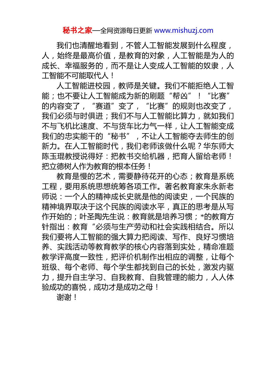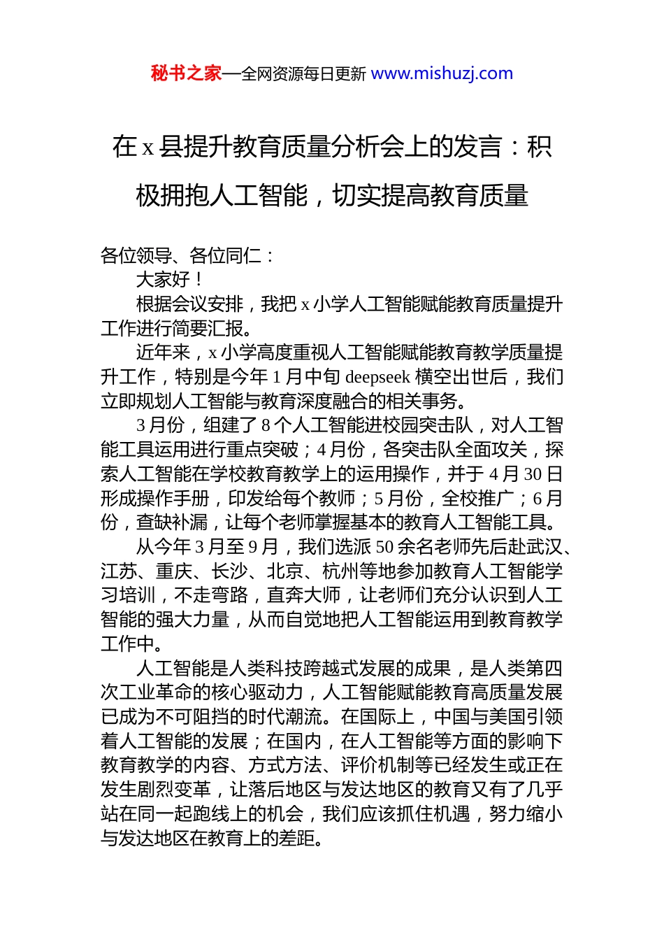 秘书之家—全网资源每日更新 www.mishuzj.com在 x 县提升教育质量分析会上的发言:积极拥抱人工智能,切实提高教育质量各位领导、各位同仁:大家好!根据会议安排,我把 x 小学人工智能赋能教育质量提升工作进行简要汇报。近年来,x 小学高度重视人工智能赋能教育教学质量提升工作,特别是今年 1 月中旬 deepseek 横空出世后,我们立即规划人工智能与教育深度融合的相关事务。3 月份,组建了 8 个人工智能进校园突击队,对人工智能工具运用进行重点突破;4 月份,各突击队全面攻关,探索人工智能在学校教育教学上的运用操作,并于 4 月 30 日形成操作手册,印发给每个教师;5 月份,全校推广;6 月份,查缺补漏,让每个老师掌握基本的教育人工智能工具。从今年 3 月至 9 月,我们选派 50 余名老师先后赴武汉、江苏、重庆、长沙、北京、杭州等地参加教育人工智能学习培训,不走弯路,直奔大师,让老师们充分认识到人工智能的强大力量,从而自觉地把人工智能运用到教育教学工作中。人工智能是人类科技跨越式发展的成果,是人类第四次工业革命的核心驱动力,人工智能赋能教育高质量发展已成为不可阻挡的时代潮流。在国际上,中国与美国引领着人工智能的发展;在国内,在人工智能等方面的影响下教育教学的内容、方式方法、评价机制等已经发生或正在发生剧烈变革,让落后地区与发达地区的教育又有了几乎站在同一起跑线上的机会,我们应该抓住机遇,努力缩小与发达地区在教育上的差距。秘书之家—全网资源每日更新 www.mishuzj.com我们也清醒地看到,不管人工智能发展到什么程度,人,始终是最高价值,是教育的对象,人工智能是为人的成长、幸福服务的,而不是让人变成人工智能的奴隶,人工智能不可能取代人!人工智能进校园,教师是关键。我们不能拒绝人工智能;也不要让人工智能成为新的刷题“帮凶”!“比赛”的内容变了,“赛道”变了,“比赛”的规则也改变了,我们必须与时俱进;我们不与人工智能比算力,就如我们不与飞机比速度、不与货车比力气一样,让人工智能变成我们的忠实能干的“秘书”,不让人工智能夺去师生的创新力。在人工智能时代,我们老师该做什么呢?华东师大陈玉琨教授说得好:把教书交给机器,把育人留给老师!把立德树人作为教育的根本任务!教育是慢的艺术,需要静待花开的心态;教育是系统工程,要用系统思想统筹各项工作。著名教育家朱永新老师说:一个人的精神成长史就是他的阅读史,一个民族的精神境界取决于这个民族的阅读水平,真正的思考是从写作开始的;叶圣陶先生说:教育就是培养习惯;*的教育方针指出:教育“必须与生产劳动和社会实践相结合。所以我们要将人工智能的强大算力把阅读、写作、良好习惯培养、实践活动等教育教学的核心内容落到实处,精命准题教学评高度一致性,把评价机制作出相应的调整,让每个班级、每个老师、每个学生都找到自己的长处,激发内驱力,提升自主学习、自我教育、自我管理的能力,人人体验成功的喜悦,成功才是成功之母!谢谢!