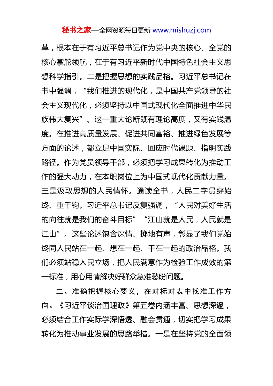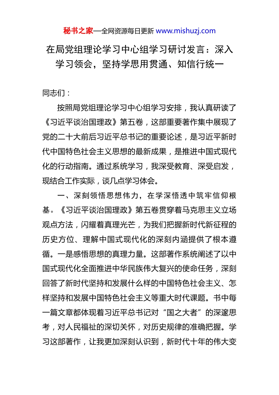 秘书之家—全网资源每日更新 www.mishuzj.com在局党组理论学习中心组学习研讨发言:深入学习领会,坚持学思用贯通、知信行统一 同志们:按照局党组理论学习中心组学习安排,我认真研读了《习近平谈治国理政》第五卷,这部重要著作集中展现了党的二十大前后习近平总书记的重要论述,是习近平新时代中国特色社会主义思想的最新成果,是推进中国式现代化的行动指南。通过系统学习,我深受教育、深受启发,现结合工作实际,谈几点学习体会。一、深刻领悟思想伟力,在学深悟透中筑牢信仰根基。《习近平谈治国理政》第五卷贯穿着马克思主义立场观点方法,闪耀着真理光芒,为我们把握新时代新征程的历史方位、理解中国式现代化的深刻内涵提供了根本遵循。一是感悟思想的真理力量。这部著作系统阐述了以中国式现代化全面推进中华民族伟大复兴的使命任务,深刻回答了新时代坚持和发展什么样的中国特色社会主义、怎样坚持和发展中国特色社会主义等重大时代课题。书中每一篇文章都体现着习近平总书记对“国之大者”的深邃思考,对人民福祉的深切关怀,对历史规律的准确把握。学习这部著作,让我更加深刻认识到,新时代十年的伟大变秘书之家—全网资源每日更新 www.mishuzj.com革,根本在于有习近平总书记作为党中央的核心、全党的核心掌舵领航,在于有习近平新时代中国特色社会主义思想科学指引。二是把握思想的实践品格。习近平总书记在书中强调,“我们推进的现代化,是中国共产党领导的社会主义现代化,必须坚持以中国式现代化全面推进中华民族伟大复兴”。这一重大论断既有理论高度,又有实践温度。在推进高质量发展、促进共同富裕、推进绿色发展等方面的论述,都立足中国实际、回应时代课题、指明实践路径。作为党员领导干部,必须把学习成果转化为推动工作的强大动力,在本职岗位上为中国式现代化贡献力量。三是汲取思想的人民情怀。通读全书,人民二字贯穿始终、重千钧。习近平总书记反复强调,“人民对美好生活的向往就是我们的奋斗目标”“江山就是人民,人民就是江山”。这些论述饱含深情、掷地有声,彰显了我们党始终同人民站在一起、想在一起、干在一起的政治品格。我们必须站稳人民立场,把人民满意作为检验工作成效的第一标准,用心用情解决好群众急难愁盼问题。二、准确把握核心要义,在对标对表中找准工作方向。《习近平谈治国理政》第五卷内涵丰富、思想深邃,必须结合工作实际学深悟透、融会贯通,切实把学习成果转化为推动事业发展的思路举措。一是在坚持党的全面领秘书之家—全网资源每日更新 www.mishuzj.com导上找准定位。习近平总书记在书中鲜明指出,“党的领导是全面的、系统的、整体的,必须全面、系统、整体加以落实”。这为我们加强党的建设指明了方向。我们要坚持把党的政治建设摆在首位,不断提高政治判断力、政治领悟力、政治执行力,确保党的路线方针政策在本系统本单位不折不扣贯彻落实。要健全完善党组织领导下的工作机制,把党的领导贯穿到业务工作各方面全过程,做到党建与业务深度融合、同频共振。二是在推动高质量发展上强化担当。习近平总书记深刻阐述了“完整、准确、全面贯彻新发展理念,加快构建新发展格局,着力推动高质量发展”的战略部署。对照这一要求,我们必须立足新发展阶段,把高质量发展要求贯穿工作始终。要坚持系统观念,统筹处理好发展和安全、当前和长远、局部和全局的关系。要坚持问题导向,聚焦制约高质量发展的瓶颈短板,拿出破解难题的实招硬招。要坚持创新驱动,用改革的办法、创新的思路推动各项工作提质增效。三是在增进民生福祉上体现作为。习近平总书记强调,“让现代化建设成果更多更公平惠及全体人民”。这是我们一切工作的出发点和落脚点。我们要始终把群众呼声作为第一信号,把群众满意作为第一标准,聚焦教育、医疗、养老、就业等群众关心的热点问题,拿出实实在在的举措。要深入基秘书之家—全网资源每日更新 www.mishuzj.com层一线,走进群众身边,了解群众所思所盼,把工作做到群众心坎上。要建立健全长效机制,让群众看到变化、得到实惠、感到温暖。三、强化使命担当,在笃行实干中推动工作落实。学习的目的在...