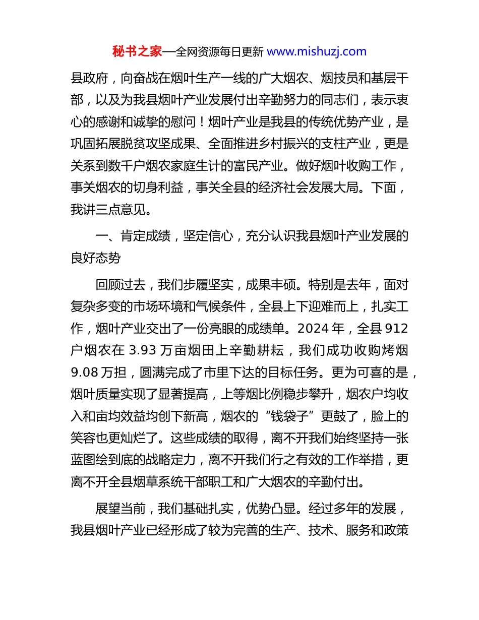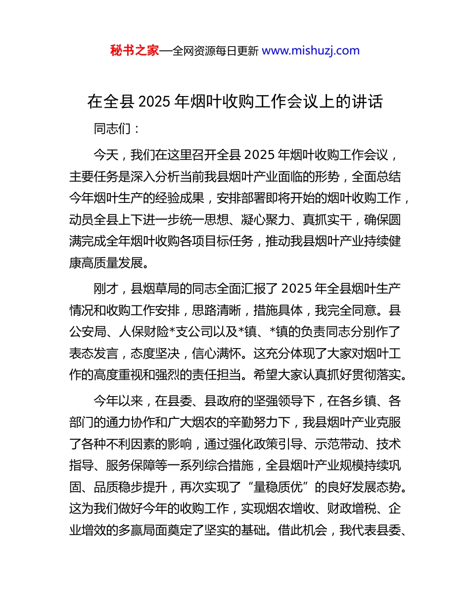 秘书之家—全网资源每日更新 www.mishuzj.com在全县 2025 年烟叶收购工作会议上的讲话同志们:今天,我们在这里召开全县 2025 年烟叶收购工作会议,主要任务是深入分析当前我县烟叶产业面临的形势,全面总结今年烟叶生产的经验成果,安排部署即将开始的烟叶收购工作,动员全县上下进一步统一思想、凝心聚力、真抓实干,确保圆满完成全年烟叶收购各项目标任务,推动我县烟叶产业持续健康高质量发展。刚才,县烟草局的同志全面汇报了 2025 年全县烟叶生产情况和收购工作安排,思路清晰,措施具体,我完全同意。县公安局、人保财险*支公司以及*镇、*镇的负责同志分别作了表态发言,态度坚决,信心满怀。这充分体现了大家对烟叶工作的高度重视和强烈的责任担当。希望大家认真抓好贯彻落实。今年以来,在县委、县政府的坚强领导下,在各乡镇、各部门的通力协作和广大烟农的辛勤努力下,我县烟叶产业克服了各种不利因素的影响,通过强化政策引导、示范带动、技术指导、服务保障等一系列综合措施,全县烟叶产业规模持续巩固、品质稳步提升,再次实现了“量稳质优”的良好发展态势。这为我们做好今年的收购工作,实现烟农增收、财政增税、企业增效的多赢局面奠定了坚实的基础。借此机会,我代表县委、秘书之家—全网资源每日更新 www.mishuzj.com县政府,向奋战在烟叶生产一线的广大烟农、烟技员和基层干部,以及为我县烟叶产业发展付出辛勤努力的同志们,表示衷心的感谢和诚挚的慰问!烟叶产业是我县的传统优势产业,是巩固拓展脱贫攻坚成果、全面推进乡村振兴的支柱产业,更是关系到数千户烟农家庭生计的富民产业。做好烟叶收购工作,事关烟农的切身利益,事关全县的经济社会发展大局。下面,我讲三点意见。一、肯定成绩,坚定信心,充分认识我县烟叶产业发展的良好态势回顾过去,我们步履坚实,成果丰硕。特别是去年,面对复杂多变的市场环境和气候条件,全县上下迎难而上,扎实工作,烟叶产业交出了一份亮眼的成绩单。2024 年,全县 912户烟农在 3.93 万亩烟田上辛勤耕耘,我们成功收购烤烟9.08 万担,圆满完成了市里下达的目标任务。更为可喜的是,烟叶质量实现了显著提高,上等烟比例稳步攀升,烟农户均收入和亩均效益均创下新高,烟农的“钱袋子”更鼓了,脸上的笑容也更灿烂了。这些成绩的取得,离不开我们始终坚持一张蓝图绘到底的战略定力,离不开我们行之有效的工作举措,更离不开全县烟草系统干部职工和广大烟农的辛勤付出。展望当前,我们基础扎实,优势凸显。经过多年的发展,我县烟叶产业已经形成了较为完善的生产、技术、服务和政策秘书之家—全网资源每日更新 www.mishuzj.com体系。今年的烟叶生产,从春季育苗到大田移栽,再到中后期管理,每一个环节都抓得紧、抓得实。特别是县烟草部门组织的技术专家团队,深入田间地头,“把脉问诊”,手把手地进行技术指导,确保了科学种植技术的全面普及。从目前长势来看,今年的烟叶普遍长势喜人、叶片肥厚、色泽纯正,丰收在望。我们今年的收购目标是 9.1 万担,这个目标既是压力,更是我们产业发展水平和潜力的体现。我们完全有基础、有条件、有信心圆满完成这个任务。全县各级各部门务必要从战略和全局的高度,深刻认识烟叶产业的特殊重要性,切实增强做好烟叶收购工作的责任感和使命感。二、聚焦重点,精准发力,全力确保今年烟叶收购工作平稳高效烟叶收购是烟叶生产的“最后一公里”,也是决定烟农一年辛劳能否变为实实在在收入的关键环节。收购工作政策性强、涉及面广、社会关注度高,容不得半点马虎和懈怠。我们必须以更扎实的作风、更有力的举措,精心组织、周密部署,确保整个收购过程平稳、有序、高效。第一,要坚决落实“阳光收购”,在公平公正上“定标尺”。公平公正是烟叶收购工作的生命线,也是维系烟农信任、调动烟农积极性的根本保障。必须将“阳光收购”贯穿于收购工作的全过程。一要做到政策公开。要通过收购站点的公示栏、秘书之家—全网资源每日更新 www.mishuzj.com村组的广播、微信群等多种渠道,将今年的收购价格、等级标准、补贴政策、预约流程等内容原原本本地向广大烟农讲清楚、说明...