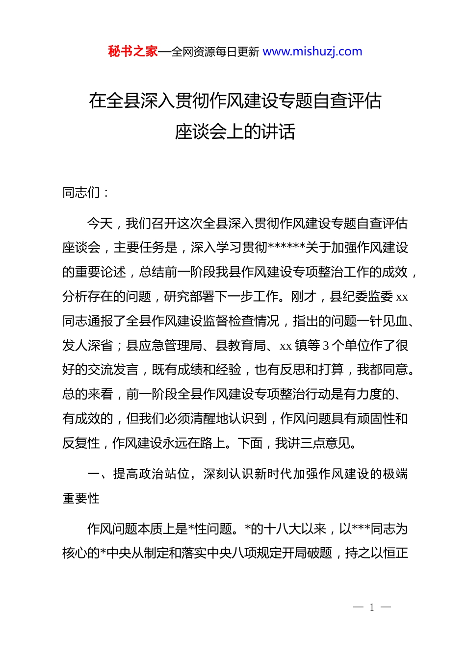 秘书之家—全网资源每日更新 www.mishuzj.com在全县深入贯彻作风建设专题自查评估座谈会上的讲话同志们:今天,我们召开这次全县深入贯彻作风建设专题自查评估座谈会,主要任务是,深入学习贯彻******关于加强作风建设的重要论述,总结前一阶段我县作风建设专项整治工作的成效,分析存在的问题,研究部署下一步工作。刚才,县纪委监委 xx同志通报了全县作风建设监督检查情况,指出的问题一针见血、发人深省;县应急管理局、县教育局、xx 镇等 3 个单位作了很好的交流发言,既有成绩和经验,也有反思和打算,我都同意。总的来看,前一阶段全县作风建设专项整治行动是有力度的、有成效的,但我们必须清醒地认识到,作风问题具有顽固性和反复性,作风建设永远在路上。下面,我讲三点意见。一、提高政治站位,深刻认识新时代加强作风建设的极端重要性作风问题本质上是*性问题。*的十八大以来,以***同志为核心的*中央从制定和落实中央八项规定开局破题,持之以恒正— 1 —秘书之家—全网资源每日更新 www.mishuzj.com风肃纪,刹住了一些过去被认为不可能刹住的歪风,纠治了一些多年未除的顽瘴痼疾,*风政风为之一新,社风民风向上向善。******反复强调,“作风建设是攻坚战,也是持久战”“必须常抓不懈,紧抓不放,深入抓、持久抓”。***的重要论述,深刻阐明了加强作风建设的重大意义、目标任务和方法路径,为我们驰而不息加强作风建设提供了根本遵循。第一,加强作风建设是坚定拥护“两个确立”、坚决做到“两个维护”的政治检验。*的作风就是*的形象,关系人心向背,关系*的生死存亡。一个地方的干部作风,直接反映出这个地方的政治生态,直接体现出这个地方的干部是不是真心实意地在拥护核心、爱戴核心、紧跟核心。如果一个地方的干部作风漂浮、纪律松弛,“四风”问题禁而不绝,那就说明这个地方的政治建设出了问题。全县各级*组织和广大*员干部必须从政治高度来审视和把握作风建设,把抓作风、改作风的成效作为检验政治忠诚度、体现政治执行力的重要标尺,以过硬作风确保*中央和省委、市委、县委各项决策部署在 xx 大地落地生根、开花结果。第二,加强作风建设是推动 xx 县高质量发展的现实需要。当前,我县正处在转型升级、爬坡过坎的关键时期。无论是推— 2 —秘书之家—全网资源每日更新 www.mishuzj.com进 xx 工业园区提质增效,还是打造 xx 农文旅融合示范区,无论是保障和改善民生,还是防范化解重大风险,每一项工作都是硬任务,每一场都是硬仗。打硬仗,必须有硬作风。如果我们的干部精神懈怠、不思进取,满足于当“太平官”;如果我们的干部畏首畏尾、不敢担当,遇到矛盾绕道走;如果我们的干部脱离群众、官僚主义,对群众的急难愁盼漠不关心,那么高质量发展就是一句空话。全县上下必须牢固树立“抓作风就是抓发展、优环境就是促发展”的理念,以干部作风的大转变,推动营商环境的大优化,激发经济社会发展的大活力。第三,加强作风建设是密切联系服务群众的内在要求。江山就是人民,人民就是江山。作风好不好,群众看得最清楚,感受最真切。一些干部“门好进、脸好看、事难办”,一些干部对待群众“冷、横、硬、推”,这些都严重损害了*和政府在群众心中的形象,侵蚀了*的执政根基。我们必须始终坚持以人民为中心的发展思想,把人民满意不满意、高兴不高兴、答应不答应作为衡量作风建设成效的根本标准。要通过作风建设,引导广大干部真正沉下去,拜群众为师,与群众交友,用心用情用力解决好群众在教育、医疗、养老、就业等方面的烦心事、揪心事,不断增强人民群众的获得感、幸福感、安全感。— 3 —秘书之家—全网资源每日更新 www.mishuzj.com二、坚持问题导向,清醒认识当前我县作风建设面临的严峻挑战从刚才通报的情况和日常掌握的情况看,经过持续整治,我县作风建设总体是好的,但对标*中央要求和群众期盼,一些深层次、顽固性问题依然存在,一些新情况、新动向值得高度警惕。一是享乐主义、奢靡之风出现隐形变异。明目张胆的公款吃喝、公车私用少了,但“不吃公款吃老板”、“错峰”出游、私车公养等问题时有发生。有的干部违规收送电...