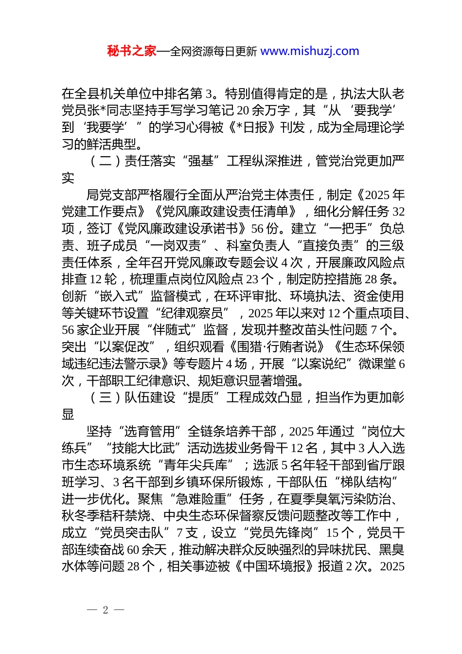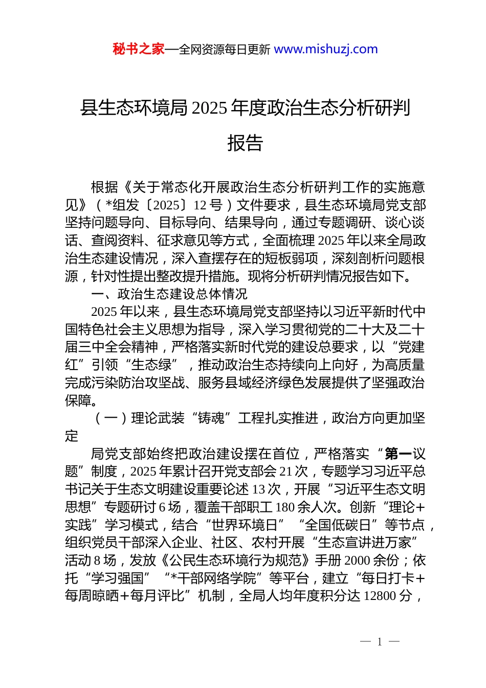 秘书之家—全网资源每日更新 www.mishuzj.com县生态环境局 2025 年度政治生态分析研判报告根据《关于常态化开展政治生态分析研判工作的实施意见》(*组发〔2025〕12 号)文件要求,县生态环境局党支部坚持问题导向、目标导向、结果导向,通过专题调研、谈心谈话、查阅资料、征求意见等方式,全面梳理 2025 年以来全局政治生态建设情况,深入查摆存在的短板弱项,深刻剖析问题根源,针对性提出整改提升措施。现将分析研判情况报告如下。一、政治生态建设总体情况2025 年以来,县生态环境局党支部坚持以习近平新时代中国特色社会主义思想为指导,深入学习贯彻党的二十大及二十届三中全会精神,严格落实新时代党的建设总要求,以“党建红”引领“生态绿”,推动政治生态持续向上向好,为高质量完成污染防治攻坚战、服务县域经济绿色发展提供了坚强政治保障。(一)理论武装“铸魂”工程扎实推进,政治方向更加坚定局党支部始终把政治建设摆在首位,严格落实“第一议题”制度,2025 年累计召开党支部会 21 次,专题学习习近平总书记关于生态文明建设重要论述 13 次,开展“习近平生态文明思想”专题研讨 6 场,覆盖干部职工 180 余人次。创新“理论+实践”学习模式,结合“世界环境日”“全国低碳日”等节点,组织党员干部深入企业、社区、农村开展“生态宣讲进万家”活动 8 场,发放《公民生态环境行为规范》手册 2000 余份;依托“学习强国”“*干部网络学院”等平台,建立“每日打卡+每周晾晒+每月评比”机制,全局人均年度积分达 12800 分,— 1 —秘书之家—全网资源每日更新 www.mishuzj.com在全县机关单位中排名第 3。特别值得肯定的是,执法大队老党员张*同志坚持手写学习笔记 20 余万字,其“从‘要我学’到‘我要学’”的学习心得被《*日报》刊发,成为全局理论学习的鲜活典型。(二)责任落实“强基”工程纵深推进,管党治党更加严实局党支部严格履行全面从严治党主体责任,制定《2025 年党建工作要点》《党风廉政建设责任清单》,细化分解任务 32项,签订《党风廉政建设承诺书》56 份。建立“一把手”负总责、班子成员“一岗双责”、科室负责人“直接负责”的三级责任体系,全年召开党风廉政专题会议 4 次,开展廉政风险点排查 12 轮,梳理重点岗位风险点 23 个,制定防控措施 28 条。创新“嵌入式”监督模式,在环评审批、环境执法、资金使用等关键环节设置“纪律观察员”,2025 年以来对 12 个重点项目、56 家企业开展“伴随式”监督,发现并整改苗头性问题 7 个。突出“以案促改”,组织观看《围猎·行贿者说》《生态环保领域违纪违法警示录》等专题片 4 场,开展“以案说纪”微课堂 6次,干部职工纪律意识、规矩意识显著增强。(三)队伍建设“提质”工程成效凸显,担当作为更加彰显坚持“选育管用”全链条培养干部,2025 年通过“岗位大练兵”“技能大比武”活动选拔业务骨干 12 名,其中 3 人入选市生态环境系统“青年尖兵库”;选派 5 名年轻干部到省厅跟班学习、3 名干部到乡镇环保所锻炼,干部队伍“梯队结构”进一步优化。聚焦“急难险重”任务,在夏季臭氧污染防治、秋冬季秸秆禁烧、中央生态环保督察反馈问题整改等工作中,成立“党员突击队”7 支,设立“党员先锋岗”15 个,党员干部连续奋战 60 余天,推动解决群众反映强烈的异味扰民、黑臭水体等问题 28 个,相关事迹被《中国环境报》报道 2 次。2025— 2 —秘书之家—全网资源每日更新 www.mishuzj.com年全局共有 12 人次获县级以上表彰,其中执法大队被评为“全省生态环境保护先进集体”,1 名干部获“*县最美公务员”称号。(四)作风建设“清朗”工程持续深化,政治文化更加清明严格执行中央八项规定及其实施细则精神,2025 年全局“三公”经费支出同比下降 18%,会议文件数量同比减少25%。大力整治“庸懒散慢拖”问题,开展“作风建设提升月”活动,建立“周督查、月通报、季考评”机制,通报迟到早退、脱岗串岗等问题 12 起,批评教育 15 人次。弘扬“严真细实快”工作作风,在环评审批中推行“容缺受理+并联审批”模...