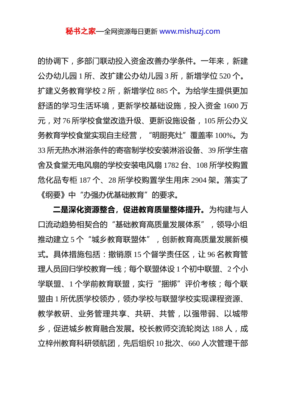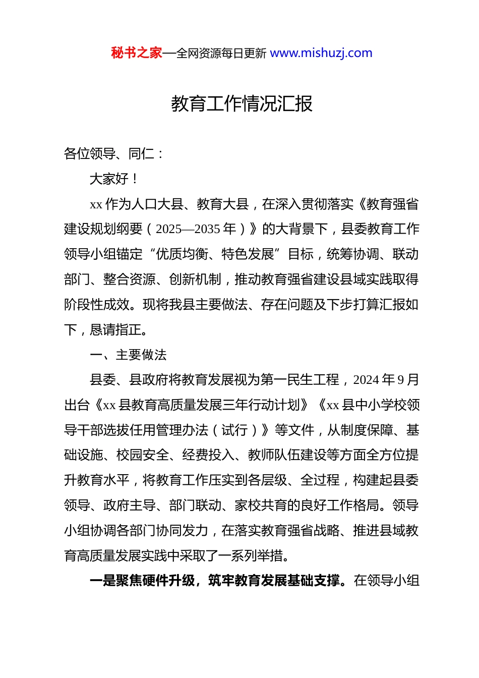 秘书之家—全网资源每日更新 www.mishuzj.com教育工作情况汇报各位领导、同仁:大家好!xx 作为人口大县、教育大县,在深入贯彻落实《教育强省建设规划纲要(2025—2035 年)》的大背景下,县委教育工作领导小组锚定“优质均衡、特色发展”目标,统筹协调、联动部门、整合资源、创新机制,推动教育强省建设县域实践取得阶段性成效。现将我县主要做法、存在问题及下步打算汇报如下,恳请指正。一、主要做法县委、县政府将教育发展视为第一民生工程,2024 年 9 月出台《xx 县教育高质量发展三年行动计划》《xx 县中小学校领导干部选拔任用管理办法(试行)》等文件,从制度保障、基础设施、校园安全、经费投入、教师队伍建设等方面全方位提升教育水平,将教育工作压实到各层级、全过程,构建起县委领导、政府主导、部门联动、家校共育的良好工作格局。领导小组协调各部门协同发力,在落实教育强省战略、推进县域教育高质量发展实践中采取了一系列举措。一是聚焦硬件升级,筑牢教育发展基础支撑。在领导小组秘书之家—全网资源每日更新 www.mishuzj.com的协调下,多部门联动投入资金改善办学条件。一年来,新建公办幼儿园 1 所、改扩建公办幼儿园 3 所,新增学位 520 个。扩建义务教育学校 2 所,新增学位 885 个。为给学生提供更加舒适的学习生活环境,更新学校基础设施,投入资金 1600 万元,对 76 所学校食堂改造升级、更新设施设备,105 所公办义务教育学校食堂实现自主经营,“明厨亮灶”覆盖率 100%。为33 所无热水淋浴条件的寄宿制学校安装淋浴设备、39 所学生宿舍及食堂无电风扇的学校安装电风扇 1782 台、108 所学校购置危化品专柜 187 个、28 所学校购置学生用床 2904 架。落实了《纲要》中“办强办优基础教育”的要求。二是深化资源整合,促进教育质量整体提升。为构建与人口流动趋势相契合的“基础教育高质量发展体系”,领导小组推动建立 5 个“城乡教育联盟体”,创新教育高质量发展新模式。具体措施包括:撤销原 15 个督学责任区,让 96 名教育管理人员回归学校教育一线;每个联盟体设 1 个初中联盟、2 个小学联盟、1 个学前教育联盟,实行“捆绑”评价考核;每个联盟由 1 所优质学校领办,领办学校与联盟学校实现课程资源、教学教研、业务管理共享、共研、共管,以强带弱、以城带乡,促进城乡教育融合发展。校长教师交流轮岗达 188 人,成立梓州教育科研领航团,先后组织 10 批次、660 人次管理干部秘书之家—全网资源每日更新 www.mishuzj.com和学科教师分别赴北京、重庆、上海等地考察学习。“校园开放日”方案落地,110 所义教学校和 8 所建制幼儿园累计开展968 场,凝聚家、校、社三方协同育人合力,提升学校办学水平,呼应了《纲要》中“公平优质的基础教育体系”的建设目标。2025 年,xx 高考特控线上线率、本科上线率、清北人数均实现全面突破;中考在特优生、上线率、录取率方面均实现强势增长。三是突出铸魂育人,构建协同育人工作体系。领导小组统筹推进**************思想铸魂育人工作,做好中小学思政课一体化建设。面对思政课建设创新性不够,存在“供给弱、师资弱、载体弱”等不足的情况,加快推进思政“三金”品牌建设,实施“金课提质”“金师赋能”“金校铸魂”三大工程,培育 10 所思政金校。我县“三金”品牌建设在全市思政教育工作推进会上作经验交流。推动各学校营造浓厚思政教育氛围,让思政元素全方位浸润校园,与《纲要》中“固本铸魂的思想政治教育体系”相呼应。四是打造特色品牌,增强教育发展活力动力。精心打造“心育、科创、体育”三张特色名片,心育全链护航:作为全省首个与 xx 师范大学签订心理健康教育合作协议的县市区,领导小组以专业协同为抓手,全面推进心理健康教育高质量发秘书之家—全网资源每日更新 www.mishuzj.com展,构建起覆盖全域、贯穿全年、家校社联动体系。构建“县级辅导中心+联盟体副中心”区域协同架构,加速推进 1 个中心、14 个联盟副中心以及特色示范校的建设,为县域教育高质量发展奠定坚实心理基础。强化师资建设,构建全年培训体系...