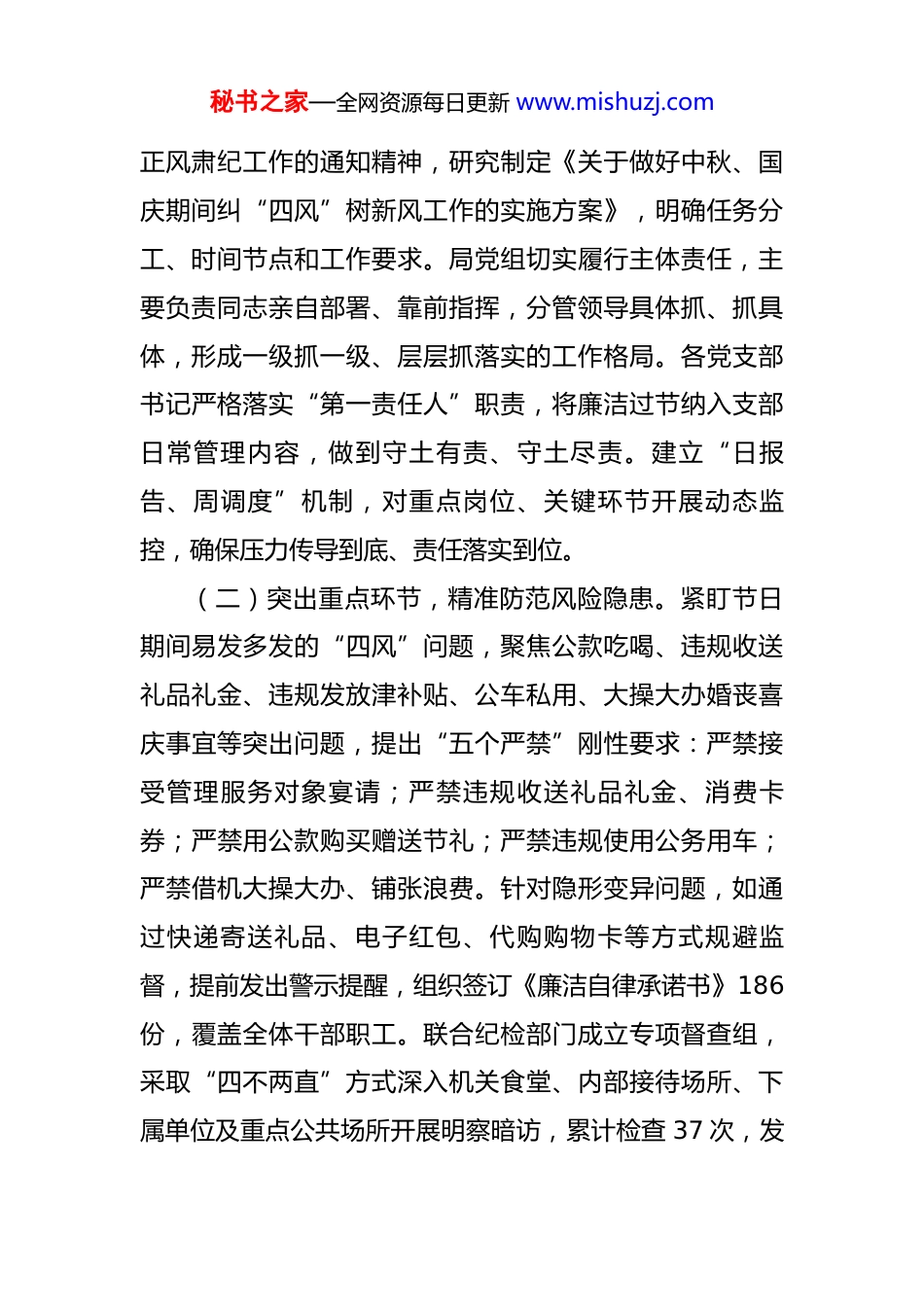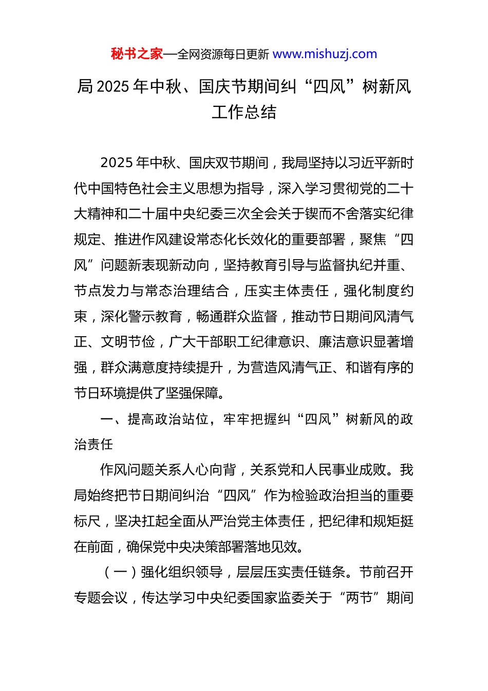 秘书之家—全网资源每日更新 www.mishuzj.com局 2025 年中秋、国庆节期间纠“四风”树新风工作总结 2025 年中秋、国庆双节期间,我局坚持以习近平新时代中国特色社会主义思想为指导,深入学习贯彻党的二十大精神和二十届中央纪委三次全会关于锲而不舍落实纪律规定、推进作风建设常态化长效化的重要部署,聚焦“四风”问题新表现新动向,坚持教育引导与监督执纪并重、节点发力与常态治理结合,压实主体责任,强化制度约束,深化警示教育,畅通群众监督,推动节日期间风清气正、文明节俭,广大干部职工纪律意识、廉洁意识显著增强,群众满意度持续提升,为营造风清气正、和谐有序的节日环境提供了坚强保障。一、提高政治站位,牢牢把握纠“四风”树新风的政治责任作风问题关系人心向背,关系党和人民事业成败。我局始终把节日期间纠治“四风”作为检验政治担当的重要标尺,坚决扛起全面从严治党主体责任,把纪律和规矩挺在前面,确保党中央决策部署落地见效。(一)强化组织领导,层层压实责任链条。节前召开专题会议,传达学习中央纪委国家监委关于“两节”期间秘书之家—全网资源每日更新 www.mishuzj.com正风肃纪工作的通知精神,研究制定《关于做好中秋、国庆期间纠“四风”树新风工作的实施方案》,明确任务分工、时间节点和工作要求。局党组切实履行主体责任,主要负责同志亲自部署、靠前指挥,分管领导具体抓、抓具体,形成一级抓一级、层层抓落实的工作格局。各党支部书记严格落实“第一责任人”职责,将廉洁过节纳入支部日常管理内容,做到守土有责、守土尽责。建立“日报告、周调度”机制,对重点岗位、关键环节开展动态监控,确保压力传导到底、责任落实到位。(二)突出重点环节,精准防范风险隐患。紧盯节日期间易发多发的“四风”问题,聚焦公款吃喝、违规收送礼品礼金、违规发放津补贴、公车私用、大操大办婚丧喜庆事宜等突出问题,提出“五个严禁”刚性要求:严禁接受管理服务对象宴请;严禁违规收送礼品礼金、消费卡券;严禁用公款购买赠送节礼;严禁违规使用公务用车;严禁借机大操大办、铺张浪费。针对隐形变异问题,如通过快递寄送礼品、电子红包、代购购物卡等方式规避监督,提前发出警示提醒,组织签订《廉洁自律承诺书》186份,覆盖全体干部职工。联合纪检部门成立专项督查组,采取“四不两直”方式深入机关食堂、内部接待场所、下属单位及重点公共场所开展明察暗访,累计检查 37 次,发秘书之家—全网资源每日更新 www.mishuzj.com现问题线索 6 条,均已按程序移交处理。(三)健全制度机制,扎紧权力运行“笼子”。坚持标本兼治,注重从制度层面堵塞漏洞。修订完善《公务接待管理办法》《公务用车管理制度》《财务报销实施细则》等制度文件,进一步规范审批流程、明确支出标准、强化责任追究。推行“阳光采购”平台,所有节日慰问品、办公用品一律通过政府采购系统公开比选,杜绝“暗箱操作”。建立“节日廉政提醒+个人承诺+家庭助廉”三位一体机制,向全体干部职工发送廉洁过节短信提醒 2400余条,组织家属座谈会 12 场,邀请家属签署《家庭助廉倡议书》98 份,推动廉洁教育从“单位圈”延伸至“家庭圈”,构建内外联动、协同发力的监督网络。二、坚持人民至上,用心用情解决群众急难愁盼纠“四风”不是为“查人”,而是为“惠民”。我局始终坚持把群众满意不满意作为衡量工作的根本标准,把整治群众身边的不正之风和腐败问题贯穿节日期间全过程,切实增强人民群众的获得感、幸福感、安全感。(一)聚焦民生热点,推动政策落地见效。围绕群众反映强烈的养老、医疗、出行、食品安全等现实问题,组织开展“暖心行动”专项巡查。在基层一线走访调研中发现,个别社区存在公共照明设施老化、夜间出行不便等问秘书之家—全网资源每日更新 www.mishuzj.com题,立即协调相关部门限期整改,完成路灯维修更换 56盏,增设临时照明点 12 处。联合市场监管部门对辖区商超、餐饮门店开展食品安全突击检查,发现并督促整改问题隐患 31 项,其中涉及无证经营、过期食品等重大风险点4 个,已依法依规处置。设立“节日服务直通车”热线,受理群众咨询...