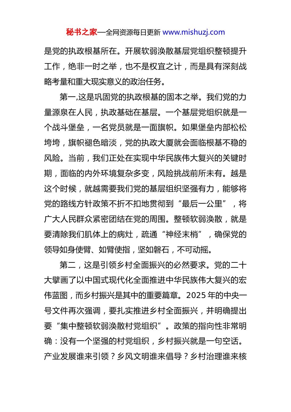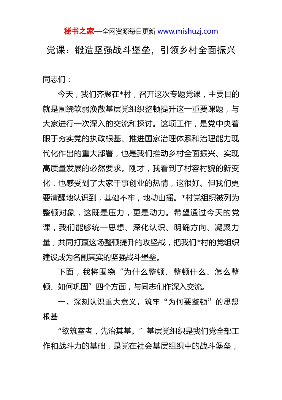 秘书之家—全网资源每日更新 www.mishuzj.com党课:锻造坚强战斗堡垒,引领乡村全面振兴 同志们:今天,我们齐聚在*村,召开这次专题党课,主要目的就是围绕软弱涣散基层党组织整顿提升这一重要课题,与大家进行一次深入的交流和探讨。这项工作,是党中央着眼于夯实党的执政根基、推进国家治理体系和治理能力现代化作出的重大部署,也是我们推动乡村全面振兴、实现高质量发展的必然要求。刚才,我看到了村容村貌的新变化,也感受到了大家干事创业的热情,这很好。但我们更要清醒地认识到,基础不牢,地动山摇。*村党组织被列为整顿对象,这既是压力,更是动力。希望通过今天的党课,我们能够统一思想、深化认识、明确方向、凝聚力量,共同打赢这场整顿提升的攻坚战,把我们*村的党组织建设成为名副其实的坚强战斗堡垒。下面,我将围绕“为什么整顿、整顿什么、怎么整顿、如何巩固”四个方面,与同志们作深入交流。一、深刻认识重大意义,筑牢“为何要整顿”的思想根基“欲筑室者,先治其基。”基层党组织是我们党全部工作和战斗力的基础,是党在社会基层组织中的战斗堡垒,秘书之家—全网资源每日更新 www.mishuzj.com是党的执政根基所在。开展软弱涣散基层党组织整顿提升工作,绝非一时之举,也不是权宜之计,而是具有深刻战略考量和重大现实意义的政治任务。第一,这是巩固党的执政根基的固本之举。我们党的力量源泉在人民,执政基础在基层。一个基层党组织就是一个战斗堡垒,一名党员就是一面旗帜。如果堡垒内部松松垮垮,旗帜褪色暗淡,党的执政大厦就会面临根基不稳的风险。当前,我们正处在实现中华民族伟大复兴的关键时期,面临的内外环境复杂多变,风险挑战前所未有。越是这个时候,就越需要我们党的基层组织坚强有力,能够将党的路线方针政策不折不扣地贯彻到“最后一公里”,将广大人民群众紧密团结在党的周围。整顿软弱涣散,就是要清除我们肌体上的病灶,疏通“神经末梢”,确保党的领导如身使臂、如臂使指,坚如磐石,不可动摇。第二,这是引领乡村全面振兴的必然要求。党的二十大擘画了以中国式现代化全面推进中华民族伟大复兴的宏伟蓝图,而乡村振兴是其中的重要篇章。2025 年的中央一号文件再次强调,要扎实推进乡村全面振兴,并明确提出要“集中整顿软弱涣散村党组织”。政策的指向性非常明确:没有一个坚强的村党组织,乡村振兴就是一句空话。产业发展谁来引领?乡风文明谁来倡导?乡村治理谁来核秘书之家—全网资源每日更新 www.mishuzj.com心?生态宜居谁来维护?这些都离不开村党组织的统筹谋划和强力推动。一个班子软弱、人心涣散的村庄,不可能有清晰的发展思路,不可能凝聚起发展的强大合力,更不可能在激烈的区域竞争中脱颖而出。因此,抓好整顿提升,就是为乡村振兴打造一个强有力的“火车头”和“主心骨”。第三,这是提升基层治理能力的迫切需要。基层是社会治理的最前沿,也是矛盾和问题的集中地。一个强大的村党组织,是基层治理的“定盘星”。它能够有效地化解邻里纠纷,调处信访矛盾,维护一方稳定;能够有效地组织群众参与村级事务管理,推进民主管理、民主监督;能够有效地抵御黑恶势力、宗族势力等不良风气的侵蚀,营造风清气正的社会环境。反之,如果党组织软弱涣散,说话没人听,办事没人跟,就容易出现管理混乱、矛盾激化、正气不彰的局面。我们整顿提升的目的,就是要强化党组织的政治功能和组织功能,使其成为领导基层治理的核心力量,带领群众把自己的家园建设得更加和谐有序、安定祥和。第四,这是践行以人民为中心的发展思想内在逻辑。我们党的根本宗旨是全心全意为人民服务。群众看我们党,最直接的就是看身边的党员干部,看村里的党组织。秘书之家—全网资源每日更新 www.mishuzj.com党组织有没有战斗力,党员干部有没有公心,能不能办实事,群众心里都有一本账。一个软弱涣散的党组织,往往服务群众的能力也跟不上,群众的急难愁盼问题长期得不到解决,党群干群关系就会疏远,甚至紧张。开展整顿提升,就是要坚持问题导向,聚焦群众最关心、最直接、最现实的利益问题,切实为群众办实事、解难题,用实实在在的整顿成效来赢得民...