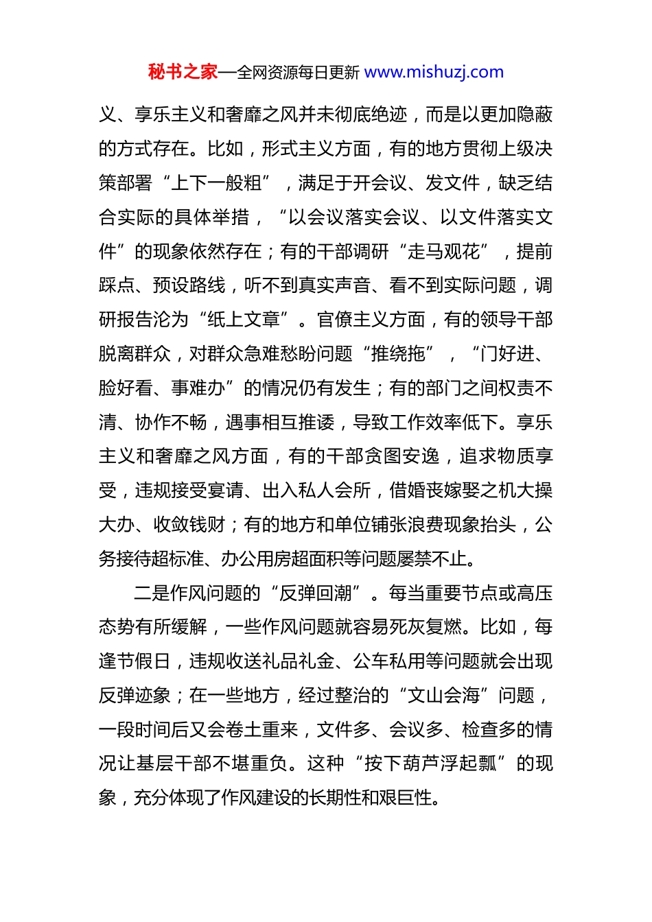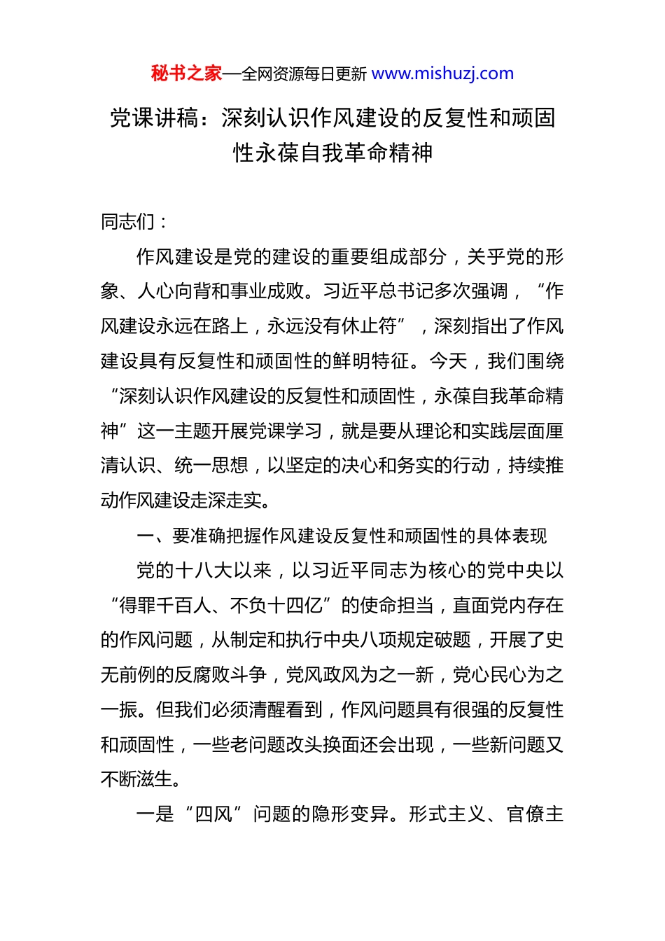秘书之家—全网资源每日更新 www.mishuzj.com党课讲稿:深刻认识作风建设的反复性和顽固性永葆自我革命精神 同志们:作风建设是党的建设的重要组成部分,关乎党的形象、人心向背和事业成败。习近平总书记多次强调,“作风建设永远在路上,永远没有休止符”,深刻指出了作风建设具有反复性和顽固性的鲜明特征。今天,我们围绕“深刻认识作风建设的反复性和顽固性,永葆自我革命精神”这一主题开展党课学习,就是要从理论和实践层面厘清认识、统一思想,以坚定的决心和务实的行动,持续推动作风建设走深走实。一、要准确把握作风建设反复性和顽固性的具体表现党的十八大以来,以习近平同志为核心的党中央以“得罪千百人、不负十四亿”的使命担当,直面党内存在的作风问题,从制定和执行中央八项规定破题,开展了史无前例的反腐败斗争,党风政风为之一新,党心民心为之一振。但我们必须清醒看到,作风问题具有很强的反复性和顽固性,一些老问题改头换面还会出现,一些新问题又不断滋生。一是“四风”问题的隐形变异。形式主义、官僚主秘书之家—全网资源每日更新 www.mishuzj.com义、享乐主义和奢靡之风并未彻底绝迹,而是以更加隐蔽的方式存在。比如,形式主义方面,有的地方贯彻上级决策部署“上下一般粗”,满足于开会议、发文件,缺乏结合实际的具体举措,“以会议落实会议、以文件落实文件”的现象依然存在;有的干部调研“走马观花”,提前踩点、预设路线,听不到真实声音、看不到实际问题,调研报告沦为“纸上文章”。官僚主义方面,有的领导干部脱离群众,对群众急难愁盼问题“推绕拖”,“门好进、脸好看、事难办”的情况仍有发生;有的部门之间权责不清、协作不畅,遇事相互推诿,导致工作效率低下。享乐主义和奢靡之风方面,有的干部贪图安逸,追求物质享受,违规接受宴请、出入私人会所,借婚丧嫁娶之机大操大办、收敛钱财;有的地方和单位铺张浪费现象抬头,公务接待超标准、办公用房超面积等问题屡禁不止。二是作风问题的“反弹回潮”。每当重要节点或高压态势有所缓解,一些作风问题就容易死灰复燃。比如,每逢节假日,违规收送礼品礼金、公车私用等问题就会出现反弹迹象;在一些地方,经过整治的“文山会海”问题,一段时间后又会卷土重来,文件多、会议多、检查多的情况让基层干部不堪重负。这种“按下葫芦浮起瓢”的现象,充分体现了作风建设的长期性和艰巨性。秘书之家—全网资源每日更新 www.mishuzj.com三是作风问题与腐败问题的交织渗透。作风问题是腐败滋生的温床,一些看似不起眼的作风问题,若不及时纠正,很容易演变成腐败问题。比如,有的干部从接受一顿饭、一条烟开始,逐渐放松警惕,最终陷入腐败的泥潭;有的地方和单位存在的“小圈子”“小团伙”,不仅助长了官僚主义、形式主义作风,还可能引发利益输送、权钱交易等腐败行为。作风问题与腐败问题相互交织,使得作风建设的难度进一步加大。二、要深刻剖析作风建设反复性和顽固性的成因作风建设之所以具有反复性和顽固性,并非偶然,而是由多种因素共同作用的结果。只有深刻剖析其成因,才能找准破解难题的关键,推动作风建设取得实效。(一)从思想根源来看,理想信念动摇是作风问题反复的根本原因。习近平总书记指出,“理想信念就是共产党人精神上的‘钙’,没有理想信念,理想信念不坚定,精神上就会‘缺钙’,就会得‘软骨病’”。一些党员干部之所以出现作风问题,根本上是因为理想信念滑坡,世界观、人生观、价值观出现偏差。他们把个人利益放在首位,忽视党的宗旨和人民的利益,追求个人享乐、特权待遇,从而导致形式主义、官僚主义、享乐主义和奢靡之风等问题滋生蔓延。同时,一些党员干部存在侥幸心理,认秘书之家—全网资源每日更新 www.mishuzj.com为作风问题“小事一桩”,不会被发现,或者觉得“法不责众”,在高压态势下仍敢顶风违纪,这也使得作风问题难以彻底根治。(二)从制度层面来看,制度不完善、执行不到位是作风问题顽固的重要原因。虽然我们已经建立了一系列关于作风建设的制度规定,如中央八项规定及其实施细则、公务接待管理办法、公车使用管理规定等,但部分制度还存...
