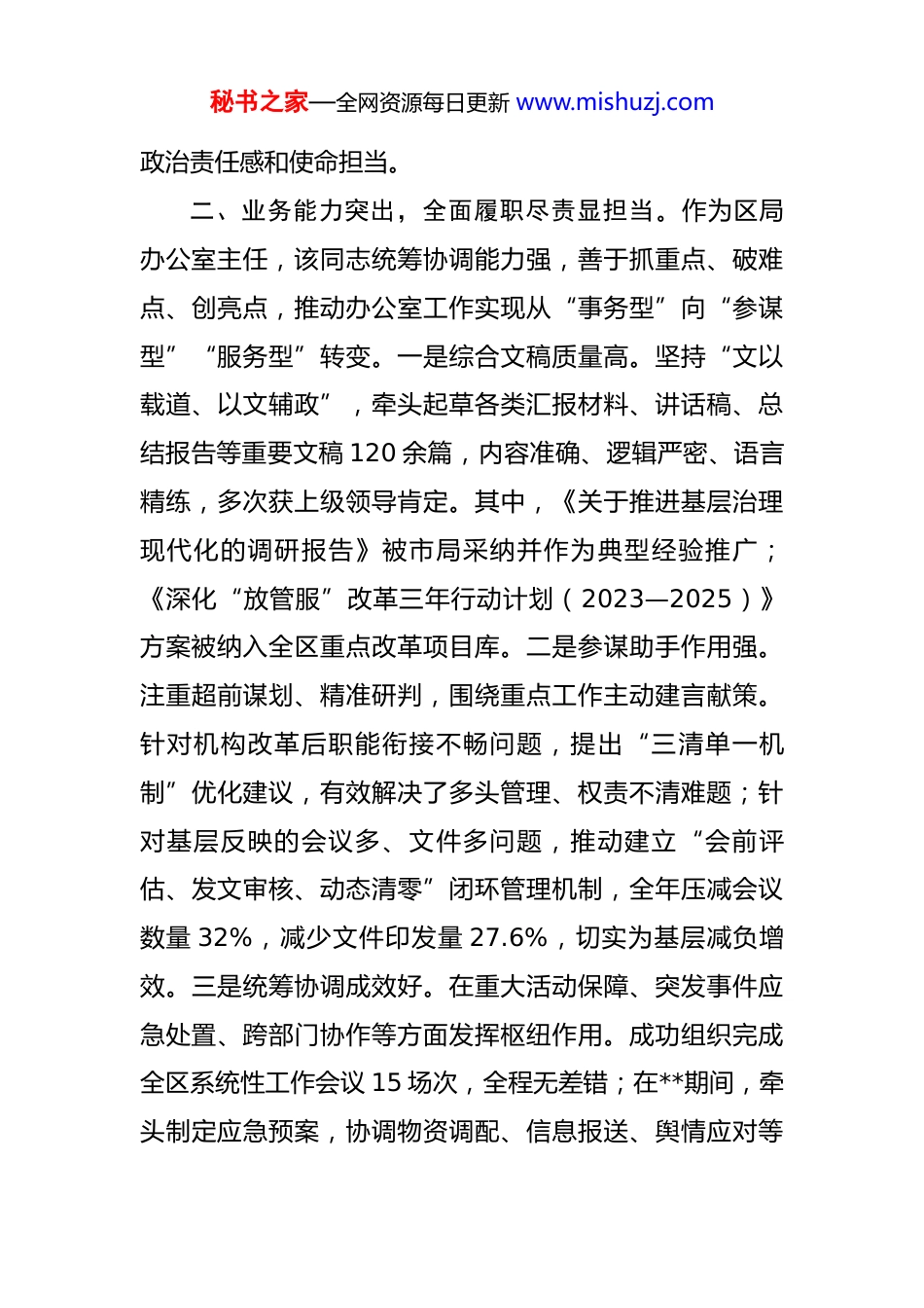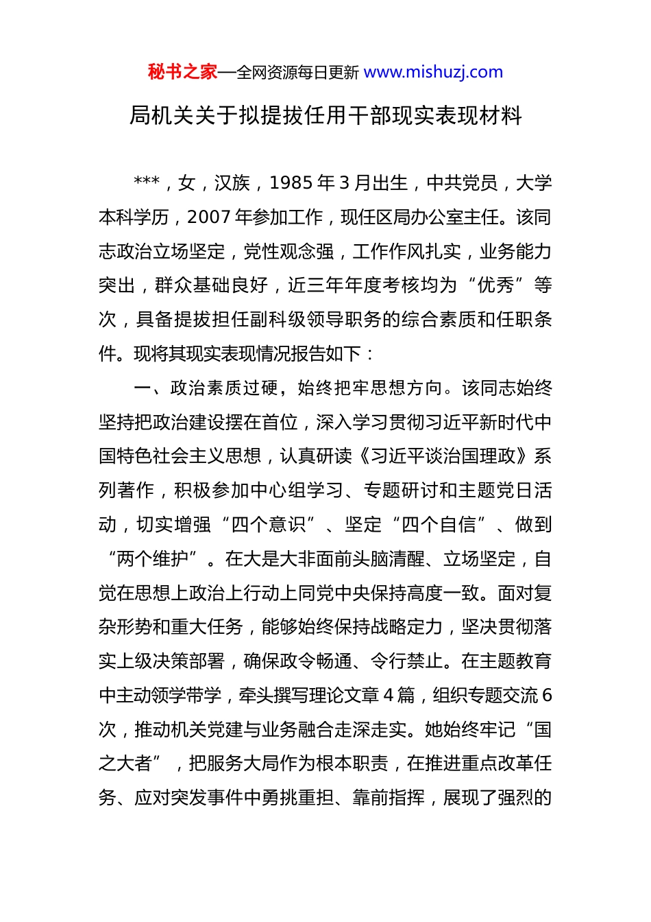 秘书之家—全网资源每日更新 www.mishuzj.com局机关关于拟提拔任用干部现实表现材料 ***,女,汉族,1985 年 3 月出生,中共党员,大学本科学历,2007 年参加工作,现任区局办公室主任。该同志政治立场坚定,党性观念强,工作作风扎实,业务能力突出,群众基础良好,近三年年度考核均为“优秀”等次,具备提拔担任副科级领导职务的综合素质和任职条件。现将其现实表现情况报告如下:一、政治素质过硬,始终把牢思想方向。该同志始终坚持把政治建设摆在首位,深入学习贯彻习近平新时代中国特色社会主义思想,认真研读《习近平谈治国理政》系列著作,积极参加中心组学习、专题研讨和主题党日活动,切实增强“四个意识”、坚定“四个自信”、做到“两个维护”。在大是大非面前头脑清醒、立场坚定,自觉在思想上政治上行动上同党中央保持高度一致。面对复杂形势和重大任务,能够始终保持战略定力,坚决贯彻落实上级决策部署,确保政令畅通、令行禁止。在主题教育中主动领学带学,牵头撰写理论文章 4 篇,组织专题交流 6次,推动机关党建与业务融合走深走实。她始终牢记“国之大者”,把服务大局作为根本职责,在推进重点改革任务、应对突发事件中勇挑重担、靠前指挥,展现了强烈的秘书之家—全网资源每日更新 www.mishuzj.com政治责任感和使命担当。二、业务能力突出,全面履职尽责显担当。作为区局办公室主任,该同志统筹协调能力强,善于抓重点、破难点、创亮点,推动办公室工作实现从“事务型”向“参谋型”“服务型”转变。一是综合文稿质量高。坚持“文以载道、以文辅政”,牵头起草各类汇报材料、讲话稿、总结报告等重要文稿 120 余篇,内容准确、逻辑严密、语言精练,多次获上级领导肯定。其中,《关于推进基层治理现代化的调研报告》被市局采纳并作为典型经验推广;《深化“放管服”改革三年行动计划(2023—2025)》方案被纳入全区重点改革项目库。二是参谋助手作用强。注重超前谋划、精准研判,围绕重点工作主动建言献策。针对机构改革后职能衔接不畅问题,提出“三清单一机制”优化建议,有效解决了多头管理、权责不清难题;针对基层反映的会议多、文件多问题,推动建立“会前评估、发文审核、动态清零”闭环管理机制,全年压减会议数量 32%,减少文件印发量 27.6%,切实为基层减负增效。三是统筹协调成效好。在重大活动保障、突发事件应急处置、跨部门协作等方面发挥枢纽作用。成功组织完成全区系统性工作会议 15 场次,全程无差错;在**期间,牵头制定应急预案,协调物资调配、信息报送、舆情应对等秘书之家—全网资源每日更新 www.mishuzj.com工作,确保系统运行平稳有序,获区委通报表扬。三、工作作风务实,敬业奉献赢得口碑。该同志始终秉持“严、细、实”的工作作风,坚持高标准、严要求,做到事不过夜、案无积压。无论是日常办文办会,还是处理急难险重任务,都展现出极高的专业素养和敬业精神。她长期坚持“白加黑”“5+2”工作模式,加班加点成为常态,累计超时工作超 1200 小时,但从不抱怨。对来信来访、来电咨询,坚持热情接待、耐心解答,做到件件有回音、事事有着落。在一次群众反映行政审批流程繁琐的问题中,她连夜梳理流程图、比对政策依据,提出“一窗受理、集成服务”改革建议,推动审批时限压缩 40%以上,群众满意度大幅提升。她还主动结对帮扶困难职工家庭 3户,定期走访慰问,帮助解决子女入学、医疗救助等实际困难,体现了深厚的为民情怀。同事普遍评价她“业务精通、待人真诚、甘于奉献”,在干部职工中具有较高威信。四、廉洁自律严格,清正廉洁树立形象。该同志始终绷紧纪律规矩这根弦,严格遵守中央八项规定及其实施细则精神,自觉净化社交圈、生活圈、朋友圈。在公务活动中坚持原则、秉公办事,从未利用职权谋取私利。严格执行财务管理制度,规范报销程序,杜绝违规支出。个人重秘书之家—全网资源每日更新 www.mishuzj.com大事项均按规定如实报告,未发现任何违纪违法问题。她注重家风建设,教育亲属遵纪守法,生活俭朴,作风正派,始终保持共产党人的政治本色。在廉政谈话中,她表示:“权力是人民赋予的,必须用来为...