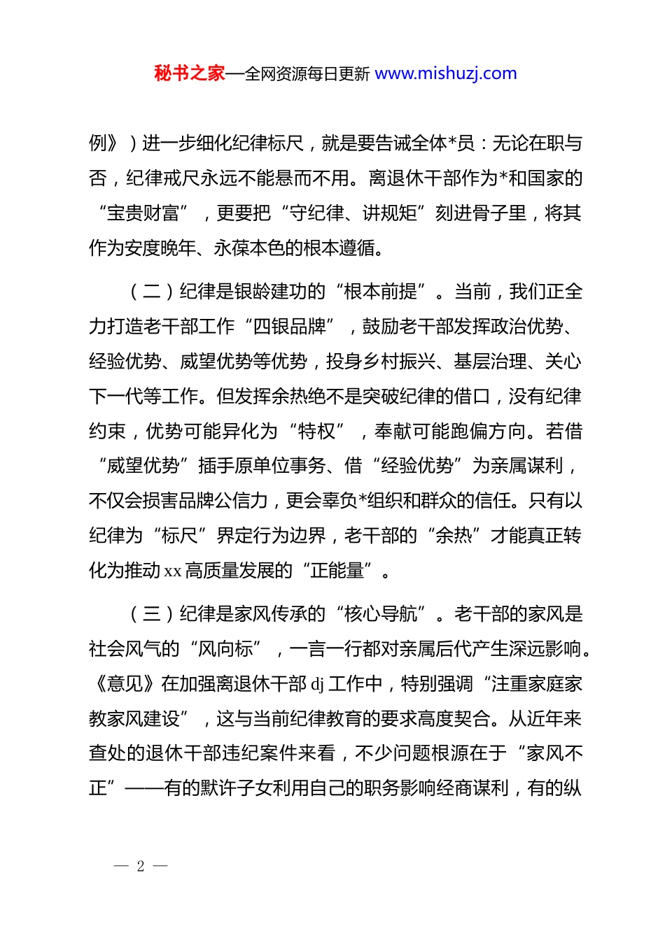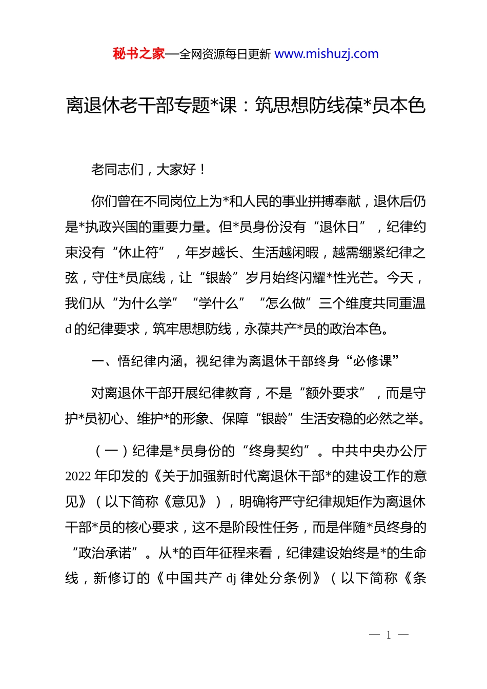 秘书之家—全网资源每日更新 www.mishuzj.com离退休老干部专题*课:筑思想防线葆*员本色老同志们,大家好!你们曾在不同岗位上为*和人民的事业拼搏奉献,退休后仍是*执政兴国的重要力量。但*员身份没有“退休日”,纪律约束没有“休止符”,年岁越长、生活越闲暇,越需绷紧纪律之弦,守住*员底线,让“银龄”岁月始终闪耀*性光芒。今天,我们从“为什么学”“学什么”“怎么做”三个维度共同重温d 的纪律要求,筑牢思想防线,永葆共产*员的政治本色。一、悟纪律内涵,视纪律为离退休干部终身“必修课”对离退休干部开展纪律教育,不是“额外要求”,而是守护*员初心、维护*的形象、保障“银龄”生活安稳的必然之举。(一)纪律是*员身份的“终身契约”。中共中央办公厅2022 年印发的《关于加强新时代离退休干部*的建设工作的意见》(以下简称《意见》),明确将严守纪律规矩作为离退休干部*员的核心要求,这不是阶段性任务,而是伴随*员终身的“政治承诺”。从*的百年征程来看,纪律建设始终是*的生命线,新修订的《中国共产 dj 律处分条例》(以下简称《条— 1 —秘书之家—全网资源每日更新 www.mishuzj.com例》)进一步细化纪律标尺,就是要告诫全体*员:无论在职与否,纪律戒尺永远不能悬而不用。离退休干部作为*和国家的“宝贵财富”,更要把“守纪律、讲规矩”刻进骨子里,将其作为安度晚年、永葆本色的根本遵循。(二)纪律是银龄建功的“根本前提”。当前,我们正全力打造老干部工作“四银品牌”,鼓励老干部发挥政治优势、经验优势、威望优势等优势,投身乡村振兴、基层治理、关心下一代等工作。但发挥余热绝不是突破纪律的借口,没有纪律约束,优势可能异化为“特权”,奉献可能跑偏方向。若借“威望优势”插手原单位事务、借“经验优势”为亲属谋利,不仅会损害品牌公信力,更会辜负*组织和群众的信任。只有以纪律为“标尺”界定行为边界,老干部的“余热”才能真正转化为推动 xx 高质量发展的“正能量”。(三)纪律是家风传承的“核心导航”。老干部的家风是社会风气的“风向标”,一言一行都对亲属后代产生深远影响。《意见》在加强离退休干部 dj 工作中,特别强调“注重家庭家教家风建设”,这与当前纪律教育的要求高度契合。从近年来查处的退休干部违纪案件来看,不少问题根源在于“家风不正”——有的默许子女利用自己的职务影响经商谋利,有的纵— 2 —秘书之家—全网资源每日更新 www.mishuzj.com容亲属违规获取利益,最终自己晚节不保,更带坏了家庭风气。反观“草鞋书记”杨善洲,退休后仍坚守“不占公家一分便宜”的纪律底线,不仅自己成为榜样,更让“公私分明、崇廉拒腐”的家风代代相传。这充分说明,管好家人、树好家风,既是纪律要求,更是老干部的责任担当。二、严守纪律底线,做遵守守纪的离退休干部全体离退休干部必须严守纪律规矩,做到知敬畏、存戒惧守底线。(一)严守政治纪律,筑牢信仰“定盘星”。政治纪律是最重要、最根本、最关键的纪律,核心是做到“两个坚决、一个自觉”。一是坚决同*中央保持高度一致。要始终恪守“五个必须”(必须维护*中央权威、必须维护*的团结、必须遵循组织程序、必须服从组织决定、必须管好亲属和身边工作人员),杜绝“人退休、思想滑坡”的错误倾向。要清醒认识到,“不在岗”不等于可以“不讲政治”。*员身份没有“退休日”,政治忠诚更无“休止符”。无论是否离开工作岗位,都必须始终牢记第一身份是共产*员,自觉在思想上政治上行动上同*中央保持高度一致,以实际行动践行对*的忠诚承诺。二是坚决杜绝政治偏差。《意见》明确规定,离退休干部*员“不得妄议*中— 3 —秘书之家—全网资源每日更新 www.mishuzj.com央大政方针,不得传播政治性负面言论”。大家必须严格遵守《中国共产**员网络行为规定》及自治区关于*组织和*员在网络空间的行为规范,不发布未经证实的信息、不转发来源不明的内容、不造谣传谣信谣,自觉维护清朗网络空间和良好政治生态。现实中,个别老同志对政治纪律的严肃性认识不足,把“随口议论”当成“无伤大雅”,有的在亲友聚会中随意评论*中央决策部署,看似“随口...