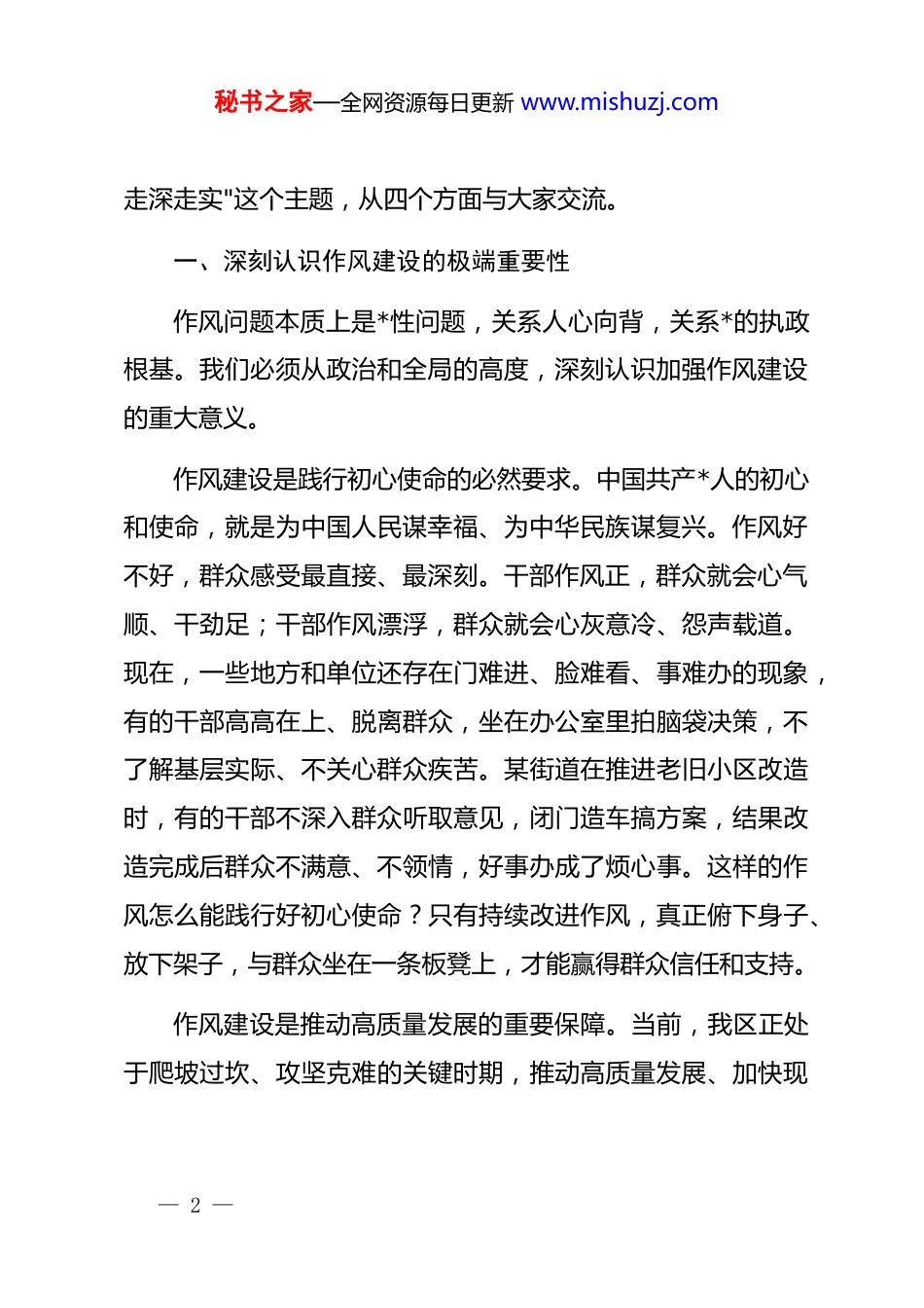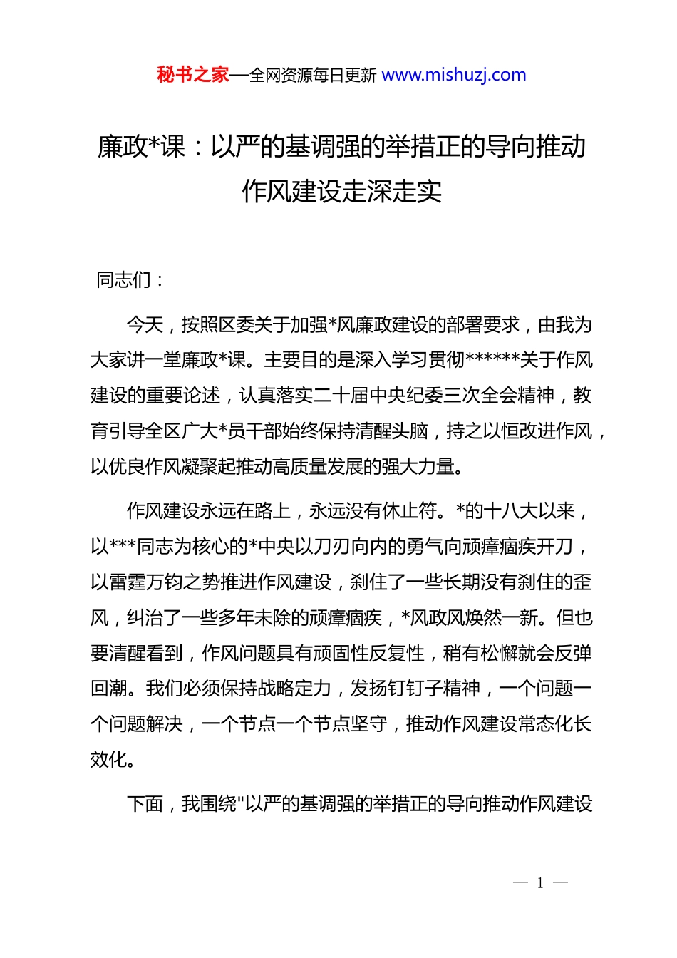 秘书之家—全网资源每日更新 www.mishuzj.com廉政*课:以严的基调强的举措正的导向推动作风建设走深走实 同志们:今天,按照区委关于加强*风廉政建设的部署要求,由我为大家讲一堂廉政*课。主要目的是深入学习贯彻******关于作风建设的重要论述,认真落实二十届中央纪委三次全会精神,教育引导全区广大*员干部始终保持清醒头脑,持之以恒改进作风,以优良作风凝聚起推动高质量发展的强大力量。作风建设永远在路上,永远没有休止符。*的十八大以来,以***同志为核心的*中央以刀刃向内的勇气向顽瘴痼疾开刀,以雷霆万钧之势推进作风建设,刹住了一些长期没有刹住的歪风,纠治了一些多年未除的顽瘴痼疾,*风政风焕然一新。但也要清醒看到,作风问题具有顽固性反复性,稍有松懈就会反弹回潮。我们必须保持战略定力,发扬钉钉子精神,一个问题一个问题解决,一个节点一个节点坚守,推动作风建设常态化长效化。下面,我围绕"以严的基调强的举措正的导向推动作风建设— 1 —秘书之家—全网资源每日更新 www.mishuzj.com走深走实"这个主题,从四个方面与大家交流。一、深刻认识作风建设的极端重要性作风问题本质上是*性问题,关系人心向背,关系*的执政根基。我们必须从政治和全局的高度,深刻认识加强作风建设的重大意义。作风建设是践行初心使命的必然要求。中国共产*人的初心和使命,就是为中国人民谋幸福、为中华民族谋复兴。作风好不好,群众感受最直接、最深刻。干部作风正,群众就会心气顺、干劲足;干部作风漂浮,群众就会心灰意冷、怨声载道。现在,一些地方和单位还存在门难进、脸难看、事难办的现象,有的干部高高在上、脱离群众,坐在办公室里拍脑袋决策,不了解基层实际、不关心群众疾苦。某街道在推进老旧小区改造时,有的干部不深入群众听取意见,闭门造车搞方案,结果改造完成后群众不满意、不领情,好事办成了烦心事。这样的作风怎么能践行好初心使命?只有持续改进作风,真正俯下身子、放下架子,与群众坐在一条板凳上,才能赢得群众信任和支持。作风建设是推动高质量发展的重要保障。当前,我区正处于爬坡过坎、攻坚克难的关键时期,推动高质量发展、加快现— 2 —秘书之家—全网资源每日更新 www.mishuzj.com代化建设,需要广大*员干部担当作为、真抓实干。但一些干部身上还存在不愿为、不敢为、不会为的问题。不愿为,就是缺乏事业心责任感,当一天和尚撞一天钟,做太平官、当甩手掌柜;不敢为,就是怕担风险、怕负责任,遇到矛盾绕着走、碰到困难往后退;不会为,就是能力不足、本领恐慌,面对新情况新问题束手无策、无从下手。某部门在优化营商环境工作中,有的干部面对企业诉求推诿扯皮,有的对政策一知半解却装模作样,导致×家企业反映问题长期得不到解决,严重影响了政府公信力。推动高质量发展,等不得、慢不得、拖不得,必须以过硬作风破解发展难题、激发发展活力。作风建设是全面从严治*的重要抓手。作风问题绝非小事,往往是腐败问题的温床。许多违纪违法案件表明,一些*员干部就是从作风不正开始,逐步滑向违纪违法深渊的。享乐主义、奢靡之风背后,往往隐藏着利益输送、权钱交易;形式主义、官僚主义背后,往往伴随着失职渎职、滥用职权。我区查处的某单位原负责人违纪违法案件,就是从收受礼品礼金、接受宴请开始,逐步发展到利用职权为他人谋取利益、收受巨额贿赂,最终走上不归路。这充分说明,作风问题绝不是小节,小节不守,大节难保。只有驰而不息抓作风,才能形成风清气正的政— 3 —秘书之家—全网资源每日更新 www.mishuzj.com治生态。二、准确把握当前作风建设面临的突出问题近年来,全区作风建设取得明显成效,但对照*中央要求、对照群众期盼,仍然存在不小差距和问题。我们必须坚持问题导向,敢于直面问题、勇于解决问题。形式主义仍然突出,花拳绣腿做表面文章。有的单位以会议落实会议、以文件落实文件,一项工作层层开会、反复发文,基层疲于应付。某部门一年召开各类会议×次,下发文件×份,基层干部反映"天天开会、月月写材料,真正干事的时间少了"。有的热衷于搞"材料政绩""数字政绩",工作干得如何不重要,材料写得漂亮就...