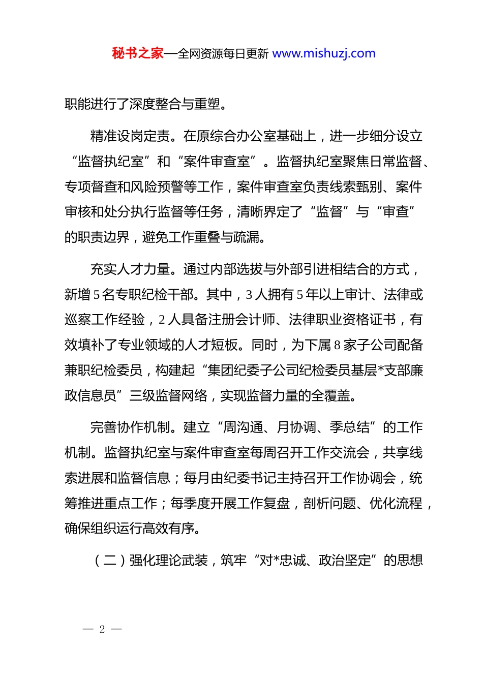 秘书之家—全网资源每日更新 www.mishuzj.com公司纪委关于纪检监察工作“三化”建设年行动的阶段性工作总结自纪检监察工作规范化、法治化、正规化(以下简称“三化”)建设年行动全面铺开以来,[集团名称]有限公司纪委以高度的政治自觉,主动扛起使命担当,严格依照上级纪委监委和公司*委的部署要求,将“三化”建设作为推动纪检监察工作高质量发展的关键举措。通过自我革新、靶向发力,公司纪检监察工作实现了从“粗放管理”向“精细运作”转变,从“传统模式”向“现代治理”升级。现将阶段性工作成果、实践经验及后续规划总结如下。一、聚焦队伍专业化,打造忠诚担当纪检尖兵纪检监察队伍作为“三化”建设的主力军,公司纪委秉持“政治引领、能力锻造、作风锤炼”的培养原则,多维度提升队伍素养,为“三化”建设提供坚实的人才支撑。(一)优化组织架构,搭建“分工明确、协同顺畅”的工作格局随着公司业务版图的拓展和管理架构的优化,纪委对内部— 1 —秘书之家—全网资源每日更新 www.mishuzj.com职能进行了深度整合与重塑。精准设岗定责。在原综合办公室基础上,进一步细分设立“监督执纪室”和“案件审查室”。监督执纪室聚焦日常监督、专项督查和风险预警等工作,案件审查室负责线索甄别、案件审核和处分执行监督等任务,清晰界定了“监督”与“审查”的职责边界,避免工作重叠与疏漏。充实人才力量。通过内部选拔与外部引进相结合的方式,新增 5 名专职纪检干部。其中,3 人拥有 5 年以上审计、法律或巡察工作经验,2 人具备注册会计师、法律职业资格证书,有效填补了专业领域的人才短板。同时,为下属 8 家子公司配备兼职纪检委员,构建起“集团纪委子公司纪检委员基层*支部廉政信息员”三级监督网络,实现监督力量的全覆盖。完善协作机制。建立“周沟通、月协调、季总结”的工作机制。监督执纪室与案件审查室每周召开工作交流会,共享线索进展和监督信息;每月由纪委书记主持召开工作协调会,统筹推进重点工作;每季度开展工作复盘,剖析问题、优化流程,确保组织运行高效有序。(二)强化理论武装,筑牢“对*忠诚、政治坚定”的思想— 2 —秘书之家—全网资源每日更新 www.mishuzj.com防线公司纪委始终将政治建设摆在首位,通过理论学习提升纪检干部的政治素养和履职能力。突出“第一议题”学习。将学习******关于全面从严治*、*风廉政建设和反腐败斗争的重要论述作为纪委会议的首要内容,全年累计开展专题学习 12 次,组织研讨交流 4 场。引导纪检干部深刻领会“两个确立”的决定性意义,自觉将“两个维护”贯穿于监督执纪全过程。开展专项纪律教育。围绕中央八项规定及其实施细则精神纪检监察干部行为规范等纪律要求,开展为期 3 个月的“纪律作风整顿”活动。通过观看警示教育片《正风反腐就在身边》、参观廉政教育基地、撰写心得体会等形式,促使干部对照检查“是否存在担当意识不足、监督乏力、执纪宽松软”等 5 类问题,建立个人整改台账 32 份,完成整改问题 48 项。提升政治能力水平。结合公司*委“政治能力提升工程”,选派纪检干部参加*委理论学习中心组学习 6 次,组织“纪检干部讲*课”活动 8 场。通过“学、讲、用”相结合,提高干部运用政治理论分析和解决实际问题的能力。— 3 —秘书之家—全网资源每日更新 www.mishuzj.com(三)加强实战锻炼,提升“依规执纪、精准监督”的专业技能公司纪委坚持“实践出真知”的理念,通过多渠道实战平台提升干部的业务能力。推行“实战实训”模式。与上级纪委监委建立“人才共育”机制,选派 6 名年轻干部参与上级交办的国企领域腐败案件查办工作,全程参与线索核查、谈话函询、证据收集等环节。同时,安排干部参与公司内部巡察、采购专项审计等工作,累计参与实战任务 18 人次,其中 3 人成长为业务骨干。开展“专业化”业务培训。围绕纪检监察法规、业务操作等核心内容,制定年度培训计划。先后邀请上级纪委监委业务专家、高校法学教授开展《监察法解读》《案件证据收集与审查》《招投标监督要点》等专题培训 7 场,培训覆盖 260 余人次。编制《纪检监察工作实用...