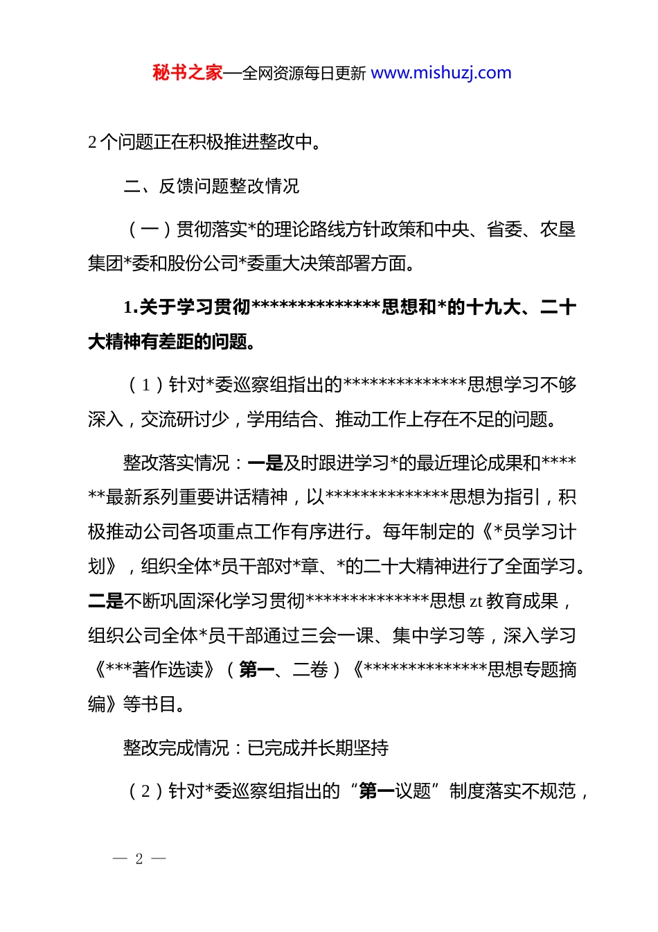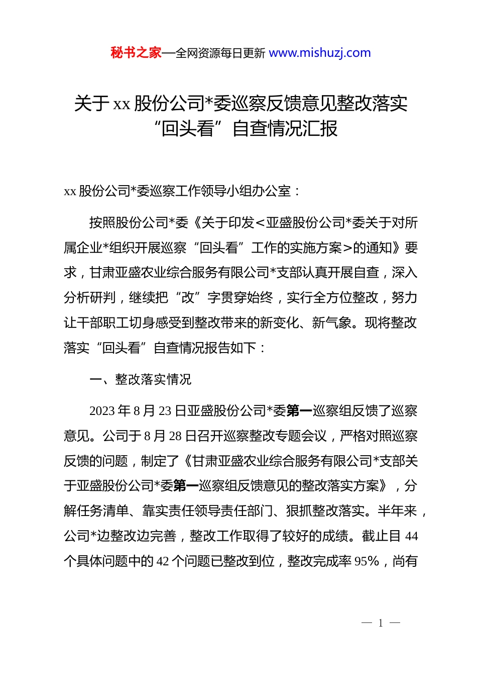 秘书之家—全网资源每日更新 www.mishuzj.com关于 xx 股份公司*委巡察反馈意见整改落实“回头看”自查情况汇报xx 股份公司*委巡察工作领导小组办公室:按照股份公司*委《关于印发<亚盛股份公司*委关于对所属企业*组织开展巡察“回头看”工作的实施方案>的通知》要求,甘肃亚盛农业综合服务有限公司*支部认真开展自查,深入分析研判,继续把“改”字贯穿始终,实行全方位整改,努力让干部职工切身感受到整改带来的新变化、新气象。现将整改落实“回头看”自查情况报告如下:一、整改落实情况 2023 年 8 月 23 日亚盛股份公司*委第一巡察组反馈了巡察意见。公司于 8 月 28 日召开巡察整改专题会议,严格对照巡察反馈的问题,制定了《甘肃亚盛农业综合服务有限公司*支部关于亚盛股份公司*委第一巡察组反馈意见的整改落实方案》,分解任务清单、靠实责任领导责任部门、狠抓整改落实。半年来,公司*边整改边完善,整改工作取得了较好的成绩。截止目 44个具体问题中的 42 个问题已整改到位,整改完成率 95%,尚有— 1 —秘书之家—全网资源每日更新 www.mishuzj.com2 个问题正在积极推进整改中。二、反馈问题整改情况(一)贯彻落实*的理论路线方针政策和中央、省委、农垦集团*委和股份公司*委重大决策部署方面。1.关于学习贯彻**************思想和*的十九大、二十大精神有差距的问题。(1)针对*委巡察组指出的**************思想学习不够深入,交流研讨少,学用结合、推动工作上存在不足的问题。整改落实情况:一是及时跟进学习*的最近理论成果和******最新系列重要讲话精神,以**************思想为指引,积极推动公司各项重点工作有序进行。每年制定的《*员学习计划》,组织全体*员干部对*章、*的二十大精神进行了全面学习。二是不断巩固深化学习贯彻**************思想 zt 教育成果,组织公司全体*员干部通过三会一课、集中学习等,深入学习《***著作选读》(第一、二卷)《**************思想专题摘编》等书目。整改完成情况:已完成并长期坚持(2)针对*委巡察组指出的“第一议题”制度落实不规范,— 2 —秘书之家—全网资源每日更新 www.mishuzj.com支部在 2022 年 4 月建立《第一议题制度》,同年 6 月支部会议仍将第一议题列为会议议程第二项的问题。整改落实情况:修订印发了《甘肃亚盛农业综合服务有限公司*支部“第一议题”制度》,把**************思想,******最新发表的重要讲话、重要文章和作出的****批示列为“第一议题”学习内容,采取原文学习、专题辅导、交流研讨等多种方式推动学习走深走实。整改完成情况:已完成并长期坚持(3)针对*委巡察组指出的部分*员干部学习的主动性不够,未能处理好工学矛盾。在学习贯彻**************思想 zt 教育中,未按要求学习《***著作选读》一、二卷和《**************思想专题摘编》《*章》等必读书目,部分*员干部 2023 年学习笔记不足 2000 字,个别*员对“两个确立”“两个维护”“三抓三促”等应知应会知识不掌握的问题。整改落实情况:一是严格落实股份公司*委印发的《关于进一步巩固深化学习贯彻**************思想 zt 教育成果的通知》的文件要求,将《*章》《***著作选读》(第一、二卷)《**************思想专题摘编》《**************思想学习— 3 —秘书之家—全网资源每日更新 www.mishuzj.com纲要》等必读书目列入*员重点学习内容,通过集中学习和自学的方式,组织公司全体*员进行了学习。二是公司定期、不定期对公司全体*员的*员学习笔记进行了检查,并开展了*员干部应知应会知识测试,达到以考促学的目的,进一步激发干部职工学习的积极性和主动性,在公司形成能力大提升、作风大转变的浓厚氛围。整改完成情况:已完成并长期坚持2.关于贯彻落实上级*委决策部署不到位的问题。(4)针对上级工作部署存在应付现象的问题。如:2021年贯彻落实国有企业*的建设工作会议精神“回头看”工作台账涉嫌抄袭好食邦公司工作台账内容,未联系自身实际认真进行研究。整改落实情况:一是结合公司工作实际,对 2021 年贯彻落实国有企业*的建设工作会议精神“回头看”工作台账进...