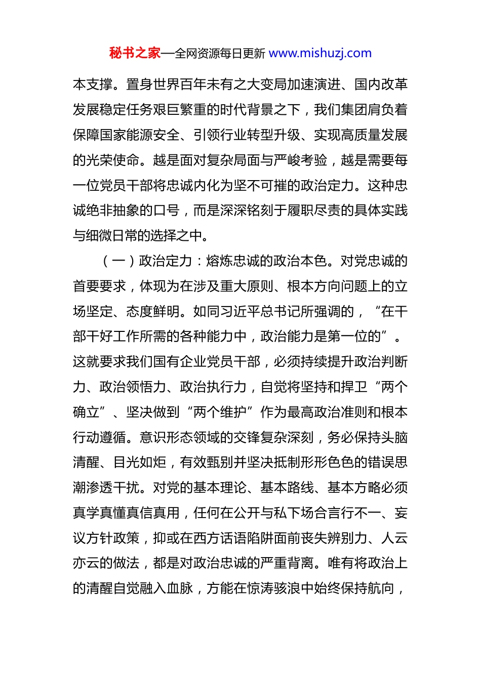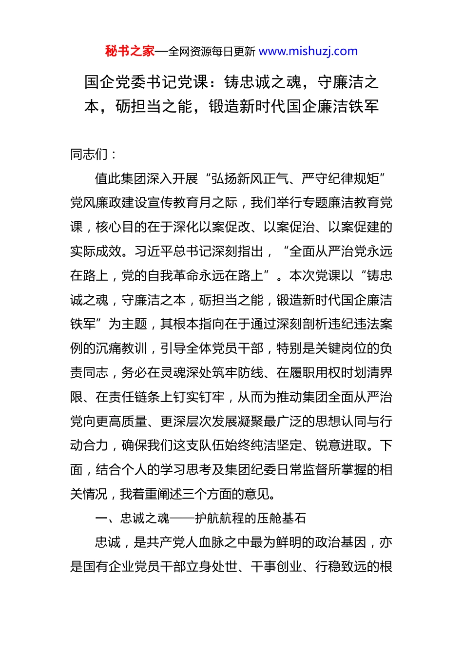 秘书之家—全网资源每日更新 www.mishuzj.com国企党委书记党课:铸忠诚之魂,守廉洁之本,砺担当之能,锻造新时代国企廉洁铁军 同志们:值此集团深入开展“弘扬新风正气、严守纪律规矩”党风廉政建设宣传教育月之际,我们举行专题廉洁教育党课,核心目的在于深化以案促改、以案促治、以案促建的实际成效。习近平总书记深刻指出,“全面从严治党永远在路上,党的自我革命永远在路上”。本次党课以“铸忠诚之魂,守廉洁之本,砺担当之能,锻造新时代国企廉洁铁军”为主题,其根本指向在于通过深刻剖析违纪违法案例的沉痛教训,引导全体党员干部,特别是关键岗位的负责同志,务必在灵魂深处筑牢防线、在履职用权时划清界限、在责任链条上钉实钉牢,从而为推动集团全面从严治党向更高质量、更深层次发展凝聚最广泛的思想认同与行动合力,确保我们这支队伍始终纯洁坚定、锐意进取。下面,结合个人的学习思考及集团纪委日常监督所掌握的相关情况,我着重阐述三个方面的意见。一、忠诚之魂——护航航程的压舱基石忠诚,是共产党人血脉之中最为鲜明的政治基因,亦是国有企业党员干部立身处世、干事创业、行稳致远的根秘书之家—全网资源每日更新 www.mishuzj.com本支撑。置身世界百年未有之大变局加速演进、国内改革发展稳定任务艰巨繁重的时代背景之下,我们集团肩负着保障国家能源安全、引领行业转型升级、实现高质量发展的光荣使命。越是面对复杂局面与严峻考验,越是需要每一位党员干部将忠诚内化为坚不可摧的政治定力。这种忠诚绝非抽象的口号,而是深深铭刻于履职尽责的具体实践与细微日常的选择之中。(一)政治定力:熔炼忠诚的政治本色。对党忠诚的首要要求,体现为在涉及重大原则、根本方向问题上的立场坚定、态度鲜明。如同习近平总书记所强调的,“在干部干好工作所需的各种能力中,政治能力是第一位的”。这就要求我们国有企业党员干部,必须持续提升政治判断力、政治领悟力、政治执行力,自觉将坚持和捍卫“两个确立”、坚决做到“两个维护”作为最高政治准则和根本行动遵循。意识形态领域的交锋复杂深刻,务必保持头脑清醒、目光如炬,有效甄别并坚决抵制形形色色的错误思潮渗透干扰。对党的基本理论、基本路线、基本方略必须真学真懂真信真用,任何在公开与私下场合言行不一、妄议方针政策,抑或在西方话语陷阱面前丧失辨别力、人云亦云的做法,都是对政治忠诚的严重背离。唯有将政治上的清醒自觉融入血脉,方能在惊涛骇浪中始终保持航向,秘书之家—全网资源每日更新 www.mishuzj.com使忠诚化作集团应对一切风险挑战最坚实的“压舱石”。(二)信仰守恒:淬炼忠诚的初心纯度。忠诚的政治品质,往往在个人发展遭遇瓶颈、现实利益受到触动时迎来最严苛的试炼。党员干部并非生活在真空之中,工作失意、职位调整、生活变故难免带来心理波动。然而,真正的忠诚者,当如习近平总书记所教诲,“把个人生死名利置之度外”,始终不忘为民初心与入党誓言。现实中,少数干部在顺境时踌躇满志,一旦个人期许落空、工作受到批评或面临家庭困难,便滋生抱怨甚至怨恨情绪,将组织的培养恩情抛诸脑后,自感“被亏欠”,进而将情绪化为放纵享乐的借口,将挫折当作腐化堕落的起点,此心态极度危险。必须深刻认识到,党纪国法具有刚性约束,不会因个人的“委屈”、“失落”而有丝毫弹性;人民对于公职人员的清正廉洁期待也绝不会因个体情绪而降低。真正的忠诚,是身处逆境而信仰弥坚,蒙受委屈仍重任在肩,始终将党性原则置于个人荣辱得失之上,永葆共产党人的赤子之心与纯粹本色。(三)言行一致:砥砺忠诚的实践光芒。忠诚的最高境界,在于表里如一的纯粹性与彻底性。检验一名党员干部是否忠诚,最终标准是实际行动而非华丽辞藻,是台前幕后的统一而非口是心非的表演。必须坚决破除“两面秘书之家—全网资源每日更新 www.mishuzj.com人”现象,做到人前人后如一、公开私下如一、言出行随如一、工作内外如一。任何形式的台上一套、台下一套,嘴上“马列”、心里“利己”,抑或将庸俗“江湖”规则侵蚀组织原则的行为,其本质都是对组织的背叛,对党的形象的严重伤害。习近平总书记强调,...