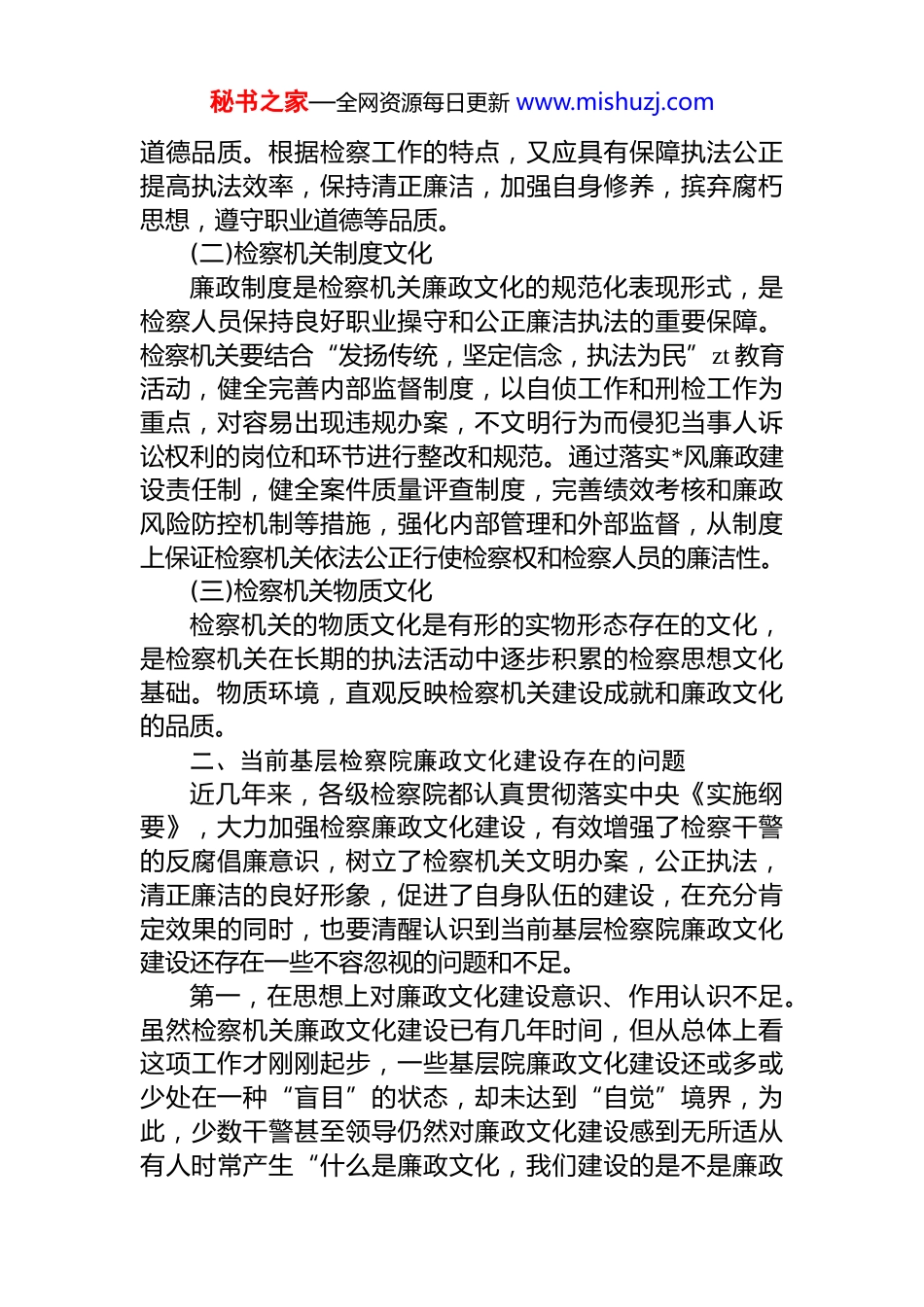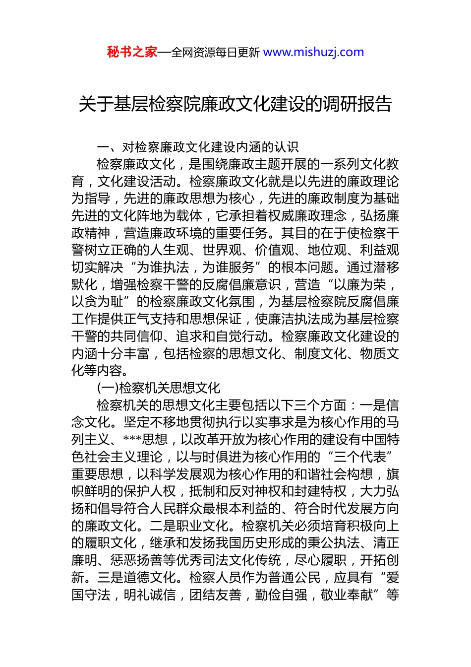 秘书之家—全网资源每日更新 www.mishuzj.com关于基层检察院廉政文化建设的调研报告一、对检察廉政文化建设内涵的认识检察廉政文化,是围绕廉政主题开展的一系列文化教育,文化建设活动。检察廉政文化就是以先进的廉政理论为指导,先进的廉政思想为核心,先进的廉政制度为基础先进的文化阵地为载体,它承担着权威廉政理念,弘扬廉政精神,营造廉政环境的重要任务。其目的在于使检察干警树立正确的人生观、世界观、价值观、地位观、利益观切实解决“为谁执法,为谁服务”的根本问题。通过潜移默化,增强检察干警的反腐倡廉意识,营造“以廉为荣,以贪为耻”的检察廉政文化氛围,为基层检察院反腐倡廉工作提供正气支持和思想保证,使廉洁执法成为基层检察干警的共同信仰、追求和自觉行动。检察廉政文化建设的内涵十分丰富,包括检察的思想文化、制度文化、物质文化等内容。(一)检察机关思想文化检察机关的思想文化主要包括以下三个方面:一是信念文化。坚定不移地贯彻执行以实事求是为核心作用的马列主义、***思想,以改革开放为核心作用的建设有中国特色社会主义理论,以与时俱进为核心作用的“三个代表”重要思想,以科学发展观为核心作用的和谐社会构想,旗帜鲜明的保护人权,抵制和反对神权和封建特权,大力弘扬和倡导符合人民群众最根本利益的、符合时代发展方向的廉政文化。二是职业文化。检察机关必须培育积极向上的履职文化,继承和发扬我国历史形成的秉公执法、清正廉明、惩恶扬善等优秀司法文化传统,尽心履职,开拓创新。三是道德文化。检察人员作为普通公民,应具有“爱国守法,明礼诚信,团结友善,勤俭自强,敬业奉献”等秘书之家—全网资源每日更新 www.mishuzj.com道德品质。根据检察工作的特点,又应具有保障执法公正提高执法效率,保持清正廉洁,加强自身修养,摈弃腐朽思想,遵守职业道德等品质。(二)检察机关制度文化廉政制度是检察机关廉政文化的规范化表现形式,是检察人员保持良好职业操守和公正廉洁执法的重要保障。检察机关要结合“发扬传统,坚定信念,执法为民”zt 教育活动,健全完善内部监督制度,以自侦工作和刑检工作为重点,对容易出现违规办案,不文明行为而侵犯当事人诉讼权利的岗位和环节进行整改和规范。通过落实*风廉政建设责任制,健全案件质量评查制度,完善绩效考核和廉政风险防控机制等措施,强化内部管理和外部监督,从制度上保证检察机关依法公正行使检察权和检察人员的廉洁性。(三)检察机关物质文化检察机关的物质文化是有形的实物形态存在的文化,是检察机关在长期的执法活动中逐步积累的检察思想文化基础。物质环境,直观反映检察机关建设成就和廉政文化的品质。二、当前基层检察院廉政文化建设存在的问题近几年来,各级检察院都认真贯彻落实中央《实施纲要》,大力加强检察廉政文化建设,有效增强了检察干警的反腐倡廉意识,树立了检察机关文明办案,公正执法,清正廉洁的良好形象,促进了自身队伍的建设,在充分肯定效果的同时,也要清醒认识到当前基层检察院廉政文化建设还存在一些不容忽视的问题和不足。第一,在思想上对廉政文化建设意识、作用认识不足。虽然检察机关廉政文化建设已有几年时间,但从总体上看这项工作才刚刚起步,一些基层院廉政文化建设还或多或少处在一种“盲目”的状态,却未达到“自觉”境界,为此,少数干警甚至领导仍然对廉政文化建设感到无所适从有人时常产生“什么是廉政文化,我们建设的是不是廉政秘书之家—全网资源每日更新 www.mishuzj.com文化?”的疑问,还有人产生“检察廉政文化到底怎么抓,抓什么?”的困惑,对开展检察廉政文化建设的意义和作用认识不足。第二,对工作部署缺乏科学规划。一些基层院廉政文化建设既无长远规划,也无年度计划,只有上级“规定动作”,而无本单位“自创动作”,有些基层院看上去廉政文化建设工作搞起来了,但实际不是主动开展而是被动应付。第三,在效果上有待进一步加强。由于检察机关开展廉政文化建设尚处在起步阶段,取得的成绩自然是初步性阶段性的,有的基层院把廉政文化建设等同于单位环境的美化和丰富干警的业余生活,对开展廉政文化建设的内涵缺乏必要...