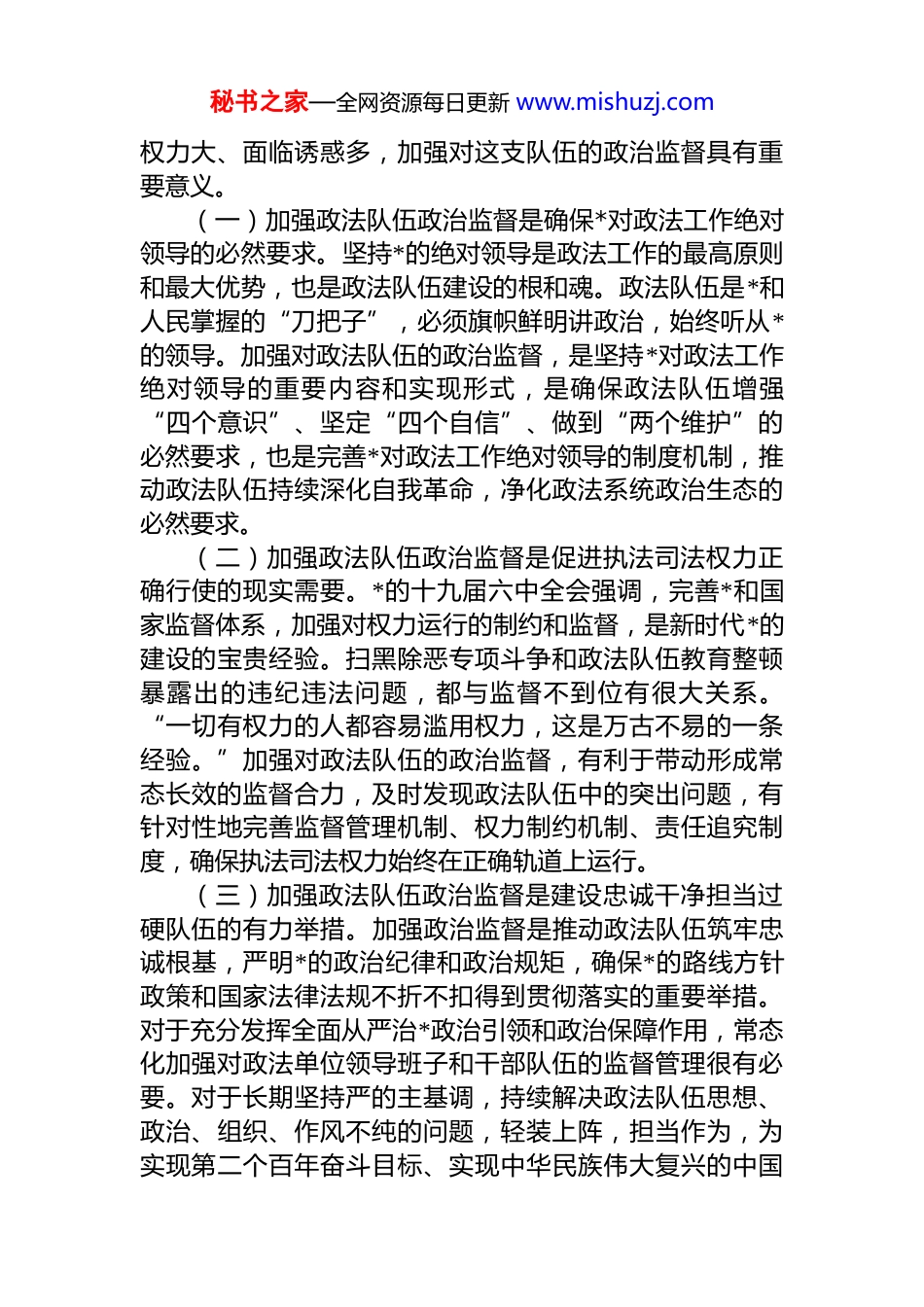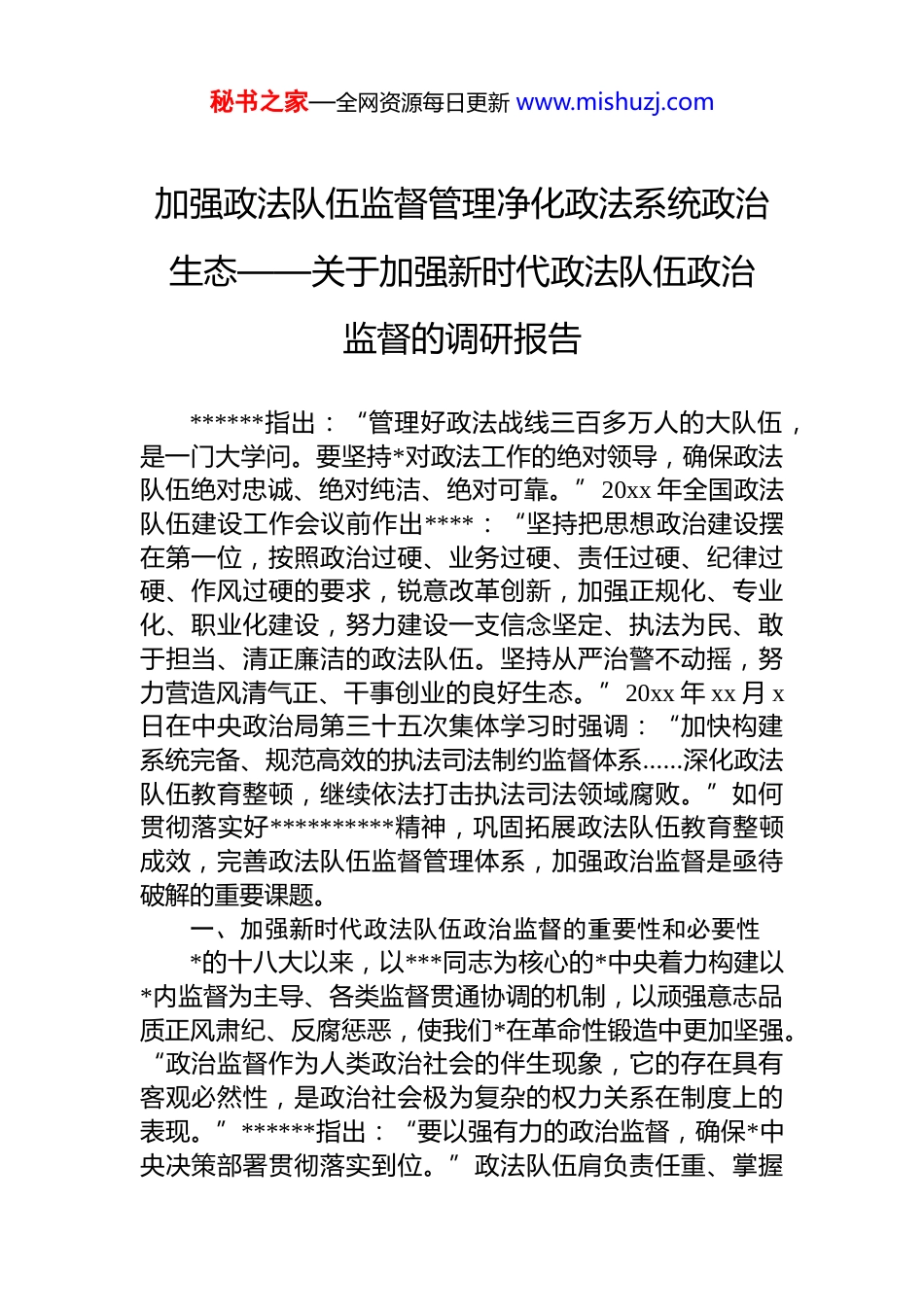 秘书之家—全网资源每日更新 www.mishuzj.com加强政法队伍监督管理净化政法系统政治生态——关于加强新时代政法队伍政治监督的调研报告******指出:“管理好政法战线三百多万人的大队伍,是一门大学问。要坚持*对政法工作的绝对领导,确保政法队伍绝对忠诚、绝对纯洁、绝对可靠。”20xx 年全国政法队伍建设工作会议前作出****:“坚持把思想政治建设摆在第一位,按照政治过硬、业务过硬、责任过硬、纪律过硬、作风过硬的要求,锐意改革创新,加强正规化、专业化、职业化建设,努力建设一支信念坚定、执法为民、敢于担当、清正廉洁的政法队伍。坚持从严治警不动摇,努力营造风清气正、干事创业的良好生态。”20xx 年 xx 月 x日在中央政治局第三十五次集体学习时强调:“加快构建系统完备、规范高效的执法司法制约监督体系……深化政法队伍教育整顿,继续依法打击执法司法领域腐败。”如何贯彻落实好**********精神,巩固拓展政法队伍教育整顿成效,完善政法队伍监督管理体系,加强政治监督是亟待破解的重要课题。一、加强新时代政法队伍政治监督的重要性和必要性*的十八大以来,以***同志为核心的*中央着力构建以*内监督为主导、各类监督贯通协调的机制,以顽强意志品质正风肃纪、反腐惩恶,使我们*在革命性锻造中更加坚强。“政治监督作为人类政治社会的伴生现象,它的存在具有客观必然性,是政治社会极为复杂的权力关系在制度上的表现。”******指出:“要以强有力的政治监督,确保*中央决策部署贯彻落实到位。”政法队伍肩负责任重、掌握秘书之家—全网资源每日更新 www.mishuzj.com权力大、面临诱惑多,加强对这支队伍的政治监督具有重要意义。(一)加强政法队伍政治监督是确保*对政法工作绝对领导的必然要求。坚持*的绝对领导是政法工作的最高原则和最大优势,也是政法队伍建设的根和魂。政法队伍是*和人民掌握的“刀把子”,必须旗帜鲜明讲政治,始终听从*的领导。加强对政法队伍的政治监督,是坚持*对政法工作绝对领导的重要内容和实现形式,是确保政法队伍增强“四个意识”、坚定“四个自信”、做到“两个维护”的必然要求,也是完善*对政法工作绝对领导的制度机制,推动政法队伍持续深化自我革命,净化政法系统政治生态的必然要求。(二)加强政法队伍政治监督是促进执法司法权力正确行使的现实需要。*的十九届六中全会强调,完善*和国家监督体系,加强对权力运行的制约和监督,是新时代*的建设的宝贵经验。扫黑除恶专项斗争和政法队伍教育整顿暴露出的违纪违法问题,都与监督不到位有很大关系。“一切有权力的人都容易滥用权力,这是万古不易的一条经验。”加强对政法队伍的政治监督,有利于带动形成常态长效的监督合力,及时发现政法队伍中的突出问题,有针对性地完善监督管理机制、权力制约机制、责任追究制度,确保执法司法权力始终在正确轨道上运行。(三)加强政法队伍政治监督是建设忠诚干净担当过硬队伍的有力举措。加强政治监督是推动政法队伍筑牢忠诚根基,严明*的政治纪律和政治规矩,确保*的路线方针政策和国家法律法规不折不扣得到贯彻落实的重要举措。对于充分发挥全面从严治*政治引领和政治保障作用,常态化加强对政法单位领导班子和干部队伍的监督管理很有必要。对于长期坚持严的主基调,持续解决政法队伍思想、政治、组织、作风不纯的问题,轻装上阵,担当作为,为实现第二个百年奋斗目标、实现中华民族伟大复兴的中国秘书之家—全网资源每日更新 www.mishuzj.com梦保驾护航具有重要意义。二、新时代政法队伍政治监督的逻辑架构《中共中央关于加强*的政治建设的意见》指出,加强对*的政治建设工作的监督检查,将其作为巡视巡察和督查检查的重要内容,深化政治巡视,强化政治监督,着力发现和纠正政治偏差。要依据*章*规 dj,结合政法队伍特点,坚持系统思维,理解和把握对政法队伍进行政治监督的逻辑架构。(一)政法队伍政治监督的主体。《中国共产**内监督条例》第九条规定:“建立健全*中央统一领导,*委(*组)全面监督,纪律检查机关专责监督,*的工作部门职能监督,*的基层组织日常监督,*员民主监督的*内监督体系。”政治监督在监督体系...