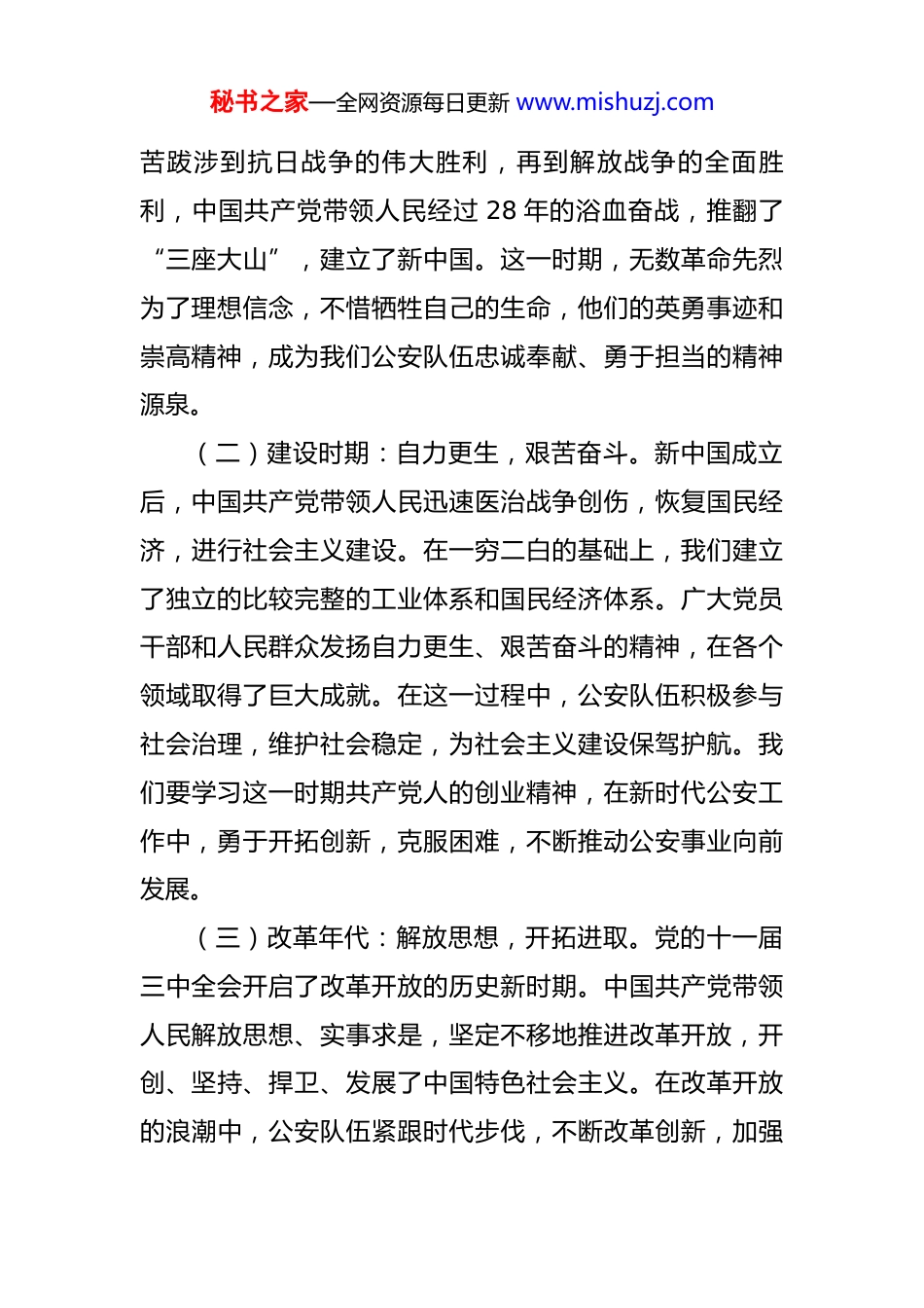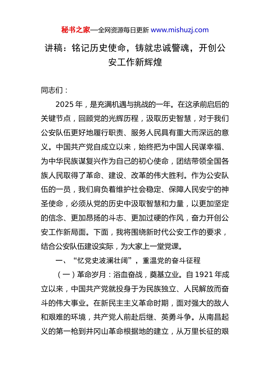 秘书之家—全网资源每日更新 www.mishuzj.com讲稿:铭记历史使命,铸就忠诚警魂,开创公安工作新辉煌 同志们:2025 年,是充满机遇与挑战的一年。在这承前启后的关键节点,回顾党的光辉历程,汲取历史智慧,对于我们公安队伍更好地履行职责、服务人民具有重大而深远的意义。中国共产党自成立以来,始终把为中国人民谋幸福、为中华民族谋复兴作为自己的初心使命,团结带领全国各族人民取得了革命、建设、改革的伟大胜利。作为公安队伍的一员,我们肩负着维护社会稳定、保障人民安宁的神圣使命,必须从党的历史中汲取智慧和力量,以更加坚定的信念、更加昂扬的斗志、更加过硬的作风,奋力开创公安工作新局面。下面,我将围绕新时代公安工作的要求,结合公安队伍建设实际,为大家上一堂党课。一、“忆党史波澜壮阔”,重温党的奋斗征程(一)革命岁月:浴血奋战,奠基立业。自 1921 年成立以来,中国共产党就投身于为民族独立、人民解放而奋斗的伟大事业。在新民主主义革命时期,面对强大的敌人和艰难的环境,共产党人前赴后继、英勇斗争。从南昌起义的第一枪到井冈山革命根据地的建立,从万里长征的艰秘书之家—全网资源每日更新 www.mishuzj.com苦跋涉到抗日战争的伟大胜利,再到解放战争的全面胜利,中国共产党带领人民经过 28 年的浴血奋战,推翻了“三座大山”,建立了新中国。这一时期,无数革命先烈为了理想信念,不惜牺牲自己的生命,他们的英勇事迹和崇高精神,成为我们公安队伍忠诚奉献、勇于担当的精神源泉。(二)建设时期:自力更生,艰苦奋斗。新中国成立后,中国共产党带领人民迅速医治战争创伤,恢复国民经济,进行社会主义建设。在一穷二白的基础上,我们建立了独立的比较完整的工业体系和国民经济体系。广大党员干部和人民群众发扬自力更生、艰苦奋斗的精神,在各个领域取得了巨大成就。在这一过程中,公安队伍积极参与社会治理,维护社会稳定,为社会主义建设保驾护航。我们要学习这一时期共产党人的创业精神,在新时代公安工作中,勇于开拓创新,克服困难,不断推动公安事业向前发展。(三)改革年代:解放思想,开拓进取。党的十一届三中全会开启了改革开放的历史新时期。中国共产党带领人民解放思想、实事求是,坚定不移地推进改革开放,开创、坚持、捍卫、发展了中国特色社会主义。在改革开放的浪潮中,公安队伍紧跟时代步伐,不断改革创新,加强秘书之家—全网资源每日更新 www.mishuzj.com自身建设,提高执法水平和服务能力。我们要继承和发扬改革开放时期共产党人的创新精神,积极适应新时代公安工作的新要求,不断探索新的工作方法和机制,为维护社会稳定、促进经济发展作出更大贡献。二、“析成功核心要素”,探究公安工作制胜法宝(一)党的领导:公安工作的根本保证。坚持党对公安工作的绝对领导,是公安工作的根本政治原则,是公安队伍永远不变的根和魂。在党的坚强领导下,公安队伍才能始终保持正确的政治方向,才能凝聚起强大的力量,战胜各种困难和挑战。我们要坚决贯彻落实党中央的决策部署,增强“四个意识”、坚定“四个自信”、做到“两个维护”,确保公安工作始终置于党的绝对领导之下。(二)群众路线:公安工作的生命线。人民群众是历史的创造者,是公安工作的力量源泉。公安工作必须坚持以人民为中心,密切联系群众,依靠群众。在日常工作中,我们要倾听群众呼声,了解群众需求,解决群众困难,不断增强人民群众的安全感和满意度。要积极发动群众参与社会治安综合治理,形成共建共治共享的社会治理格局。(三)忠诚担当:公安队伍的鲜明品格。忠诚是公安队伍的政治本色,担当是公安队伍的职责所在。公安民警秘书之家—全网资源每日更新 www.mishuzj.com要始终对党忠诚、对人民忠诚、对法律忠诚,在关键时刻挺身而出,勇于担当作为。面对违法犯罪活动,要敢于亮剑,坚决打击;面对突发事件,要迅速响应,妥善处置。要以实际行动诠释忠诚担当的精神内涵,维护社会公平正义。(四)改革创新:公安工作的动力源泉。时代在发展,社会在进步,公安工作也必须与时俱进。我们要积极推进公安改革,不断创新工作理念、工作机制和工作方法。...