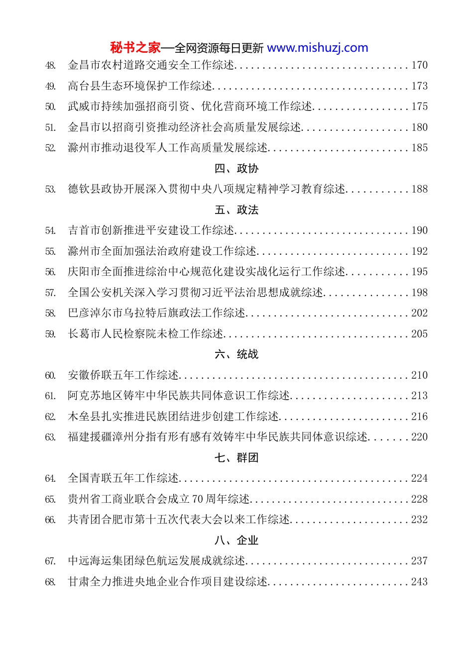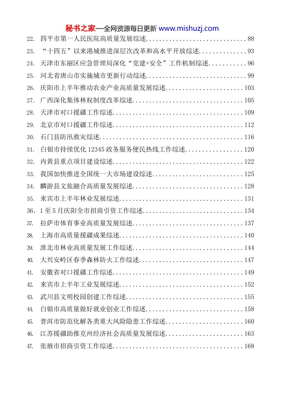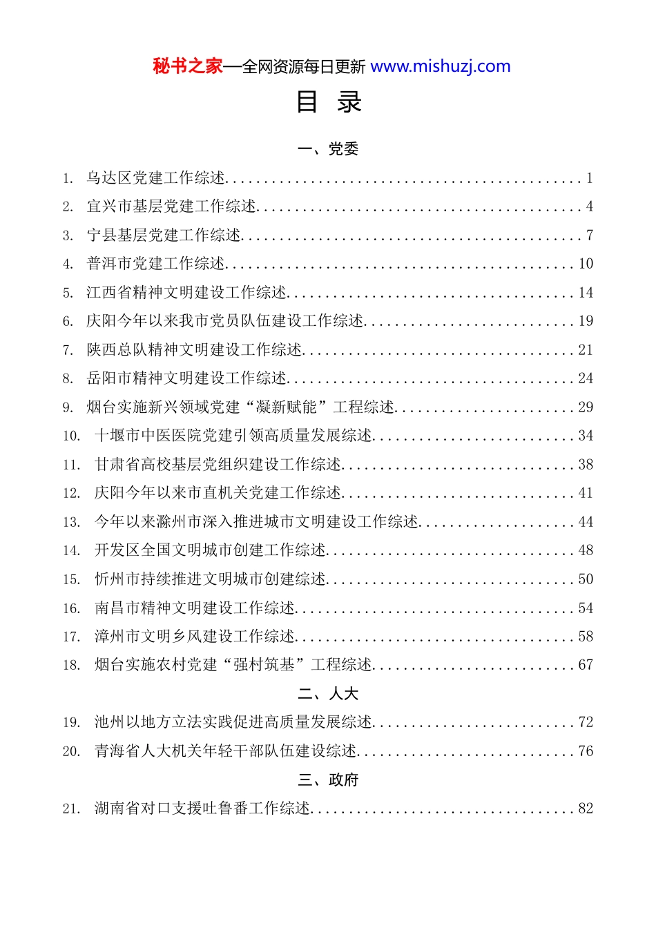 秘书之家—全网资源每日更新 www.mishuzj.com目 录一、党委1. 乌达区党建工作综述..............................................1 2. 宜兴市基层党建工作综述..........................................4 3. 宁县基层党建工作综述............................................7 4. 普洱市党建工作综述.............................................10 5. 江西省精神文明建设工作综述.....................................14 6. 庆阳今年以来我市党员队伍建设工作综述...........................19 7. 陕西总队精神文明建设工作综述...................................21 8. 岳阳市精神文明建设工作综述.....................................24 9. 烟台实施新兴领域党建“凝新赋能”工程综述.......................29 10. 十堰市中医医院党建引领高质量发展综述..........................34 11. 甘肃省高校基层党组织建设工作综述..............................38 12. 庆阳今年以来市直机关党建工作综述..............................41 13. 今年以来滁州市深入推进城市文明建设工作综述....................44 14. 开发区全国文明城市创建工作综述................................48 15. 忻州市持续推进文明城市创建综述................................50 16. 南昌市精神文明建设工作综述....................................54 17. 漳州市文明乡风建设工作综述....................................58 18. 烟台实施农村党建“强村筑基”工程综述..........................67 二、人大19. 池州以地方立法实践促进高质量发展综述..........................72 20. 青海省人大机关年轻干部队伍建设综述............................76 三、政府21. 湖南省对口支援吐鲁番工作综述..................................82 秘书之家—全网资源每日更新 www.mishuzj.com22. 四平市第一人民医院高质量发展综述..............................88 23. “十四五”以来港城推进深层次改革和高水平开放综述..............93 24. 天津市东丽区应急管理局深化“党建+安全”工作机制综述...........96 25. 河北省唐山市实施城市更新行动综述..............................99 26. 庆阳市上半年推动农业产业高质量发展综述.......................103 27. 广西深化集体林权制度改革综述.................................105 28. 天津市对口援疆工作综述.......................................109 29. 北京市对口援疆工作综述.......................................112 30. 石门县防汛救灾综述...........................................116 31. 白银市持续优化 12345 政务服务便民热线工作综述.................120 32. 内黄县重点项目建设综述.......................................122 33. 我国加快推进全国统一大市场建设综述...........................125 34. 麟游县文旅融合高质量发展综述.................................128 35. 来宾市上半年林业发展综述.....................................131 36.1 至 5 月庆阳全市招商引资工作综述..............................134 37. 拉萨市体育事业高质量发展综述.................................137 38. 上海市高质量援疆成果综述.....................................140 39. 淮北市林业高质量发展工作综述.................................144 40. 大兴安岭区春季森林防火工作综述...............................147 41. 安徽省对口援疆工作综述.......................................149 42. 来宾市上半年工业发展综述.....................................152 43. 武川县文明校园创建工作综述...................................155 44. 白银市高质量做好就业创业工作综述.............................158 45. 普洱市防范化解各类重大风险隐患工作综述.......................160 46. 江苏援...
