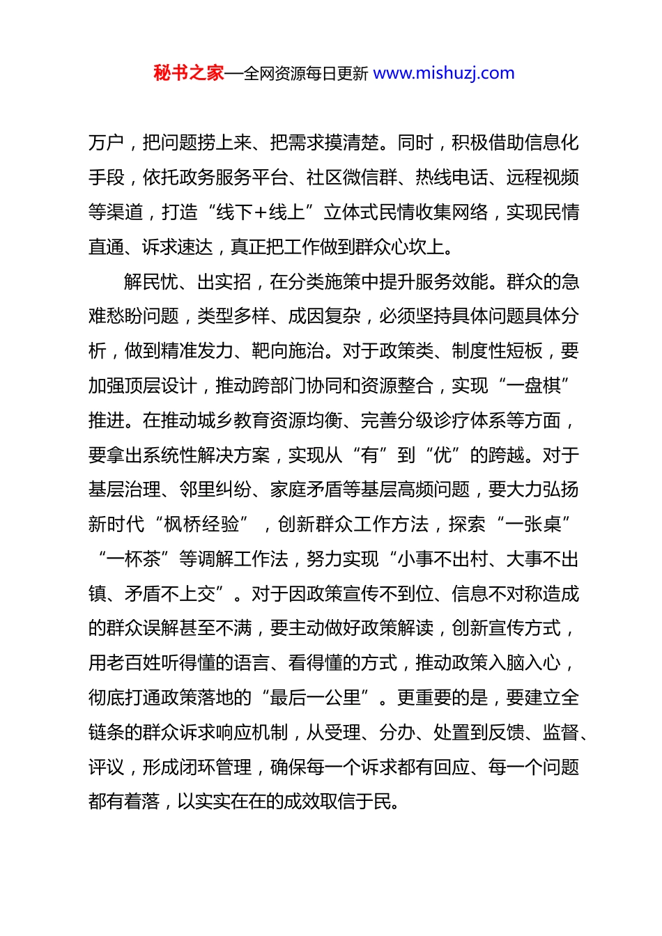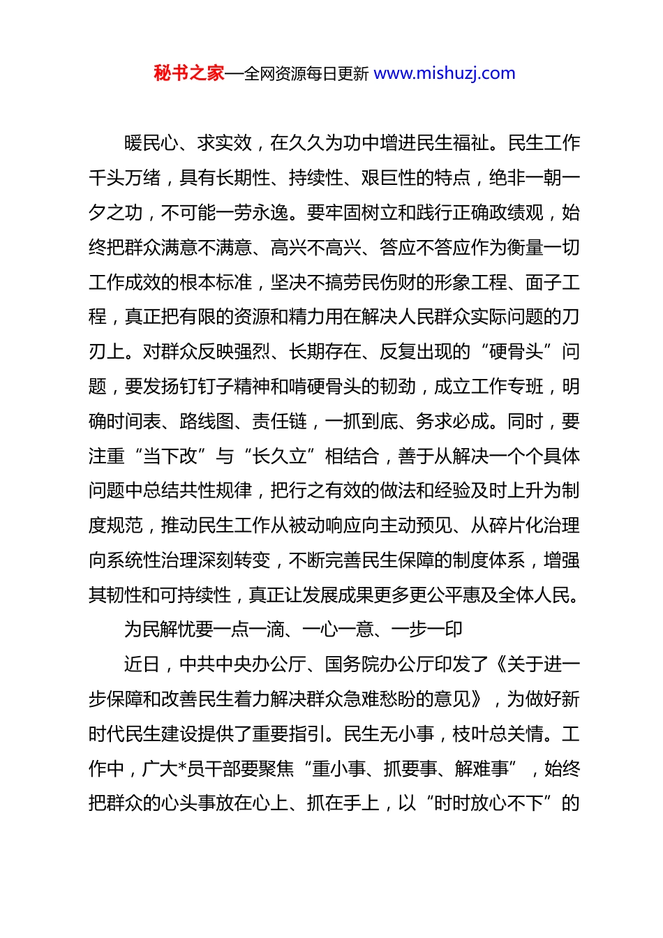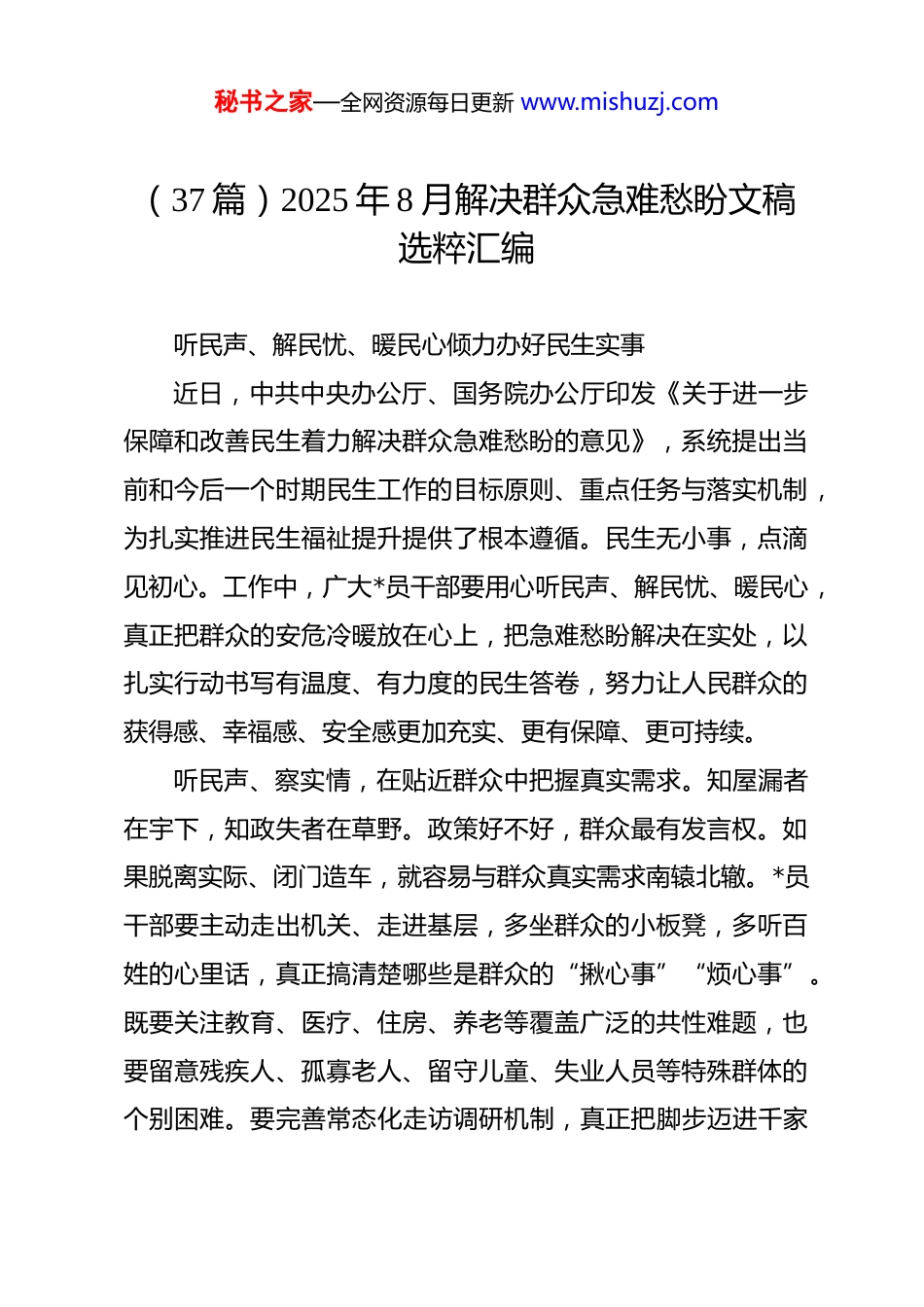 秘书之家—全网资源每日更新 www.mishuzj.com(37 篇)2025 年 8 月解决群众急难愁盼文稿选粹汇编听民声、解民忧、暖民心倾力办好民生实事近日,中共中央办公厅、国务院办公厅印发《关于进一步保障和改善民生着力解决群众急难愁盼的意见》,系统提出当前和今后一个时期民生工作的目标原则、重点任务与落实机制,为扎实推进民生福祉提升提供了根本遵循。民生无小事,点滴见初心。工作中,广大*员干部要用心听民声、解民忧、暖民心,真正把群众的安危冷暖放在心上,把急难愁盼解决在实处,以扎实行动书写有温度、有力度的民生答卷,努力让人民群众的获得感、幸福感、安全感更加充实、更有保障、更可持续。听民声、察实情,在贴近群众中把握真实需求。知屋漏者在宇下,知政失者在草野。政策好不好,群众最有发言权。如果脱离实际、闭门造车,就容易与群众真实需求南辕北辙。*员干部要主动走出机关、走进基层,多坐群众的小板凳,多听百姓的心里话,真正搞清楚哪些是群众的“揪心事”“烦心事”。既要关注教育、医疗、住房、养老等覆盖广泛的共性难题,也要留意残疾人、孤寡老人、留守儿童、失业人员等特殊群体的个别困难。要完善常态化走访调研机制,真正把脚步迈进千家秘书之家—全网资源每日更新 www.mishuzj.com万户,把问题捞上来、把需求摸清楚。同时,积极借助信息化手段,依托政务服务平台、社区微信群、热线电话、远程视频等渠道,打造“线下+线上”立体式民情收集网络,实现民情直通、诉求速达,真正把工作做到群众心坎上。解民忧、出实招,在分类施策中提升服务效能。群众的急难愁盼问题,类型多样、成因复杂,必须坚持具体问题具体分析,做到精准发力、靶向施治。对于政策类、制度性短板,要加强顶层设计,推动跨部门协同和资源整合,实现“一盘棋”推进。在推动城乡教育资源均衡、完善分级诊疗体系等方面,要拿出系统性解决方案,实现从“有”到“优”的跨越。对于基层治理、邻里纠纷、家庭矛盾等基层高频问题,要大力弘扬新时代“枫桥经验”,创新群众工作方法,探索“一张桌”“一杯茶”等调解工作法,努力实现“小事不出村、大事不出镇、矛盾不上交”。对于因政策宣传不到位、信息不对称造成的群众误解甚至不满,要主动做好政策解读,创新宣传方式,用老百姓听得懂的语言、看得懂的方式,推动政策入脑入心,彻底打通政策落地的“最后一公里”。更重要的是,要建立全链条的群众诉求响应机制,从受理、分办、处置到反馈、监督、评议,形成闭环管理,确保每一个诉求都有回应、每一个问题都有着落,以实实在在的成效取信于民。秘书之家—全网资源每日更新 www.mishuzj.com暖民心、求实效,在久久为功中增进民生福祉。民生工作千头万绪,具有长期性、持续性、艰巨性的特点,绝非一朝一夕之功,不可能一劳永逸。要牢固树立和践行正确政绩观,始终把群众满意不满意、高兴不高兴、答应不答应作为衡量一切工作成效的根本标准,坚决不搞劳民伤财的形象工程、面子工程,真正把有限的资源和精力用在解决人民群众实际问题的刀刃上。对群众反映强烈、长期存在、反复出现的“硬骨头”问题,要发扬钉钉子精神和啃硬骨头的韧劲,成立工作专班,明确时间表、路线图、责任链,一抓到底、务求必成。同时,要注重“当下改”与“长久立”相结合,善于从解决一个个具体问题中总结共性规律,把行之有效的做法和经验及时上升为制度规范,推动民生工作从被动响应向主动预见、从碎片化治理向系统性治理深刻转变,不断完善民生保障的制度体系,增强其韧性和可持续性,真正让发展成果更多更公平惠及全体人民。为民解忧要一点一滴、一心一意、一步一印近日,中共中央办公厅、国务院办公厅印发了《关于进一步保障和改善民生着力解决群众急难愁盼的意见》,为做好新时代民生建设提供了重要指引。民生无小事,枝叶总关情。工作中,广大*员干部要聚焦“重小事、抓要事、解难事”,始终把群众的心头事放在心上、抓在手上,以“时时放心不下”的秘书之家—全网资源每日更新 www.mishuzj.com责任感,办好每一件小事、抓实每一件要事、解决每一件难事,不断提升群众的获得感、幸福感、安全感,让人民...