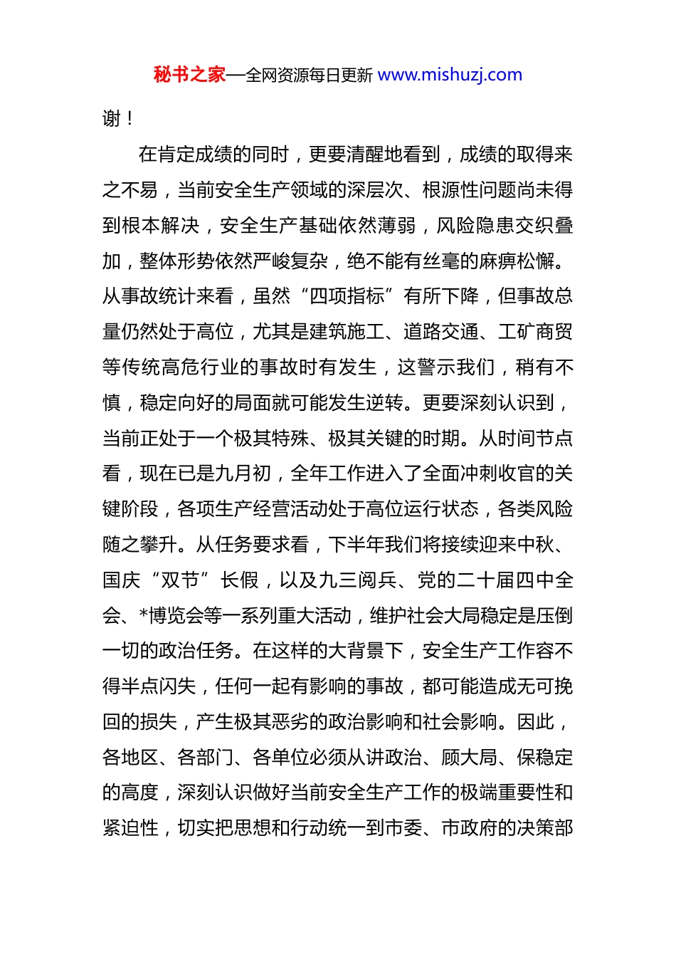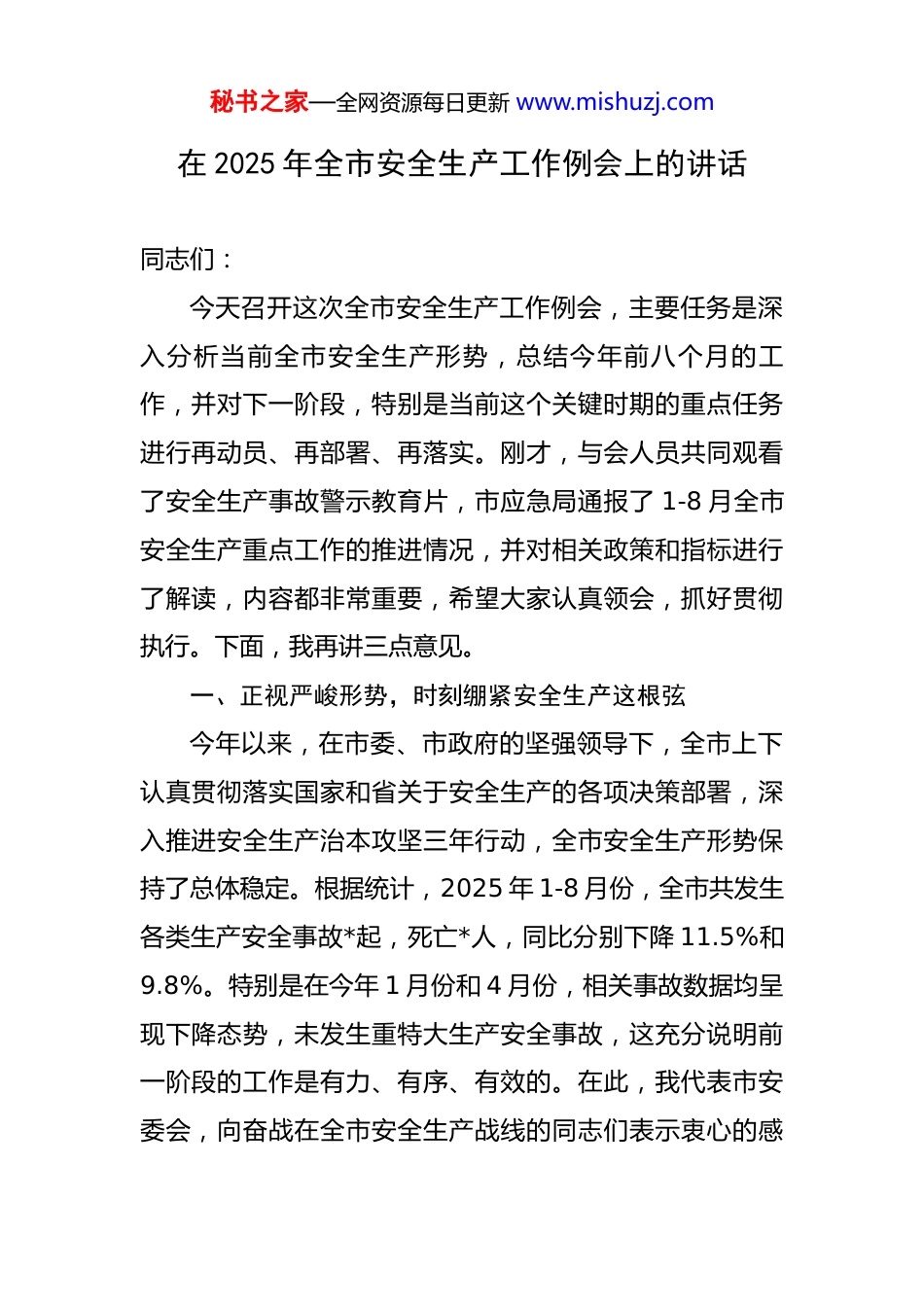 秘书之家—全网资源每日更新 www.mishuzj.com在 2025 年全市安全生产工作例会上的讲话 同志们:今天召开这次全市安全生产工作例会,主要任务是深入分析当前全市安全生产形势,总结今年前八个月的工作,并对下一阶段,特别是当前这个关键时期的重点任务进行再动员、再部署、再落实。刚才,与会人员共同观看了安全生产事故警示教育片,市应急局通报了 1-8 月全市安全生产重点工作的推进情况,并对相关政策和指标进行了解读,内容都非常重要,希望大家认真领会,抓好贯彻执行。下面,我再讲三点意见。一、正视严峻形势,时刻绷紧安全生产这根弦今年以来,在市委、市政府的坚强领导下,全市上下认真贯彻落实国家和省关于安全生产的各项决策部署,深入推进安全生产治本攻坚三年行动,全市安全生产形势保持了总体稳定。根据统计,2025 年 1-8 月份,全市共发生各类生产安全事故*起,死亡*人,同比分别下降 11.5%和9.8%。特别是在今年 1 月份和 4 月份,相关事故数据均呈现下降态势,未发生重特大生产安全事故,这充分说明前一阶段的工作是有力、有序、有效的。在此,我代表市安委会,向奋战在全市安全生产战线的同志们表示衷心的感秘书之家—全网资源每日更新 www.mishuzj.com谢!在肯定成绩的同时,更要清醒地看到,成绩的取得来之不易,当前安全生产领域的深层次、根源性问题尚未得到根本解决,安全生产基础依然薄弱,风险隐患交织叠加,整体形势依然严峻复杂,绝不能有丝毫的麻痹松懈。从事故统计来看,虽然“四项指标”有所下降,但事故总量仍然处于高位,尤其是建筑施工、道路交通、工矿商贸等传统高危行业的事故时有发生,这警示我们,稍有不慎,稳定向好的局面就可能发生逆转。更要深刻认识到,当前正处于一个极其特殊、极其关键的时期。从时间节点看,现在已是九月初,全年工作进入了全面冲刺收官的关键阶段,各项生产经营活动处于高位运行状态,各类风险随之攀升。从任务要求看,下半年我们将接续迎来中秋、国庆“双节”长假,以及九三阅兵、党的二十届四中全会、*博览会等一系列重大活动,维护社会大局稳定是压倒一切的政治任务。在这样的大背景下,安全生产工作容不得半点闪失,任何一起有影响的事故,都可能造成无可挽回的损失,产生极其恶劣的政治影响和社会影响。因此,各地区、各部门、各单位必须从讲政治、顾大局、保稳定的高度,深刻认识做好当前安全生产工作的极端重要性和紧迫性,切实把思想和行动统一到市委、市政府的决策部秘书之家—全网资源每日更新 www.mishuzj.com署上来。要坚决克服和平时期的麻痹思想、持续向好后的松劲心态以及任务繁重下的畏难情绪,以“时时放心不下”的责任感和“眼睛瞪得大大的”敏锐性,把安全责任扛在肩上、抓在手上,坚决守牢安全发展的底线,为全市经济社会高质量发展和各项重大活动的顺利举办,创造安全稳定的社会环境。二、聚焦治本攻坚,全面提升风险管控和隐患治理水平安全生产治本攻坚三年行动是当前和今后一个时期安全生产工作的总抓手。各项工作都要围绕这个总抓手来展开,各项措施都要向这个总目标来聚焦。必须坚持问题导向、目标导向和结果导向,拿出更硬核、更精准、更有效的举措,推动治本攻坚行动走深走实、落地见效。第一,全面推行“三个一”工作机制,构建精密智控的安全防线。市里决定,要在全市范围内深化“查找身边安全隐患”行动,并严格按照时间节点建立“一张图、一清单、一本账”的“三个一”工作机制。这不仅仅是一项技术手段的创新,更是一次管理理念和工作模式的深刻变革,其核心是实现安全管理的系统化、可视化和闭环化。所谓“一张图”,就是要绘制出全市安全风险的“作战地图”。这张图不仅要标明重大危险源、高危企业、重点区秘书之家—全网资源每日更新 www.mishuzj.com域的地理位置,更要通过数据集成和分析,动态展示风险等级、隐患分布和监管力量部署情况。就像“三个一图册”工作法中提到的,要绘制风险分布图,让安全风险在哪里、风险有多高,都一目了然。各县(市、区)、各园区要立即行动,组织力量对辖区内的风险点进行再排查、再梳理,将数据录入系统,形成覆盖全域、动态...