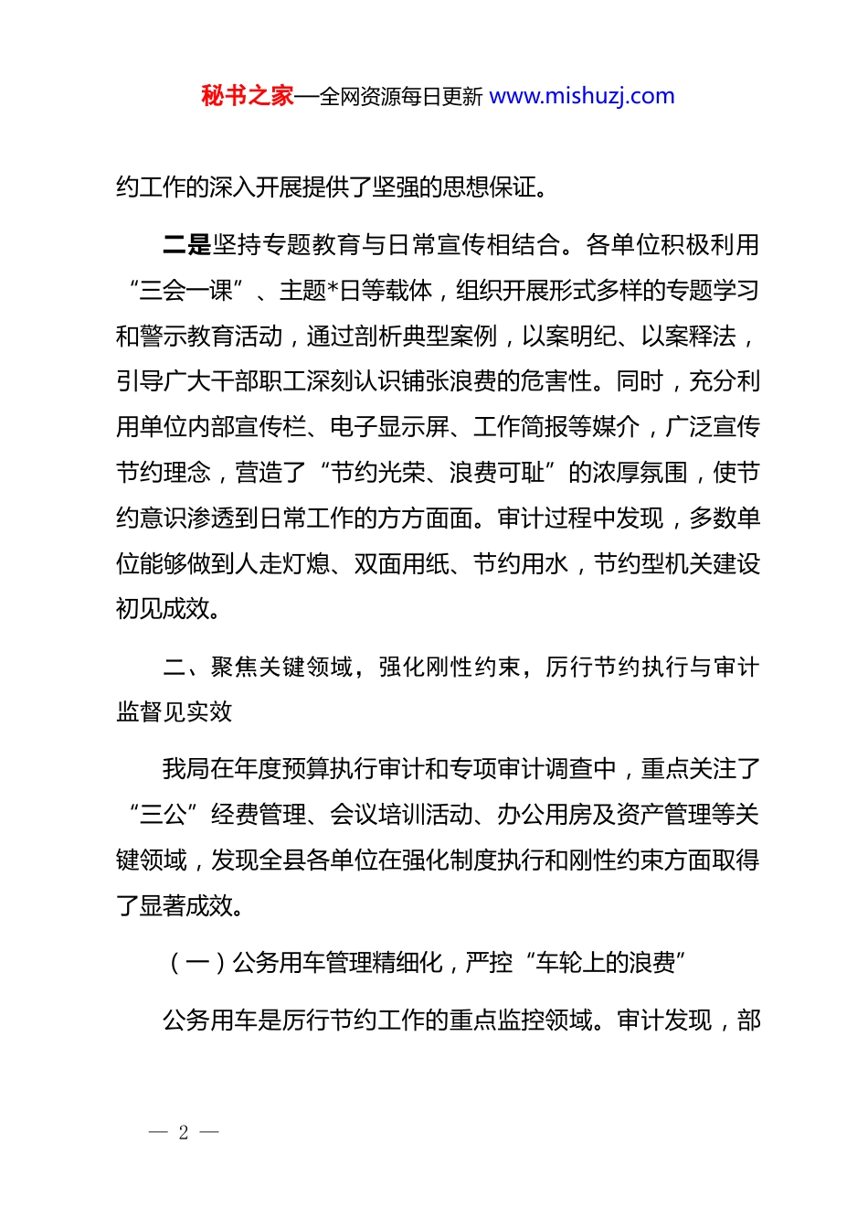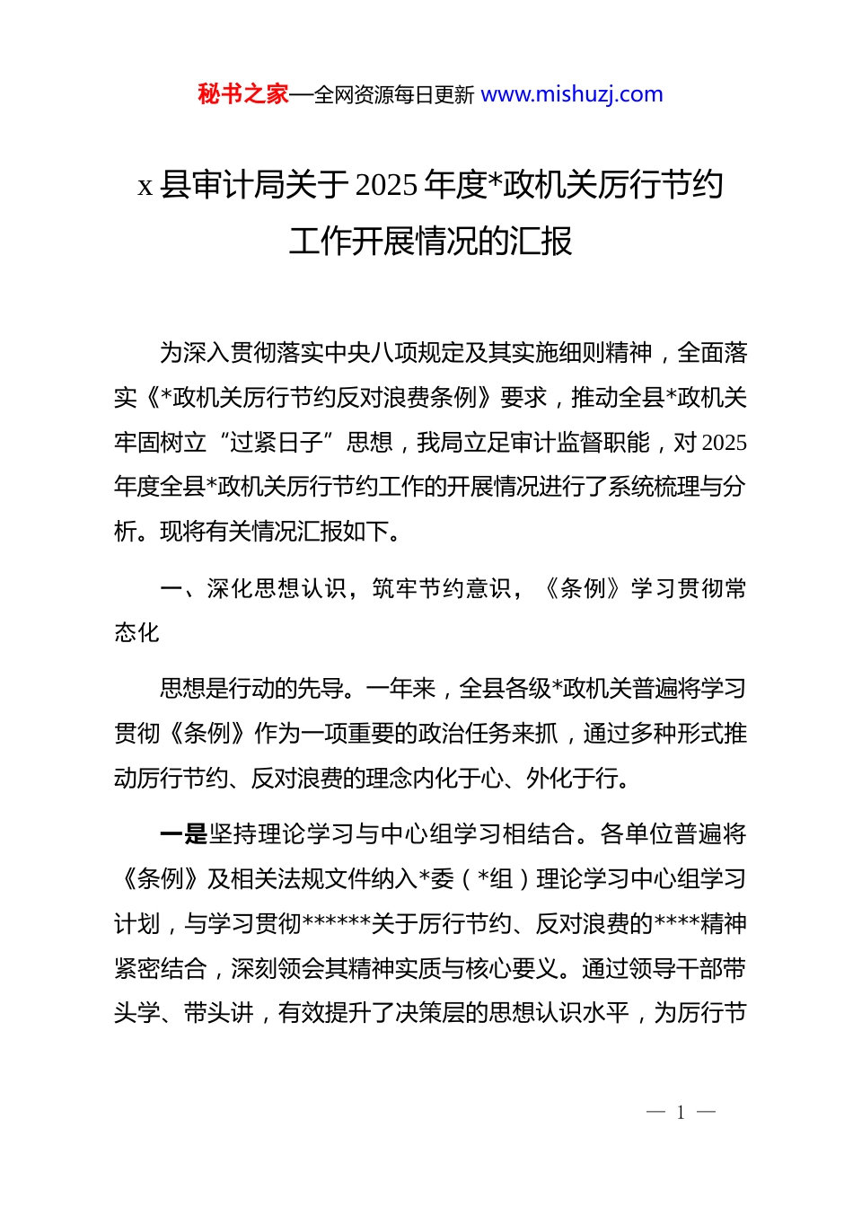 秘书之家—全网资源每日更新 www.mishuzj.comx 县审计局关于 2025 年度*政机关厉行节约工作开展情况的汇报为深入贯彻落实中央八项规定及其实施细则精神,全面落实《*政机关厉行节约反对浪费条例》要求,推动全县*政机关牢固树立“过紧日子”思想,我局立足审计监督职能,对 2025年度全县*政机关厉行节约工作的开展情况进行了系统梳理与分析。现将有关情况汇报如下。一、深化思想认识,筑牢节约意识,《条例》学习贯彻常态化思想是行动的先导。一年来,全县各级*政机关普遍将学习贯彻《条例》作为一项重要的政治任务来抓,通过多种形式推动厉行节约、反对浪费的理念内化于心、外化于行。一是坚持理论学习与中心组学习相结合。各单位普遍将《条例》及相关法规文件纳入*委(*组)理论学习中心组学习计划,与学习贯彻******关于厉行节约、反对浪费的****精神紧密结合,深刻领会其精神实质与核心要义。通过领导干部带头学、带头讲,有效提升了决策层的思想认识水平,为厉行节— 1 —秘书之家—全网资源每日更新 www.mishuzj.com约工作的深入开展提供了坚强的思想保证。二是坚持专题教育与日常宣传相结合。各单位积极利用“三会一课”、主题*日等载体,组织开展形式多样的专题学习和警示教育活动,通过剖析典型案例,以案明纪、以案释法,引导广大干部职工深刻认识铺张浪费的危害性。同时,充分利用单位内部宣传栏、电子显示屏、工作简报等媒介,广泛宣传节约理念,营造了“节约光荣、浪费可耻”的浓厚氛围,使节约意识渗透到日常工作的方方面面。审计过程中发现,多数单位能够做到人走灯熄、双面用纸、节约用水,节约型机关建设初见成效。二、聚焦关键领域,强化刚性约束,厉行节约执行与审计监督见实效我局在年度预算执行审计和专项审计调查中,重点关注了“三公”经费管理、会议培训活动、办公用房及资产管理等关键领域,发现全县各单位在强化制度执行和刚性约束方面取得了显著成效。(一)公务用车管理精细化,严控“车轮上的浪费”公务用车是厉行节约工作的重点监控领域。审计发现,部— 2 —秘书之家—全网资源每日更新 www.mishuzj.com分 xx 单位在公务用车管理上探索出了一套行之有效的“四紧”工作法,成为全县的标杆。一是“紧”在源头管控,严格审核审批。牢牢把握车辆“入口关”,坚持“无编制不配备、无预算不采购”的核心原则。机关事务管理、财政等部门实行“双审核”机制,对公务车辆的编制、预算及采购流程进行严格把关。数据显示,截至2025 年 9 月,全 xx 县审批配备更新的公务用车数量为 38 辆,同比显著下降 28%。在新增配置中,通过调剂方式解决的车辆占比高达 40%,有效盘活了现有车辆资源。除执法执勤、应急救援等特殊工作需要外,新增及更新车辆已全部采购新能源汽车,积极响应国家绿色低碳发展战略。二是“紧”在出口处置,发挥资产效益。推动车辆资源的优化配置与盘活利用。审计注意到,县直用车单位成功实现了跨层级调剂,分别从中央垂直管理单位和县直单位调剂接收公务用车各 1 辆。同时,从上交的旧车中择优选取了 9 辆车况尚可的车辆,调剂给公安、交通运输等车辆需求急迫的单位继续使用,实现了资产效益最大化。严格执行“买新交旧”和“一个月内上交”的规定,累计接收县直单位按规定上交的废旧公务用车 88 辆,并通过集中统一的公开处置方式,确保了国有资— 3 —秘书之家—全网资源每日更新 www.mishuzj.com产的保值增值。三是“紧”在日常管理,从严督查检查。运用现代信息技术加强动态监管。相关主管部门每月通过北斗定位系统对县直单位近 200 辆次的普通公务用车进行常规普查与随机抽查,重点核查车辆的定点停放情况,对发现的无单用车等违规行为及时进行处理和规范。此外,还组织开展了针对县直事业单位公务用车的专项检查,全面汇总并核实了 76 家事业单位共计 215辆公务车辆的信息。对部分重点单位,检查组采取上门检查的方式,通过查阅用车台账、抽查北斗轨迹记录等手段,紧盯用车审批流程、“三定点”制度的执行情况,有力督促了各单位规范公车管理。同时,已实现对全 xx 县基层公务出行租赁的新能源...