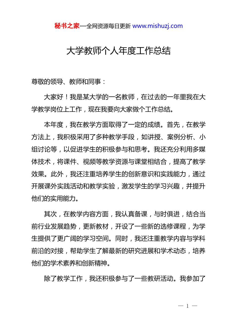 秘书之家—全网资源每日更新 www.mishuzj.com大学教师个人年度工作总结尊敬的领导、教师和同事:大家好!我是某大学的一名教师,在过去的一年里我在大学教学岗位上工作,现在我要向大家做个工作总结。本年度,我在教学方面取得了一定的成绩。首先,在教学方法上,我积极采用了多种教学手段,如讲授、案例分析、小组讨论等,以促进学生的积极参与和思考。我还充分利用多媒体技术,将课件、视频等教学资源与课堂相结合,提高了教学效果。此外,我还注重培养学生的创新意识和实践能力,通过开展课外实践活动和教学实验,激发学生的学习兴趣,并提升他们的实用能力。其次,在教学内容方面,我认真备课,与时俱进,结合当前行业发展趋势,更新教材,开设了一些新的选修课程,为学生提供了更广阔的学习空间。同时,我还注重教学内容与学科前沿的对接,帮助学生了解最新的研究进展和学术动态,培养他们的学术素养和创新精神。除了教学工作,我还积极参与了一些教研活动。我参加了— 1 —秘书之家—全网资源每日更新 www.mishuzj.com学校组织的教学研讨会和学科交流会,与同行们分享了我的教学经验和思考。我还参与了一些课题的研究与撰写,并获得了一些研究成果和奖项。这些经历不仅提高了我的学术水平,也推动了教育教学改革的进程。此外,我还通过个人学习和培训不断更新自己的专业知识和教学理念。我定期参加学校组织的教师培训课程,持续提升自己的教学能力。我还参加了一些学术会议和研讨会,与一些学者和教育专家进行了深入交流,扩大了自己的学术视野。尽管工作中取得了一些成绩,但我也要诚实地反思和总结自己存在的不足之处。首先,我认为自己在教学过程中有时缺乏灵活性,在应对学生的问题和困惑时,没有充分发挥自己的教学经验和素质。其次,我在教学评价方面还需要进一步加强,我会积极寻求同行的指导和建议,提升自己的评价能力。最后,在教学方法和教学资源的利用上,我还需要更加深入地研究和学习,以提高自己的教学效果。在新的一年里,我将继续努力,在教育教学工作中发挥自己的专业优势,做好课堂教学,培养学生成长。我将更加注重学生的主动学习和创新能力的培养,积极引导学生参与课余实践活动,并推动学生参与科研项目,提高他们的研究能力和科— 2 —秘书之家—全网资源每日更新 www.mishuzj.com学素养。同时,我将加强教学理论和教学方法的学习,不断创新教学内容和教学手段,提高自己的专业水平。最后,我要感谢学校、领导、同事和家人对我的支持和帮助。正是有你们的鼓励和支持,我才能顺利完成教学任务,取得一些成绩。同时,我也要感谢我的学生,感谢他们的配合和努力,让我在教学过程中感受到了快乐和满足。谢谢大家!— 3 —