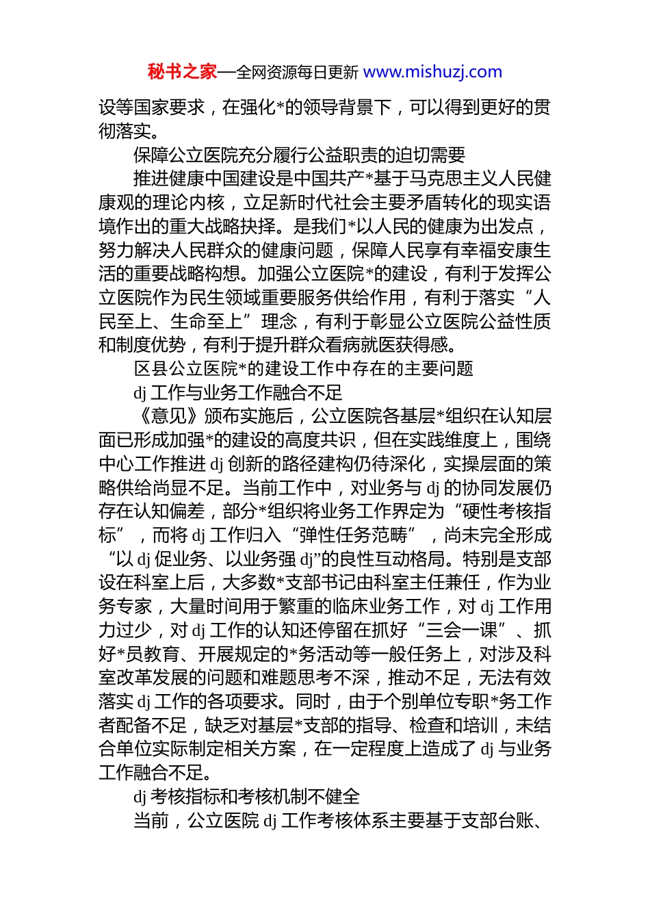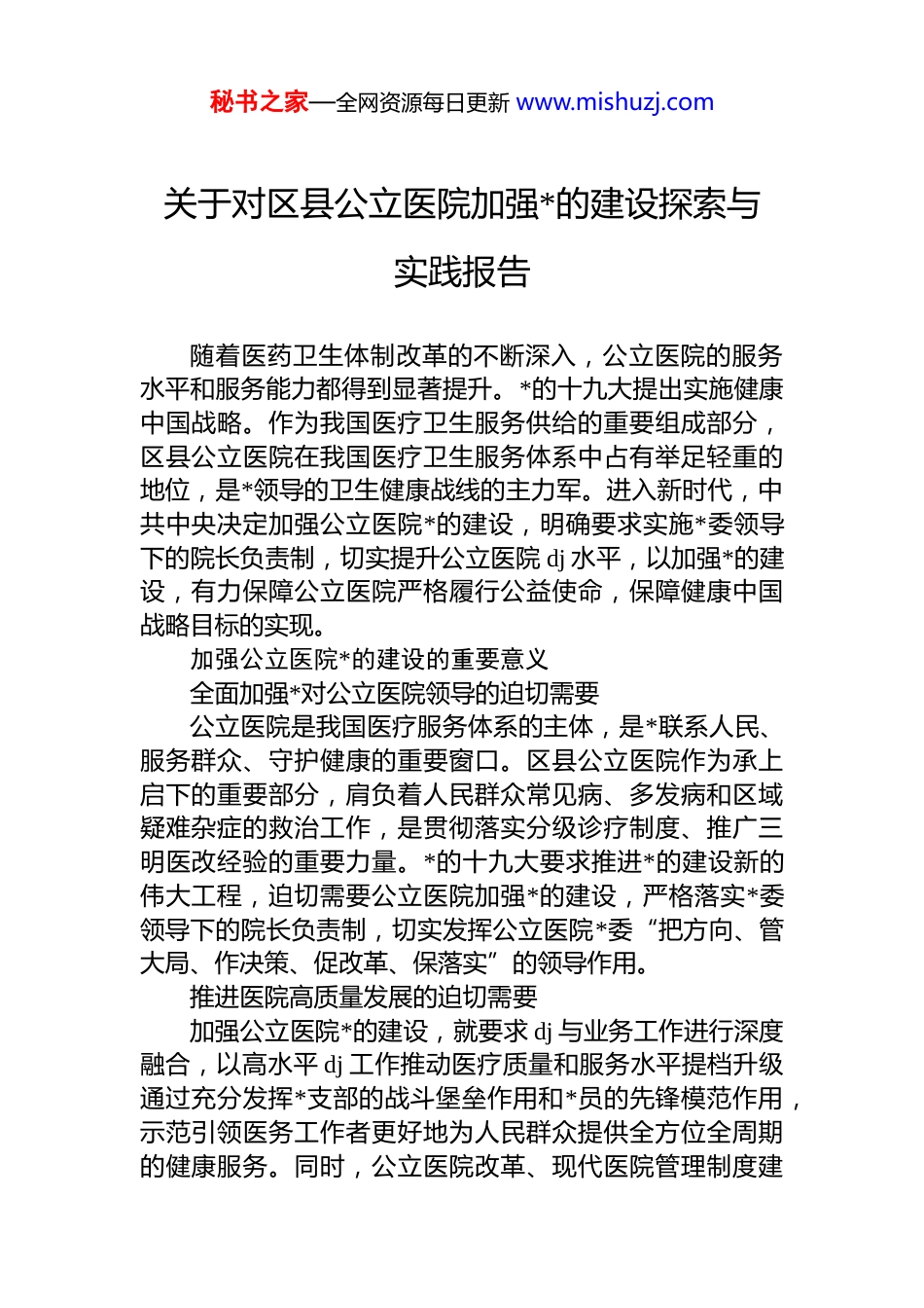 秘书之家—全网资源每日更新 www.mishuzj.com关于对区县公立医院加强*的建设探索与实践报告随着医药卫生体制改革的不断深入,公立医院的服务水平和服务能力都得到显著提升。*的十九大提出实施健康中国战略。作为我国医疗卫生服务供给的重要组成部分,区县公立医院在我国医疗卫生服务体系中占有举足轻重的地位,是*领导的卫生健康战线的主力军。进入新时代,中共中央决定加强公立医院*的建设,明确要求实施*委领导下的院长负责制,切实提升公立医院 dj 水平,以加强*的建设,有力保障公立医院严格履行公益使命,保障健康中国战略目标的实现。加强公立医院*的建设的重要意义全面加强*对公立医院领导的迫切需要公立医院是我国医疗服务体系的主体,是*联系人民、服务群众、守护健康的重要窗口。区县公立医院作为承上启下的重要部分,肩负着人民群众常见病、多发病和区域疑难杂症的救治工作,是贯彻落实分级诊疗制度、推广三明医改经验的重要力量。*的十九大要求推进*的建设新的伟大工程,迫切需要公立医院加强*的建设,严格落实*委领导下的院长负责制,切实发挥公立医院*委“把方向、管大局、作决策、促改革、保落实”的领导作用。推进医院高质量发展的迫切需要加强公立医院*的建设,就要求 dj 与业务工作进行深度融合,以高水平 dj 工作推动医疗质量和服务水平提档升级通过充分发挥*支部的战斗堡垒作用和*员的先锋模范作用,示范引领医务工作者更好地为人民群众提供全方位全周期的健康服务。同时,公立医院改革、现代医院管理制度建秘书之家—全网资源每日更新 www.mishuzj.com设等国家要求,在强化*的领导背景下,可以得到更好的贯彻落实。保障公立医院充分履行公益职责的迫切需要推进健康中国建设是中国共产*基于马克思主义人民健康观的理论内核,立足新时代社会主要矛盾转化的现实语境作出的重大战略抉择。是我们*以人民的健康为出发点,努力解决人民群众的健康问题,保障人民享有幸福安康生活的重要战略构想。加强公立医院*的建设,有利于发挥公立医院作为民生领域重要服务供给作用,有利于落实“人民至上、生命至上”理念,有利于彰显公立医院公益性质和制度优势,有利于提升群众看病就医获得感。区县公立医院*的建设工作中存在的主要问题dj 工作与业务工作融合不足《意见》颁布实施后,公立医院各基层*组织在认知层面已形成加强*的建设的高度共识,但在实践维度上,围绕中心工作推进 dj 创新的路径建构仍待深化,实操层面的策略供给尚显不足。当前工作中,对业务与 dj 的协同发展仍存在认知偏差,部分*组织将业务工作界定为“硬性考核指标”,而将 dj 工作归入“弹性任务范畴”,尚未完全形成“以 dj 促业务、以业务强 dj”的良性互动格局。特别是支部设在科室上后,大多数*支部书记由科室主任兼任,作为业务专家,大量时间用于繁重的临床业务工作,对 dj 工作用力过少,对 dj 工作的认知还停留在抓好“三会一课”、抓好*员教育、开展规定的*务活动等一般任务上,对涉及科室改革发展的问题和难题思考不深,推动不足,无法有效落实 dj 工作的各项要求。同时,由于个别单位专职*务工作者配备不足,缺乏对基层*支部的指导、检查和培训,未结合单位实际制定相关方案,在一定程度上造成了 dj 与业务工作融合不足。dj 考核指标和考核机制不健全当前,公立医院 dj 工作考核体系主要基于支部台账、秘书之家—全网资源每日更新 www.mishuzj.com会议记录等过程性资料,对实质性工作成效的考核覆盖不足,考核维度与方法体系的多元化程度不足。此类考核机制下,考核结果的区分度与诊断性价值有限,难以有效反映不同*组织的工作质效差异。在考核指标制定上,大多以定性指标为主,量化指标很少,一些指标制定得不合理、不规范,导致考核量化程度较低。同时,部分基层*组织 dj工作考核结果运用机制尚待完善,考核结果与应用环节存在割裂现象。“考用脱节”的现实困境导致考核结果的激励效能难以有效释放,制约了 dj 考核对各项工作的传导效应。dj 工作创新不足、吸引力不强公立医院开展 dj 工作的过程重点依然停留在“*委安排、支部贯彻、*员学习”的模式...