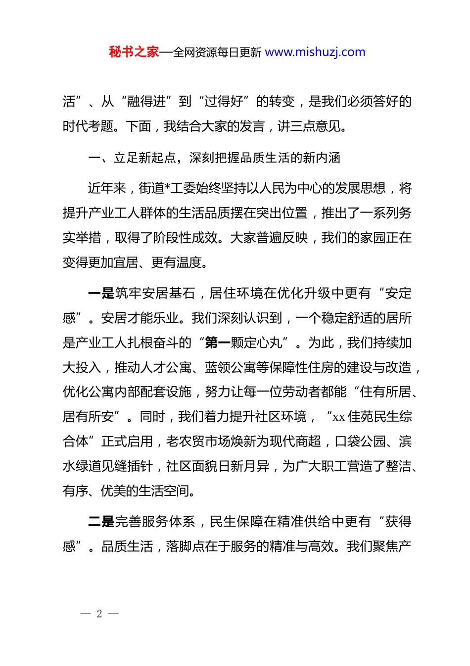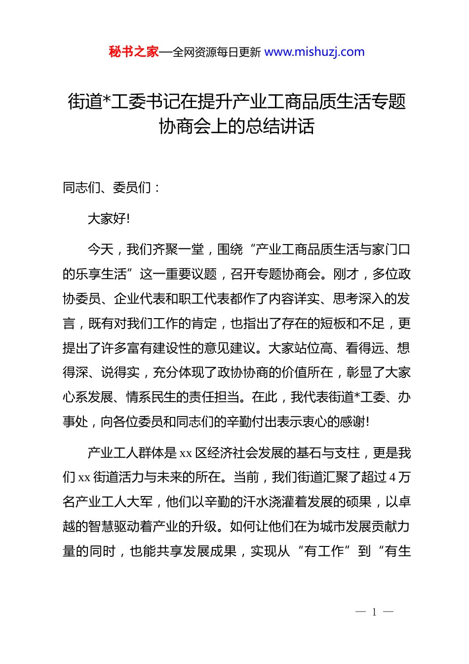 秘书之家—全网资源每日更新 www.mishuzj.com街道*工委书记在提升产业工商品质生活专题协商会上的总结讲话同志们、委员们:大家好!今天,我们齐聚一堂,围绕“产业工商品质生活与家门口的乐享生活”这一重要议题,召开专题协商会。刚才,多位政协委员、企业代表和职工代表都作了内容详实、思考深入的发言,既有对我们工作的肯定,也指出了存在的短板和不足,更提出了许多富有建设性的意见建议。大家站位高、看得远、想得深、说得实,充分体现了政协协商的价值所在,彰显了大家心系发展、情系民生的责任担当。在此,我代表街道*工委、办事处,向各位委员和同志们的辛勤付出表示衷心的感谢!产业工人群体是 xx 区经济社会发展的基石与支柱,更是我们 xx 街道活力与未来的所在。当前,我们街道汇聚了超过 4 万名产业工人大军,他们以辛勤的汗水浇灌着发展的硕果,以卓越的智慧驱动着产业的升级。如何让他们在为城市发展贡献力量的同时,也能共享发展成果,实现从“有工作”到“有生— 1 —秘书之家—全网资源每日更新 www.mishuzj.com活”、从“融得进”到“过得好”的转变,是我们必须答好的时代考题。下面,我结合大家的发言,讲三点意见。一、立足新起点,深刻把握品质生活的新内涵近年来,街道*工委始终坚持以人民为中心的发展思想,将提升产业工人群体的生活品质摆在突出位置,推出了一系列务实举措,取得了阶段性成效。大家普遍反映,我们的家园正在变得更加宜居、更有温度。一是筑牢安居基石,居住环境在优化升级中更有“安定感”。安居才能乐业。我们深刻认识到,一个稳定舒适的居所是产业工人扎根奋斗的“第一颗定心丸”。为此,我们持续加大投入,推动人才公寓、蓝领公寓等保障性住房的建设与改造,优化公寓内部配套设施,努力让每一位劳动者都能“住有所居、居有所安”。同时,我们着力提升社区环境,“xx 佳苑民生综合体”正式启用,老农贸市场焕新为现代商超,口袋公园、滨水绿道见缝插针,社区面貌日新月异,为广大职工营造了整洁、有序、优美的生活空间。二是完善服务体系,民生保障在精准供给中更有“获得感”。品质生活,落脚点在于服务的精准与高效。我们聚焦产— 2 —秘书之家—全网资源每日更新 www.mishuzj.com业工人最关心、最直接、最现实的利益问题,持续发力。针对职工子女的“上学难、托管难”问题,我们积极协调教育资源,保障职工子女顺利入学,并大力推广社区暑托班、婴幼儿成长驿站等服务,有效缓解了双职工家庭的后顾之忧。同时,我们联合辖区医疗机构,常态化开展健**诊、疾病筛查、心理疏导等活动进园区、进企业,将优质医疗服务送到工友们身边,守护他们的身心健康。三是丰富精神家园,文化生活在多元融合中更有“归属感”。满足物质需求的同时,更要丰盈精神世界。我们着力打造“xx”系列全民活动品牌,成功举办了首届产业工人文化节、活力跑、活力篮球赛等一系列文体活动,点燃了职工们的参与热情。我们创新推出“19 点联课堂”等品牌项目,联动多方资源,为产业工人及其家属提供了学习交流、兴趣培养、技能提升的平台。城市书房、百姓健身房等公共文化设施的相继投运,让工友们在工作之余,能够找到放松身心、提升自我的精神栖息地,逐步从“异乡客”转变为“自家人”。二、直面新挑战,精准破解品质生活的硬约束在肯定成绩的同时,我们必须清醒地认识到,对标广大产业工人的新期盼和高质量发展的新要求,我们的工作还存在一— 3 —秘书之家—全网资源每日更新 www.mishuzj.com些亟待解决的突出问题。刚才委员们和职工代表们提出的问题,一针见血、切中要害,是我们下一步工作的重点和方向。一是破解“供给不平衡”难题,在资源配置上务求均衡普惠。当前,公共服务资源的供给与产业工人日益增长、多元化的需求之间,还存在结构性矛盾。例如,有委员提到的,社区暑托班“一座难求”,这反映出我们在优质普惠性托育服务供给上还有很大缺口。又如,企业宿舍区周边“停车难”问题日益凸 m,这暴露出我们的城市规划和管理未能完全跟上人口快速集聚的步伐。这些问题看似是“小事”,却直接关系到职工的日常生活便利度和幸福指数,必...