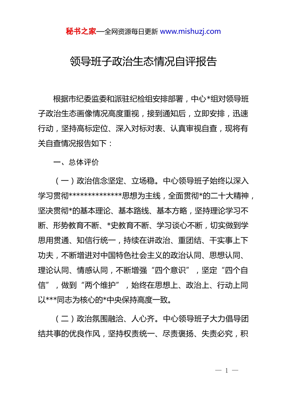 秘书之家—全网资源每日更新 www.mishuzj.com领导班子政治生态情况自评报告根据市纪委监委和派驻纪检组安排部署,中心*组对领导班子政治生态画像情况高度重视,接到通知后,立即安排,迅速行动,坚持高标定位、深入对标对表、认真审视自查,现将有关自查情况报告如下:一、总体评价(一)政治信念坚定、立场稳。中心领导班子始终以深入学习贯彻**************思想为主线,全面贯彻*的二十大精神,坚决贯彻*的基本理论、基本路线、基本方略,坚持理论学习不断、形势教育不断、*史教育不断、学习谈心不断,切实做到学思用贯通、知信行统一,持续在讲政治、重团结、干实事上下功夫,不断增进对中国特色社会主义的政治认同、思想认同、理论认同、情感认同,不断增强“四个意识”,坚定“四个自信”,做到“两个维护”,始终在思想上、政治上、行动上同以***同志为核心的*中央保持高度一致。(二)政治氛围融洽、人心齐。中心领导班子大力倡导团结共事的优良作风,坚持权责统一、尽责褒扬、失责必究,积— 1 —秘书之家—全网资源每日更新 www.mishuzj.com极营造想干事、能干事、敢干事、干成事的浓厚氛围,推动形成想作为、敢作为、善作为的良好政治生态。主要领导坚持“律人先律己,严兵先严将”的理念,模范遵守*风廉政建设和反腐败工作的各项规定,率先垂范。班子成员坚持事业为重、彼此尊重、团结合作,坚决抵制“帮圈文化”,签订承诺书,自觉净化朋友圈、生活圈、社交圈。(三)政治生活严肃、有辣味。中心领导班子始终坚持从具体的*内基本制度入手,狠抓*内基本制度、政治生活落实,能够严肃认真地开展好“三会一课”、组织生活会、民主评议*员、谈心谈话、主题*日等活动,增强*内政治生活的吸引力和感染力。在开展批评和自我批评时,每一名班子成员都把自己摆进去、把思想摆进去、把职责摆进去,敢于批评和自我批评,让“咬耳扯袖”“红脸出汗”成为一种常态。同时,立足*章、*规 dj,加强*性教育管理,定期开展*性“体检”,提高*内组织生活质量和效果。2023 年中心共召开 2 次高质量民主生活会(2022 年民主生活会、扶贫领域以案促改专题民主生活会)。*员领导干部严格执行双重组织生活制度,中心*组书记、处级干部都以普通*员身份参加了所在支部的组织生活会。(四)政治文化和谐、风气正。中心领导班子努力把*内政— 2 —秘书之家—全网资源每日更新 www.mishuzj.com治文化建设与保持*内政治生态、严肃*内政治生活有机统一、有机衔接,把培育*内政治文化与提升*员素质、净化*员思想、整饬*员作风紧密结合起来,把建设*内制度文化与支部标准化规范化建设紧密结合起来,在制度文化建设中突出价值导向,在精神文化塑造中实现思想引领,以良好的*内政治文化引领*内政治生活健康发展,厚植良好政治生态的土壤。(五)政治纪律严明、守底线。中心领导班子能够做到知敬畏、存戒惧、守底线,对照*章*规 dj,对照*内制度条例,明白哪些事能做、哪些事该做,哪些事情必须做,哪些事情怎样做,严格按照规则办事,着力克服“想当然”、坚决拒绝“差不多”,不触底线、不碰红线、不越界线、不跨边线。在重大问题上提高政治站位、坚定政治立场、保持头脑清醒。切实增强“四个意识”、坚定“四个自信”、做到“两个维护”,严守*的政治纪律和政治规矩,始终在政治立场、政治方向、政治原则、政治道路上同*中央保持高度一致,用实际行动响应*的号召。(六)政治操守廉洁、形象好。中心领导班子能够正确看待个人利益、正确看待个人得失、正确把握利益关系,带头遵守*风廉政建设和反腐败工作的各项规定,及时如实报告个人有— 3 —秘书之家—全网资源每日更新 www.mishuzj.com关事项、填报廉政档案、报告述责述廉述学述法情况,坚持勤政清廉为本,以身作则,率先垂范,有力地带动和维护了中心整体形象。二、存在问题一是学习教育不够扎实,理论学习仍存在重形式、轻实效的情况;二是对*员干部朋友圈、生活圈了解不够,八小时以外监督乏力;三是勤俭节约意识不够强,机关日常用电、用纸、用水存在的浪费现象没有完全杜绝。三、下步打算一是强化理论武装。深入学习贯彻********...