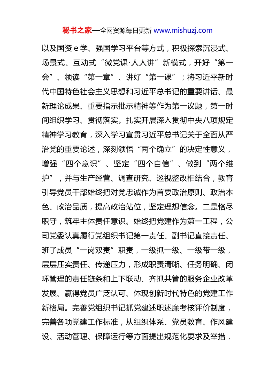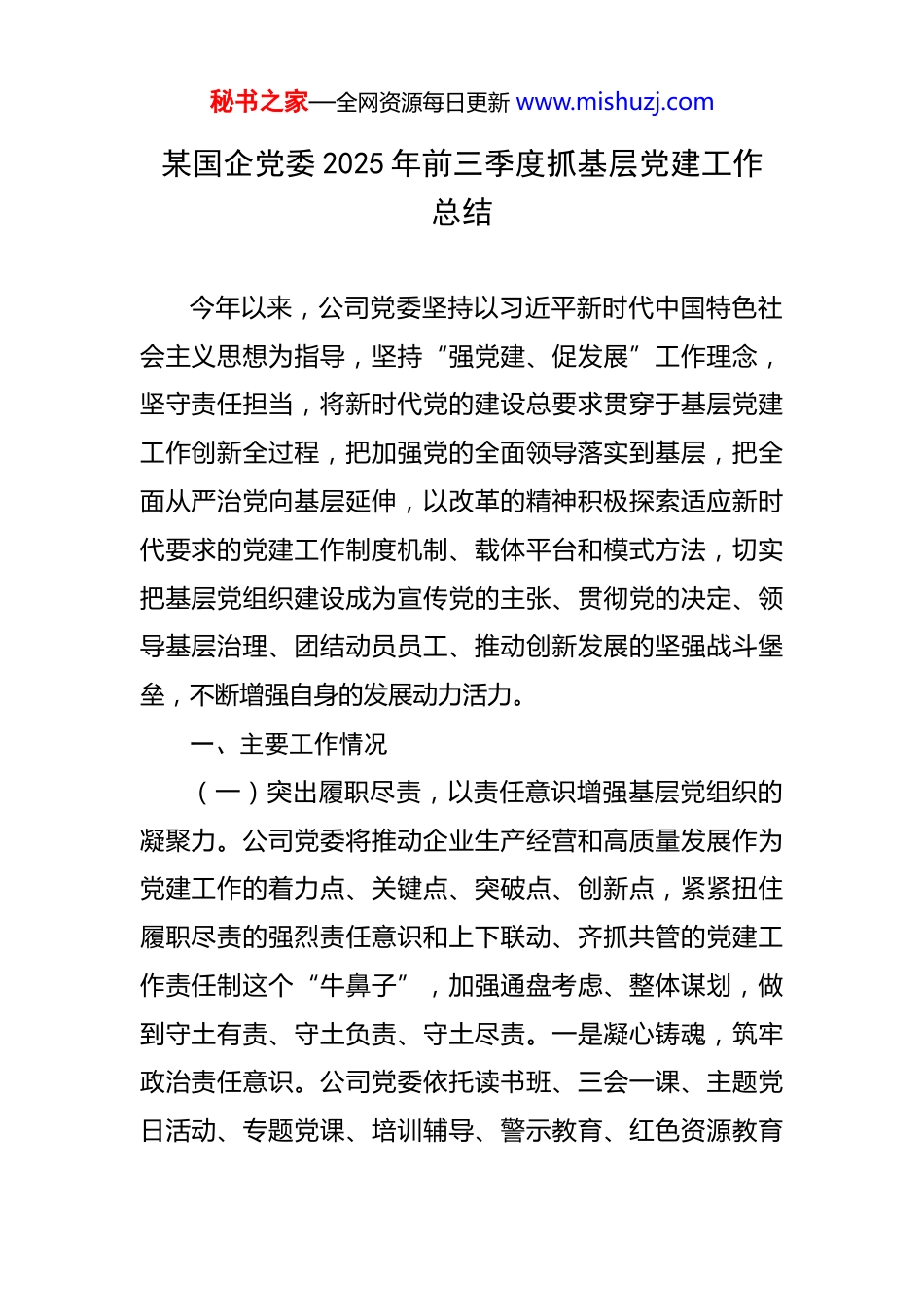 秘书之家—全网资源每日更新 www.mishuzj.com某国企党委 2025 年前三季度抓基层党建工作总结 今年以来,公司党委坚持以习近平新时代中国特色社会主义思想为指导,坚持“强党建、促发展”工作理念,坚守责任担当,将新时代党的建设总要求贯穿于基层党建工作创新全过程,把加强党的全面领导落实到基层,把全面从严治党向基层延伸,以改革的精神积极探索适应新时代要求的党建工作制度机制、载体平台和模式方法,切实把基层党组织建设成为宣传党的主张、贯彻党的决定、领导基层治理、团结动员员工、推动创新发展的坚强战斗堡垒,不断增强自身的发展动力活力。一、主要工作情况(一)突出履职尽责,以责任意识增强基层党组织的凝聚力。公司党委将推动企业生产经营和高质量发展作为党建工作的着力点、关键点、突破点、创新点,紧紧扭住履职尽责的强烈责任意识和上下联动、齐抓共管的党建工作责任制这个“牛鼻子”,加强通盘考虑、整体谋划,做到守土有责、守土负责、守土尽责。一是凝心铸魂,筑牢政治责任意识。公司党委依托读书班、三会一课、主题党日活动、专题党课、培训辅导、警示教育、红色资源教育秘书之家—全网资源每日更新 www.mishuzj.com以及国资 e 学、强国学习平台等方式,积极探索沉浸式、场景式、互动式“微党课·人人讲”新模式,开好“第一会”、领读“第一章”、讲好“第一课”;将习近平新时代中国特色社会主义思想和习近平总书记的重要讲话、最新理论成果、重要指示批示精神等作为第一议题,第一时间组织学习、贯彻落实。扎实开展深入贯彻中央八项规定精神学习教育,深入学习宣贯习近平总书记关于全面从严治党的重要论述,深刻领悟“两个确立”的决定性意义,增强“四个意识”、坚定“四个自信”、做到“两个维护”,并与生产经营、调查研究、巡视整改相结合,教育引导党员干部始终把对党忠诚作为首要政治原则、政治本色、政治品质,提高政治站位,坚定理想信念。二是恪尽职守,筑牢主体责任意识。始终把党建作为第一工程,公司党委认真履行党组织书记第一责任、副书记直接责任、班子成员“一岗双责”职责,一级抓一级、一级带一级,层层压实责任、传递压力,形成职责清晰、任务明确、闭环管理的责任链条和上下联动、齐抓共管的服务企业改革发展、赢得党员广泛认可、体现创新时代特色的党建工作新格局。完善党组织书记抓党建述职述廉考核评价制度,完善各项党建工作标准,从组织体系、党员教育、作风建设、活动管理、保障运行等方面提出规范化要求及举措,秘书之家—全网资源每日更新 www.mishuzj.com为提升基层党建工作提供了基本遵循和管理标尺。三是提升绩效,筑牢落实党建责任制意识。建立一套符合上级要求、体现自身特点、比较规范完善的党建工作制度机制贯穿党建工作始终,全面提高党建科学化水平。公司党委坚持工作项目化、项目清单化、清单责任化、责任数量化,进一步完善日推进、周通报、月考核、年总评的工作运行和督导推进机制,激发广大党员的工作热情和创新活力。推行党的建设一把手责任制、目标责任制和包保责任制,并将党建工作绩效管理体系的科学建立和绩效考核结果纳入企业战略目标、绩效管理体系中,与生产经营同部署、同检查、同考核、同推进。(二)突出创先争优,以主线意识增强基层党组织的创造力。坚持以主题主线为根本遵循和科学指引,不断提高党建工作质效。公司党委以高度的政治责任感,聚焦“发挥党组织政治核心政治引领作用”工作主线,充分掌握企业的经营形势和目标任务,善于在大局大势中把准党建工作定位和作用,全方位、多渠道开展党建工作,在广大员工中产生共鸣,为企业高质量发展提供坚强的政治思想、组织保障。一是坚持团结协作,发挥党组织的领导作用。公司党委按照“集体领导、民主集中、个别酝酿、会议决定”的原则,研究决定、决策重大事项。将集体领导秘书之家—全网资源每日更新 www.mishuzj.com与个人分工负责有机结合,讲政治、讲正气、顾大局;把广泛发扬民主与正确行使民主集中制原则有机结合,广开门路、纳谏献策;把尊重下级与服从上级有机结合,做到“三同三合”,即:思想同心、目标同向、工作同步;思...