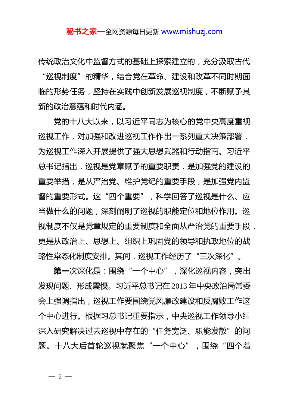 秘书之家—全网资源每日更新 www.mishuzj.com党课:关于党委巡视工作的学习、实践与思考巡视工作既是一次学习知识、拓展视野的难得机会,也是一次锤炼思想作风、提高政治能力的实际锻炼,更是一次巡视他人、检视自我的灵魂洗礼。根据集训安排,我把巡视工作中,各级领导和培训老师指导的,巡视法规文件和有关资料中学习的,以及自己参加巡视中感悟的,向大家作个汇报。由于本人对党委巡视工作的学习、认知、理解和实践积累都还比较浅,汇报不妥当的地方请同志们批评指正。主要汇报三个方面的内容:一是十八大以来党的巡视工作深化发展历程;二是党委巡视的主要内容;三是迎接党委巡视需要注意把握的问题。首先,汇报第一个问题:十八大以来我们党巡视工作深化发展历程《康熙字典》解释:巡,行也;视,察是非也。所谓巡视即巡行视察,原指古人按照一定方向、界限和目标,行走目视,巡观察看。历史上,“巡视”作为古代统治者维护皇权的上层建筑走上历史舞台,是经济社会发展的产物,延绵五千年不断发展演化。巡视制度起源于先秦,形成于秦汉,成熟于唐宋,兴盛于明清,一直在中国的政治制度中占有重要地位,是极具传统政治文化特征的重要监察制度。我们党巡视制度是在借鉴— 1 —秘书之家—全网资源每日更新 www.mishuzj.com传统政治文化中监督方式的基础上探索建立的,充分汲取古代“巡视制度”的精华,结合党在革命、建设和改革不同时期面临的形势任务,坚持在实践中创新发展巡视制度,不断赋予其新的政治意蕴和时代内涵。党的十八大以来,以习近平同志为核心的党中央高度重视巡视工作,对加强和改进巡视工作作出一系列重大决策部署,为巡视工作深入开展提供了强大思想武器和行动指南。习近平总书记指出,巡视是党章赋予的重要职责,是加强党的建设的重要举措,是从严治党、维护党纪的重要手段,是加强党内监督的重要形式。这“四个重要”,科学回答了巡视是什么、应当做什么的问题,深刻阐明了巡视的职能定位和地位作用。巡视制度不仅是党章规定的重要制度和全面从严治党的重要手段,更是从政治上、思想上、组织上巩固党的领导和执政地位的战略性常态化制度安排。其间,巡视工作经历了“三次深化”。第一次深化是:围绕“一个中心”,深化巡视内容,突出发现问题、形成震慑。习近平总书记在 2013 年中央政治局常委会上强调指出,巡视工作要围绕党风廉政建设和反腐败工作这个中心进行。根据习总书记重要指示,中央巡视工作领导小组深入研究解决过去巡视中存在的“任务宽泛、职能发散”的问题。十八大后首轮巡视就聚焦“一个中心”,围绕“四个着— 2 —秘书之家—全网资源每日更新 www.mishuzj.com力”(着力发现是否存在形式主义、官僚主义、享乐主义和奢靡之风等违反中央八项规定的问题,着力发现领导干部是否存在权钱交易、以权谋私、贪污贿赂、腐化堕落等违纪违法问题,着力发现领导干部是否存在公开发表违背中央决定的言论、散布违背党的理论和路线方针政策的意见、搞“上有政策、下有对策”等违反政治纪律的问题,着力发现是否存在买官卖官、拉票贿选、突击提拔干部等选人用人上的不正之风和腐败行为),把发现问题、形成震慑作为主要任务。这第一次深化,与反腐败斗争严峻复杂的形势相适应,更加强调发现“四个着力”方面问题,有利于发挥震慑作用。第二次深化是:紧扣“六项纪律”,深化“四个着力”,突出纪严于法、纪在法前。2015 年 11 月,习近平总书记在中央政治局会议上强调,要牢牢把握巡视政治定位,聚焦全面从严治党,发现问题、形成震慑,倒逼改革、促进发展。2015 年 6月,习总书记在中央审议《中国共产党巡视条例》时明确指出,加强纪律建设是全面从严治党的治本之策,巡视工作要把纪律和规矩挺在前面,用“六项纪律”深化“四个着力”。《巡视条例》首次从党内法规层面提出“六项纪律”,把违反政治纪律和政治规矩等问题作为巡视监督的首要内容。这第二次深化,与严明党的纪律相适应,更加强调抓早抓小,惩前毖后、治病— 3 —秘书之家—全网资源每日更新 www.mishuzj.com救人,有利于发挥遏制作用。第三次深化是:聚焦坚持党的领导、加强...