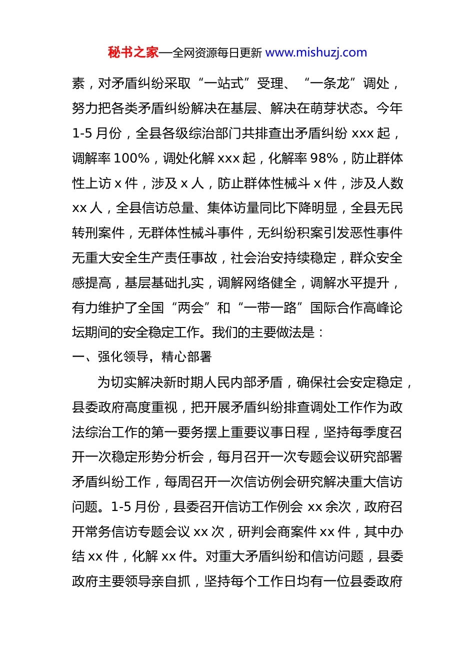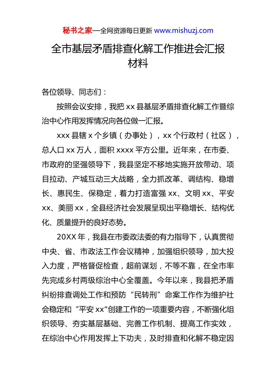 秘书之家—全网资源每日更新 www.mishuzj.com全市基层矛盾排查化解工作推进会汇报材料各位领导、同志们:按照会议安排,我把 xx 县基层矛盾排查化解工作暨综治中心作用发挥情况向各位做一汇报。xxx 县辖 x 个乡镇(办事处),xx 个行政村(社区),总人口 xx 万人,面积 xxxx 平方公里。近年来,在市委、市政府的坚强领导下,我县坚定不移地实施开放带动、项目拉动、产城互动三大战略,全力抓改革、调结构、稳增长、惠民生、保稳定,着力打造富强 xx、文明 xx、平安xx、美丽 xx,全县经济社会发展呈现出平稳增长、结构优化、质量提升的良好态势。20XX 年,我县在市委政法委的有力指导下,认真贯彻中央、省、市政法工作会议精神,加强组织领导,加大投入力度,严格督促检查,超前谋划,不等不靠,在全市率先完成乡村两级综治中心全覆盖。今年以来,我县把矛盾纠纷排查调处工作和预防“民转刑”命案工作作为维护社会稳定和“平安 xx”创建工作的一项重要内容,不断强化组织领导、夯实基层基础、完善工作机制、提高工作实效,在综治中心作用发挥上下功夫,及时排查和化解不稳定因秘书之家—全网资源每日更新 www.mishuzj.com素,对矛盾纠纷采取“一站式”受理、“一条龙”调处,努力把各类矛盾纠纷解决在基层、解决在萌芽状态。今年1-5 月份,全县各级综治部门共排查出矛盾纠纷 xxx 起,调解率 100%,调处化解 xxx 起,化解率 98%,防止群体性上访 x 件,涉及 x 人,防止群体性械斗 x 件,涉及人数xx 人,全县信访总量、集体访量同比下降明显,全县无民转刑案件,无群体性械斗事件,无纠纷积案引发恶性事件无重大安全生产责任事故,社会治安持续稳定,群众安全感提高,基层基础扎实,调解网络健全,调解水平提升,有力维护了全国“两会”和“一带一路”国际合作高峰论坛期间的安全稳定工作。我们的主要做法是:一、强化领导,精心部署为切实解决新时期人民内部矛盾,确保社会安定稳定,县委政府高度重视,把开展矛盾纠纷排查调处工作作为政法综治工作的第一要务摆上重要议事日程,坚持每季度召开一次稳定形势分析会,每月召开一次专题会议研究部署矛盾纠纷工作,每周召开一次信访例会研究解决重大信访问题。1-5 月份,县委召开信访工作例会 xx 余次,政府召开常务信访专题会议 xx 次,研判会商案件 xx 件,其中办结 xx 件,化解 xx 件。对重大矛盾纠纷和信访问题,县委政府主要领导亲自抓,坚持每个工作日均有一位县委政府秘书之家—全网资源每日更新 www.mishuzj.com领导带班接访,县委四大班子成员分别挂乡镇(办)下访解决重大矛盾和信访问题。今年来,根据省、市的文件精神,我们结合县情实际,认真研究制定了《全县集中开展矛盾纠纷大排查大化解切实预防“民转刑”命案专项行动工作方案》,组织召开了各乡镇和县综治委成员单位主要负责人参加了维护社会稳定动员会,对开展这项工作进行动员部署。各乡镇(办)、县综治成员各单位相应制定了切实可行的实施方案,形成了党委领导、部门齐抓共管,社会各界联动的排查调处工作格局。二、健全机制,规范运作我们坚持“突出重点、分类指导、重心下移、联动联调”的工作思路,不断完善机制建设,健全预防机制 、分析机制、处置机制。县委政府出台了《关于预防来县信访突发事项处置预案》和《关于应急处置信访工作突发问题预案》,对涉及人数较多的突发重大矛盾纠纷针对不同情况,不同类型,制定相应的应急方案,研究处置方法,形成统一指挥,功能齐全,反应灵敏的应急处置机制,确保依法果断有效处置。此外,我们还建立完善了预警、排查联调等机制,完善了信息报送,挂牌督办,跟踪反馈,建档立册等制度,逐步形成了一套行之有效的矛盾纠纷排查调处工作机制。秘书之家—全网资源每日更新 www.mishuzj.com三、突出重点,着力排查按照村组三天一排查、行政村一周一汇总研判上报、乡镇十天一研判通报交办、县一月一研判督导,确保县乡村排查同步责任化解和责任交办工作落实。持续完善人民调解、行政调解、司法调解“三调联动”工作机制,积极推动在医疗卫生、道路交通、劳动争议等领域建立人民...
