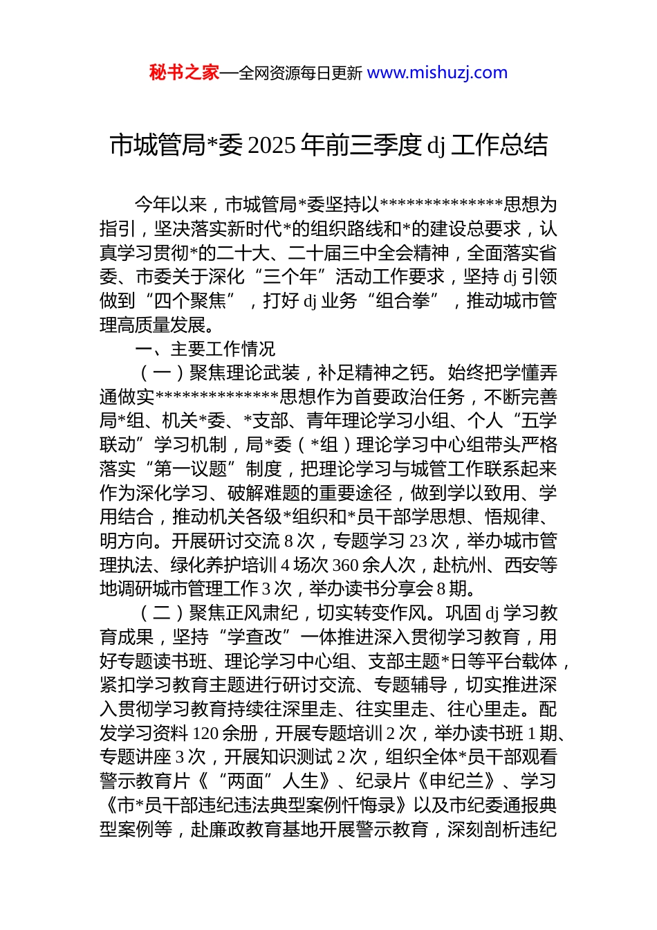 秘书之家—全网资源每日更新 www.mishuzj.com市城管局*委 2025 年前三季度 dj 工作总结今年以来,市城管局*委坚持以**************思想为指引,坚决落实新时代*的组织路线和*的建设总要求,认真学习贯彻*的二十大、二十届三中全会精神,全面落实省委、市委关于深化“三个年”活动工作要求,坚持 dj 引领做到“四个聚焦”,打好 dj 业务“组合拳”,推动城市管理高质量发展。一、主要工作情况(一)聚焦理论武装,补足精神之钙。始终把学懂弄通做实**************思想作为首要政治任务,不断完善局*组、机关*委、*支部、青年理论学习小组、个人“五学联动”学习机制,局*委(*组)理论学习中心组带头严格落实“第一议题”制度,把理论学习与城管工作联系起来作为深化学习、破解难题的重要途径,做到学以致用、学用结合,推动机关各级*组织和*员干部学思想、悟规律、明方向。开展研讨交流 8 次,专题学习 23 次,举办城市管理执法、绿化养护培训 4 场次 360 余人次,赴杭州、西安等地调研城市管理工作 3 次,举办读书分享会 8 期。(二)聚焦正风肃纪,切实转变作风。巩固 dj 学习教育成果,坚持“学查改”一体推进深入贯彻学习教育,用好专题读书班、理论学习中心组、支部主题*日等平台载体,紧扣学习教育主题进行研讨交流、专题辅导,切实推进深入贯彻学习教育持续往深里走、往实里走、往心里走。配发学习资料 120 余册,开展专题培训 2 次,举办读书班 1 期、专题讲座 3 次,开展知识测试 2 次,组织全体*员干部观看警示教育片《“两面”人生》、纪录片《申纪兰》、学习《市*员干部违纪违法典型案例忏悔录》以及市纪委通报典型案例等,赴廉政教育基地开展警示教育,深刻剖析违纪秘书之家—全网资源每日更新 www.mishuzj.com典型案例,教育引导*员干部从典型案例中受警醒、明底线、知敬畏,切实转作风、做表率、抓落实。(三)聚焦基层建设,筑牢战斗堡垒。根据机构改革,单位更名合并等实际情况,指导局属 3 个*支部合理设置*组织,配强*支部书记,配齐配优支部班子成员,明确专职*务干部,增强支部班子创造力、凝聚力、战斗力。规范*支部落实“三会一课”、谈心谈话等*的组织生活基本制度,局属 7 个*支部书记讲*课 14 人次,定期开展谈心谈话,关心*员工作生活,慰问困难*员 8 人。开展 1 次*务干部业务培训,不定期开展业务交流,有效提升了*务干部的业务技能。设立*员先锋岗 6 处、成立*员先锋队 4 支、划分*员责任区 9 片,开展志愿服务活动 12 次。让*员充分发挥先锋模范作用,在急难险重任务面前能冲锋在前。(四)聚焦主责主业,服务社会发展。坚持“生命至上、安全第一”原则,优选 100 名防汛抢险经验丰富的*员团结协作构建了“横向到边、纵向到底”的中心城区排水防涝工作网络体系。汛期先后开展排水防涝应急演练 2 次,安装排水井防坠网 3200 余个,应急抢险 10 余次,为城市的安全稳定运行筑起一道坚不可摧的“安全堤”。实行一项重点项目、一名县级领导包抓、一个科室(单位)负责、一套措施推进的“四个一”工作法,全市全域污水处理项目累计建成运行厂站 53 座,建成管网 773 公里。抢抓“赛事”机遇,城区 12 个高品质气排球场建成投用,建成开放口袋公园 3 处,指导实施 6 处夹角地边角地改造。深入践行“四下基层”和“五个到一线”制度,大力推行“721”工作法,扎实开展“城管进社区、服务面对面”活动,设立 36个便民服务点并提供一杯热茶暖心服务,在 15 所小学和幼儿园设立“城管护学岗”;在公园广场设置售货亭 6 个,冷热饮水机 12 个、主角小舞台 8 处、暂座吧 8 个,为摊贩“安家”、为群众“服务”、为学生“护学”、为车辆“留位”。为迎宾路社区西背街低洼点马道巷修建排水管秘书之家—全网资源每日更新 www.mishuzj.com道 30 米,彻底解决内涝及排水问题;加班加点、多方协调,为二龙山水库家属院改造给水管道 100 米,更换燃气智能物联表及设施 32 户,改造燃气管道 260 米。在供水、供气、供暖等窗口单位实行挂牌上岗、微笑服务,严格执行一次性告...