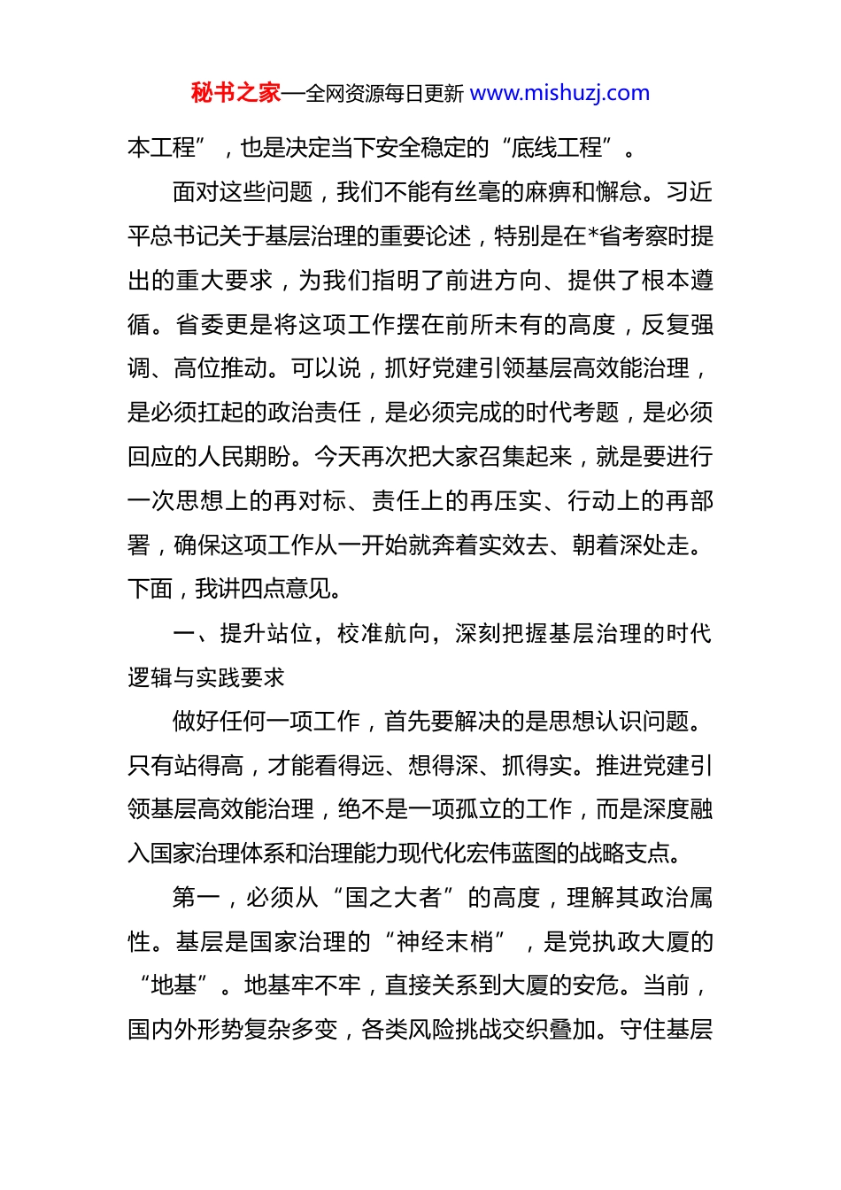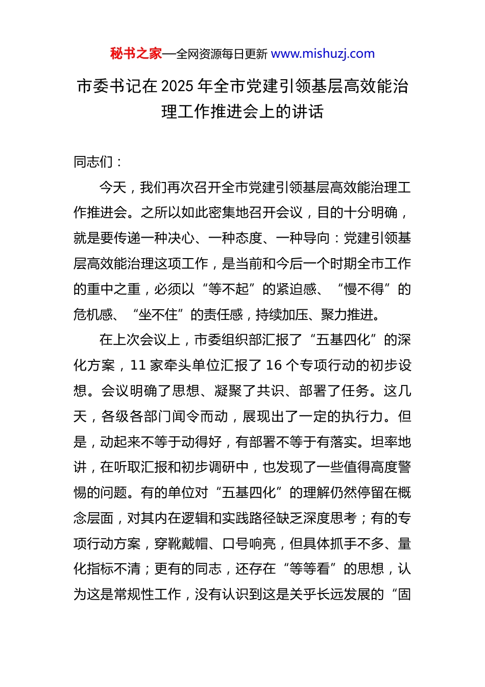 秘书之家—全网资源每日更新 www.mishuzj.com市委书记在 2025 年全市党建引领基层高效能治理工作推进会上的讲话 同志们:今天,我们再次召开全市党建引领基层高效能治理工作推进会。之所以如此密集地召开会议,目的十分明确,就是要传递一种决心、一种态度、一种导向:党建引领基层高效能治理这项工作,是当前和今后一个时期全市工作的重中之重,必须以“等不起”的紧迫感、“慢不得”的危机感、“坐不住”的责任感,持续加压、聚力推进。在上次会议上,市委组织部汇报了“五基四化”的深化方案,11 家牵头单位汇报了 16 个专项行动的初步设想。会议明确了思想、凝聚了共识、部署了任务。这几天,各级各部门闻令而动,展现出了一定的执行力。但是,动起来不等于动得好,有部署不等于有落实。坦率地讲,在听取汇报和初步调研中,也发现了一些值得高度警惕的问题。有的单位对“五基四化”的理解仍然停留在概念层面,对其内在逻辑和实践路径缺乏深度思考;有的专项行动方案,穿靴戴帽、口号响亮,但具体抓手不多、量化指标不清;更有的同志,还存在“等等看”的思想,认为这是常规性工作,没有认识到这是关乎长远发展的“固秘书之家—全网资源每日更新 www.mishuzj.com本工程”,也是决定当下安全稳定的“底线工程”。面对这些问题,我们不能有丝毫的麻痹和懈怠。习近平总书记关于基层治理的重要论述,特别是在*省考察时提出的重大要求,为我们指明了前进方向、提供了根本遵循。省委更是将这项工作摆在前所未有的高度,反复强调、高位推动。可以说,抓好党建引领基层高效能治理,是必须扛起的政治责任,是必须完成的时代考题,是必须回应的人民期盼。今天再次把大家召集起来,就是要进行一次思想上的再对标、责任上的再压实、行动上的再部署,确保这项工作从一开始就奔着实效去、朝着深处走。下面,我讲四点意见。一、提升站位,校准航向,深刻把握基层治理的时代逻辑与实践要求做好任何一项工作,首先要解决的是思想认识问题。只有站得高,才能看得远、想得深、抓得实。推进党建引领基层高效能治理,绝不是一项孤立的工作,而是深度融入国家治理体系和治理能力现代化宏伟蓝图的战略支点。第一,必须从“国之大者”的高度,理解其政治属性。基层是国家治理的“神经末梢”,是党执政大厦的“地基”。地基牢不牢,直接关系到大厦的安危。当前,国内外形势复杂多变,各类风险挑战交织叠加。守住基层秘书之家—全网资源每日更新 www.mishuzj.com阵地,就守住了安全稳定发展的基本盘。要把这项工作作为检验“两个维护”是否坚决、“四个意识”是否牢固的试金石,自觉把思想和行动统一到中央决策和省委部署上来,确保政令畅通、令行禁止。不能把基层治理简单看作是“鸡毛蒜皮”的琐事,要认识到每一件看似微小的民生诉求、每一个看似孤立的矛盾纠纷,背后都关联着人心向背和政治安全。第二,必须从“发展所需”的角度,理解其战略价值。高质量发展需要高水平安全,高效能治理是高质量发展的必然要求和重要保障。一个地方营商环境好不好,社会秩序稳不稳,干部作风实不实,最终都会体现在基层治理的成效上。一个充满矛盾纠纷、安全感缺失的区域,不可能吸引优质的资本、留住优秀的人才。反之,一个治理有序、服务高效、充满活力的社会,必然会形成强大的发展“引力场”。因此,推进基层高效能治理,不是单纯的维稳投入,而是根本性的发展赋能。这是“栽梧桐树,引凤凰来”的基础工程,是优化营商环境、激发市场活力的治本之策。第三,必须从“群众所盼”的立场,理解其民生本质。江山就是人民,人民就是江山。基层治理的出发点和落脚点,就是要解决好群众的急难愁盼问题。群众的获得秘书之家—全网资源每日更新 www.mishuzj.com感、幸福感、安全感,是最真实、最直接的“政绩单”。要始终坚持以人民为中心的发展思想,把工作的评判权交给群众。当前,群众的需求日趋多元化、个性化,对公共服务的便捷性、精准性、人性化提出了更高要求。过去那种“大水漫灌”式的管理服务模式已经难以为继。我们必须俯下身子,聚焦群众身边的微事项、微诉求、微服务,通过绣花般的功夫,把工作做到...