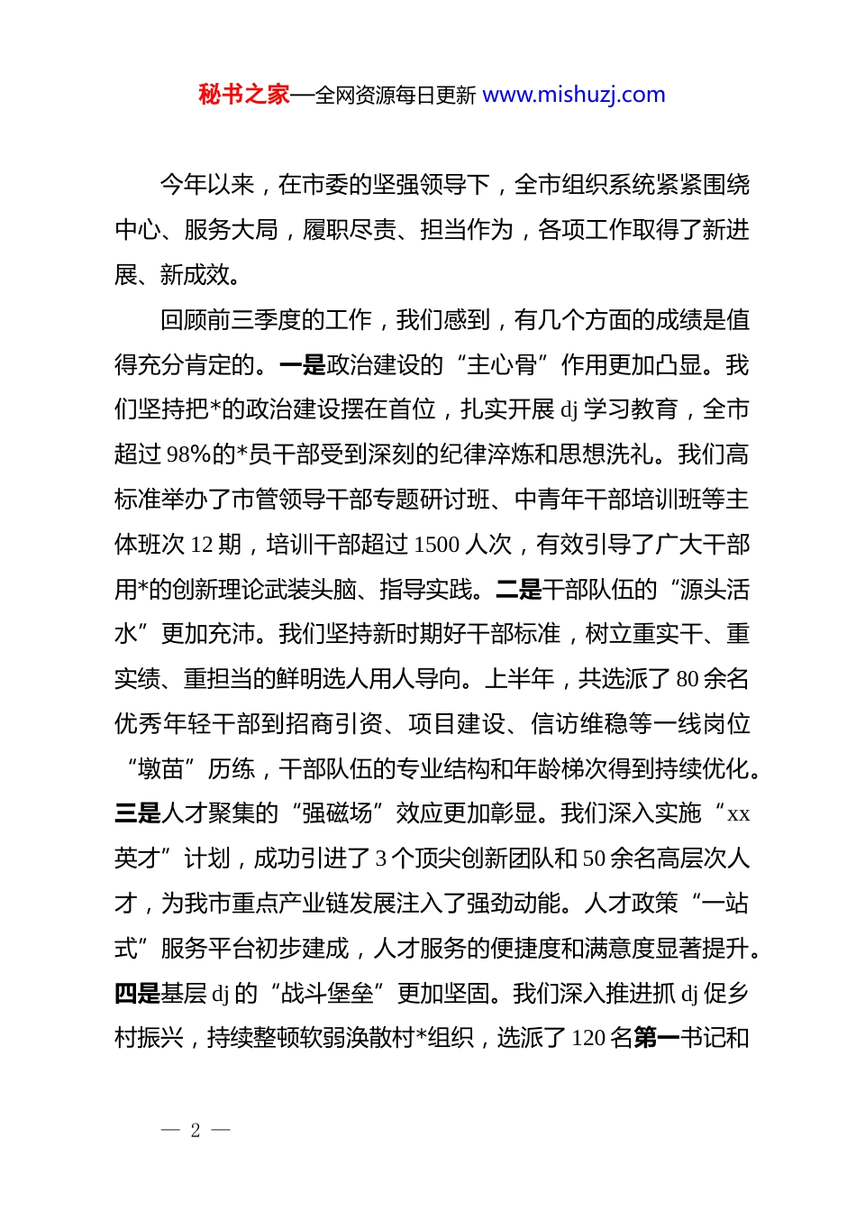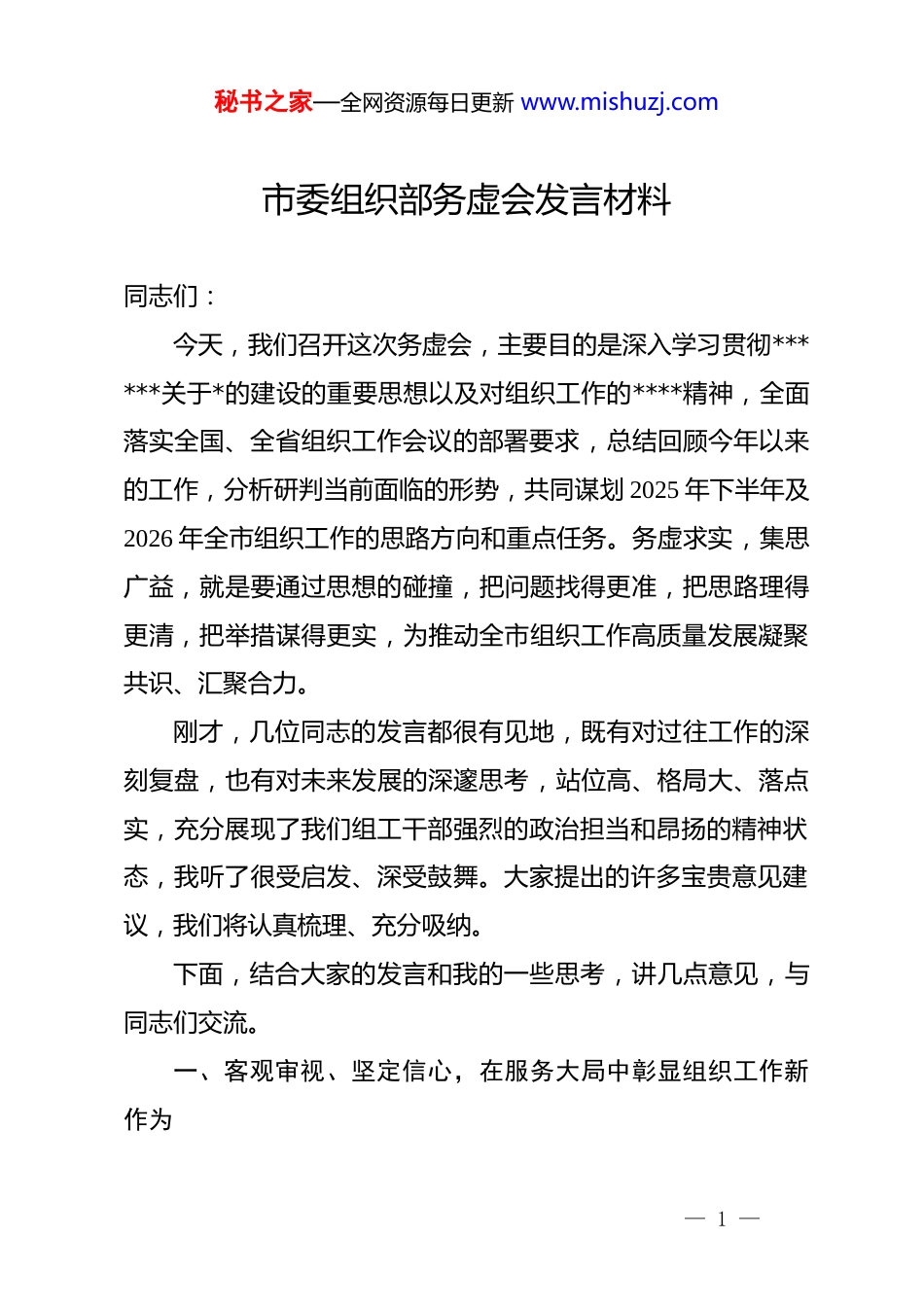 秘书之家—全网资源每日更新 www.mishuzj.com市委组织部务虚会发言材料同志们:今天,我们召开这次务虚会,主要目的是深入学习贯彻******关于*的建设的重要思想以及对组织工作的****精神,全面落实全国、全省组织工作会议的部署要求,总结回顾今年以来的工作,分析研判当前面临的形势,共同谋划 2025 年下半年及2026 年全市组织工作的思路方向和重点任务。务虚求实,集思广益,就是要通过思想的碰撞,把问题找得更准,把思路理得更清,把举措谋得更实,为推动全市组织工作高质量发展凝聚共识、汇聚合力。刚才,几位同志的发言都很有见地,既有对过往工作的深刻复盘,也有对未来发展的深邃思考,站位高、格局大、落点实,充分展现了我们组工干部强烈的政治担当和昂扬的精神状态,我听了很受启发、深受鼓舞。大家提出的许多宝贵意见建议,我们将认真梳理、充分吸纳。下面,结合大家的发言和我的一些思考,讲几点意见,与同志们交流。一、客观审视、坚定信心,在服务大局中彰显组织工作新作为— 1 —秘书之家—全网资源每日更新 www.mishuzj.com今年以来,在市委的坚强领导下,全市组织系统紧紧围绕中心、服务大局,履职尽责、担当作为,各项工作取得了新进展、新成效。回顾前三季度的工作,我们感到,有几个方面的成绩是值得充分肯定的。一是政治建设的“主心骨”作用更加凸显。我们坚持把*的政治建设摆在首位,扎实开展 dj 学习教育,全市超过 98%的*员干部受到深刻的纪律淬炼和思想洗礼。我们高标准举办了市管领导干部专题研讨班、中青年干部培训班等主体班次 12 期,培训干部超过 1500 人次,有效引导了广大干部用*的创新理论武装头脑、指导实践。二是干部队伍的“源头活水”更加充沛。我们坚持新时期好干部标准,树立重实干、重实绩、重担当的鲜明选人用人导向。上半年,共选派了 80 余名优秀年轻干部到招商引资、项目建设、信访维稳等一线岗位“墩苗”历练,干部队伍的专业结构和年龄梯次得到持续优化。三是人才聚集的“强磁场”效应更加彰显。我们深入实施“xx英才”计划,成功引进了 3 个顶尖创新团队和 50 余名高层次人才,为我市重点产业链发展注入了强劲动能。人才政策“一站式”服务平台初步建成,人才服务的便捷度和满意度显著提升。四是基层 dj 的“战斗堡垒”更加坚固。我们深入推进抓 dj 促乡村振兴,持续整顿软弱涣散村*组织,选派了 120 名第一书记和— 2 —秘书之家—全网资源每日更新 www.mishuzj.com工作队员尽锐出战。上半年,全市村级集体经济总收入同比增长 12%,平均每个村达到 45 万元,有力地夯实了乡村全面振兴的组织基础。在肯定成绩的同时,我们更要清醒地认识到工作中存在的短板和不足。正如刚才一些同志提到的,我们的工作还面临着不少挑战。这些问题,需要我们高度重视,并在下一步工作中切实加以解决。二、把握大势、直面挑战,深刻认识组织工作面临的新形势新任务当前,我们正处在一个深刻变革的时代,新一轮科技革命和产业变革加速演进,区域竞争日趋激烈,高质量发展的任务艰巨繁重。这为我们的组织工作带来了前所未有的新挑战、新要求。一是干部能力素质面临“本领恐慌”的挑战。随着我市深度融入 xx 城市群、建设 xx 产业先行区等重大战略的推进,对干部驾驭市场经济、推动科技创新、应对复杂局面的能力提出了更高要求。但从现状来看,部分干部知识结构老化、专业能力不足、视野格局不宽的问题依然存在,“老办法不管用、新办法不会用”的现象时有发生。如何大规模、高效率地提升干部队伍的专业化能力,是我们必须破解的紧迫课题。— 3 —秘书之家—全网资源每日更新 www.mishuzj.com二是人才竞争格局面临“高端流失”的挑战。近年来,我们虽然在人才工作上投入了很大力气,但与 xx、xx 等先进地区相比,我们的人才政策吸引力、平台承载力、服务软实力仍有差距。高层次创新人才、产业领军人才和高技能人才“引不来、留不住”的问题比较突出,人才结构与我市产业转型升级的需求还不完全匹配,人才“蓄水池”亟待加固。三是基层治理模式面临“转型阵痛”的挑战。随着城镇化进程加快,城乡结构、社会结...