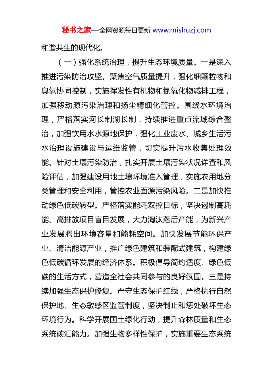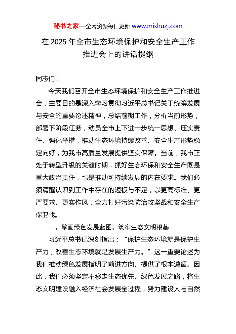 秘书之家—全网资源每日更新 www.mishuzj.com在 2025 年全市生态环境保护和安全生产工作推进会上的讲话提纲 同志们:今天我们召开全市生态环境保护和安全生产工作推进会,主要目的是深入学习贯彻习近平总书记关于统筹发展与安全的重要论述精神,总结前期工作,分析当前形势,部署下阶段任务,动员全市上下进一步统一思想、压实责任、强化举措,推动生态环境持续改善、安全生产形势稳定向好,为我市高质量发展提供坚实保障。当前,我市正处于转型升级的关键时期,抓好生态环保和安全生产既是重大政治责任,也是推动可持续发展的内在要求。我们必须清醒认识到工作中存在的短板与不足,以更高标准、更严要求、更实作风,全力打好污染防治攻坚战和安全生产保卫战。一、擎画绿色发展蓝图,筑牢生态文明根基习近平总书记深刻指出:“保护生态环境就是保护生产力,改善生态环境就是发展生产力。”这一重要论述为我们推动绿色发展指明了前进方向、提供了根本遵循。因此,我们必须坚定不移走生态优先、绿色发展之路,将生态文明建设融入经济社会发展全过程,努力建设人与自然秘书之家—全网资源每日更新 www.mishuzj.com和谐共生的现代化。(一)强化系统治理,提升生态环境质量。一是深入推进污染防治攻坚。聚焦空气质量提升,强化细颗粒物和臭氧协同控制,实施挥发性有机物和氮氧化物减排工程,加强移动源污染治理和扬尘精细化管控。围绕水环境治理,严格落实河长制湖长制,持续推进重点流域综合整治,加强饮用水水源地保护,强化工业废水、城乡生活污水治理设施建设与运维监管,切实提升污水收集处理效能。针对土壤污染防治,扎实开展土壤污染状况详查和风险评估,加强建设用地土壤环境准入管理,实施农用地分类管理和安全利用,管控农业面源污染风险。二是加快推动绿色低碳转型。严格落实能耗双控目标,坚决遏制高耗能、高排放项目盲目发展,大力淘汰落后产能,为新兴产业发展腾出环境容量和能耗空间。加快发展节能环保产业、清洁能源产业,推广绿色建筑和装配式建筑,构建绿色低碳循环发展的经济体系。积极倡导简约适度、绿色低碳的生活方式,营造全社会共同参与的良好氛围。三是持续加强生态保护修复。严守生态保护红线,严格执行自然保护地、生态敏感区监管制度,坚决制止和惩处破坏生态环境行为。科学开展国土绿化行动,提升森林质量和生态系统碳汇能力。加强生物多样性保护,实施重要生态系统秘书之家—全网资源每日更新 www.mishuzj.com保护和修复重大工程,恢复退化的生态系统,筑牢生态安全屏障。(二)完善体制机制,压实环境保护责任。一是健全环境治理领导责任体系。坚持党政同责、一岗双责,压实各级党委和政府生态环境保护责任,明确相关部门职责分工,形成齐抓共管的工作格局。完善生态环境考核评价机制,将资源消耗、环境损害、生态效益等指标纳入经济社会发展综合评价体系,强化考核结果运用。二是健全环境治理企业责任体系。依法实行排污许可管理制度,落实企业污染治理、损害赔偿和生态修复责任。完善企业环境信用评价制度,将企业环境违法信息记入信用记录,依法依规实施联合惩戒。推动企业公开环境信息,接受社会监督。三是健全环境治理全民行动体系。强化公众参与和社会监督,完善公众举报、听证、舆论监督等制度,保障人民群众的知情权、参与权、监督权。发挥各类社会团体作用,引导环保社会组织有序参与环境治理。加大生态环境保护宣传教育力度,增强全社会生态环境意识。(三)提升监管能力,强化环境执法效能。一是构建智慧环保监管体系。充分利用大数据、云计算、物联网等先进技术,构建覆盖全市、互联互通、高效运行的生态环境监测网络,提升对环境质量、污染源、生态状况的感秘书之家—全网资源每日更新 www.mishuzj.com知、预警、分析和决策能力。推动环境监管智能化、精准化,提高非现场执法能力。二是加大环境执法监管力度。保持环境执法高压态势,综合运用按日连续处罚、查封扣押、限产停产等手段,依法严惩重罚环境违法行为。健全行政执法与刑事司法衔接机制,严厉打击环境犯罪。开展重点区域、重点领域、重点行业专项执法行动,解决突出环境问...