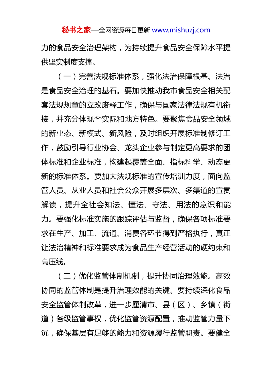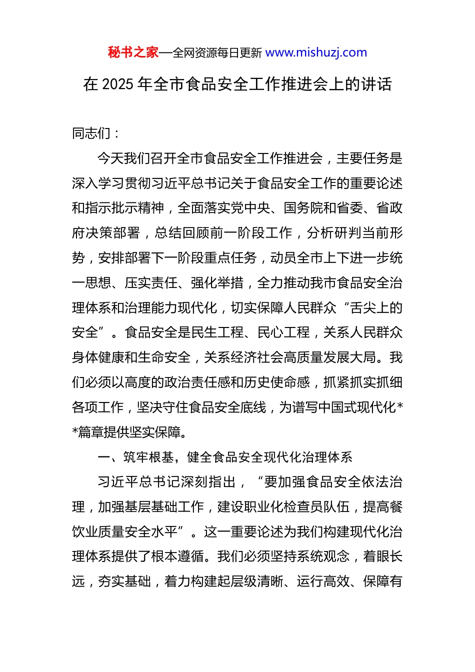 秘书之家—全网资源每日更新 www.mishuzj.com在 2025 年全市食品安全工作推进会上的讲话 同志们:今天我们召开全市食品安全工作推进会,主要任务是深入学习贯彻习近平总书记关于食品安全工作的重要论述和指示批示精神,全面落实党中央、国务院和省委、省政府决策部署,总结回顾前一阶段工作,分析研判当前形势,安排部署下一阶段重点任务,动员全市上下进一步统一思想、压实责任、强化举措,全力推动我市食品安全治理体系和治理能力现代化,切实保障人民群众“舌尖上的安全”。食品安全是民生工程、民心工程,关系人民群众身体健康和生命安全,关系经济社会高质量发展大局。我们必须以高度的政治责任感和历史使命感,抓紧抓实抓细各项工作,坚决守住食品安全底线,为谱写中国式现代化**篇章提供坚实保障。一、筑牢根基,健全食品安全现代化治理体系习近平总书记深刻指出,“要加强食品安全依法治理,加强基层基础工作,建设职业化检查员队伍,提高餐饮业质量安全水平”。这一重要论述为我们构建现代化治理体系提供了根本遵循。我们必须坚持系统观念,着眼长远,夯实基础,着力构建起层级清晰、运行高效、保障有秘书之家—全网资源每日更新 www.mishuzj.com力的食品安全治理架构,为持续提升食品安全保障水平提供坚实制度支撑。(一)完善法规标准体系,强化法治保障根基。法治是食品安全治理的基石。要加快推动我市食品安全相关配套法规规章的立改废释工作,确保与国家法律法规有机衔接,并充分体现**实际和地方特色。要聚焦食品安全领域的新业态、新模式、新风险,及时组织开展标准制修订工作,鼓励引导行业协会、龙头企业参与制定更高要求的团体标准和企业标准,构建起覆盖全面、指标科学、动态更新的标准体系。要加大法规标准的宣传培训力度,面向监管人员、从业人员和社会公众开展多层次、多渠道的宣贯解读,提升全社会知法、懂法、守法、用法的意识和能力。要强化标准实施的跟踪评估与监督,确保各项标准要求在生产、加工、流通、消费各环节得到严格执行,真正让法治精神和标准要求成为食品生产经营活动的硬约束和高压线。(二)优化监管体制机制,提升协同治理效能。高效协同的监管体制是提升治理效能的关键。要持续深化食品安全监管体制改革,进一步厘清市、县(区)、乡镇(街道)各级监管事权,优化监管资源配置,推动监管力量下沉,确保基层有足够的能力和资源履行监管职责。要健全秘书之家—全网资源每日更新 www.mishuzj.com跨部门、跨区域食品安全信息通报、联合执法、隐患排查、事故处置等协调联动机制,打破部门壁垒和区域界限,形成监管合力。要积极探索“智慧监管”新模式,推动大数据、人工智能、物联网等技术在食品安全监管领域的深度融合与应用,构建覆盖全链条的食品安全智慧追溯与风险预警平台,实现“互联网+监管”的转型升级。要完善行刑衔接机制,强化行政执法与刑事司法的高效联动,对食品安全违法犯罪行为保持零容忍的高压打击态势。(三)夯实技术支撑能力,构筑科学防控屏障。科技是食品安全治理的重要手段。要持续加大投入,加强市、县两级食品安全检验检测机构能力建设,优化实验室布局,配齐配强先进仪器设备,提升对高风险食品、新发污染物、未知风险的检验检测和能力验证水平。要推动检验检测资源整合共享,鼓励社会第三方检测机构健康发展,构建起以法定机构为主体、第三方机构为补充的检验检测体系。要强化风险监测评估的先行作用,健全覆盖从农田到餐桌全过程的食品安全风险监测网络,扩大监测范围、指标和样本量,加强监测数据的收集、分析和利用,及时识别和评估潜在风险。要加强食品安全专业技术人才队伍建设,培养引进高水平学科带头人和技术骨干,打造一支政治过硬、业务精湛、作风优良的职业化、专业化检查员秘书之家—全网资源每日更新 www.mishuzj.com队伍。二、压实责任,拧紧食品安全全链条责任链条习近平总书记强调,“要落实‘四个最严’的要求,切实保障人民群众‘舌尖上的安全’”。落实最严谨的标准、最严格的监管、最严厉的处罚、最严肃的问责,关键在于压实各方责任。我们必须坚持党政同责、一岗双责,权责一致、齐...