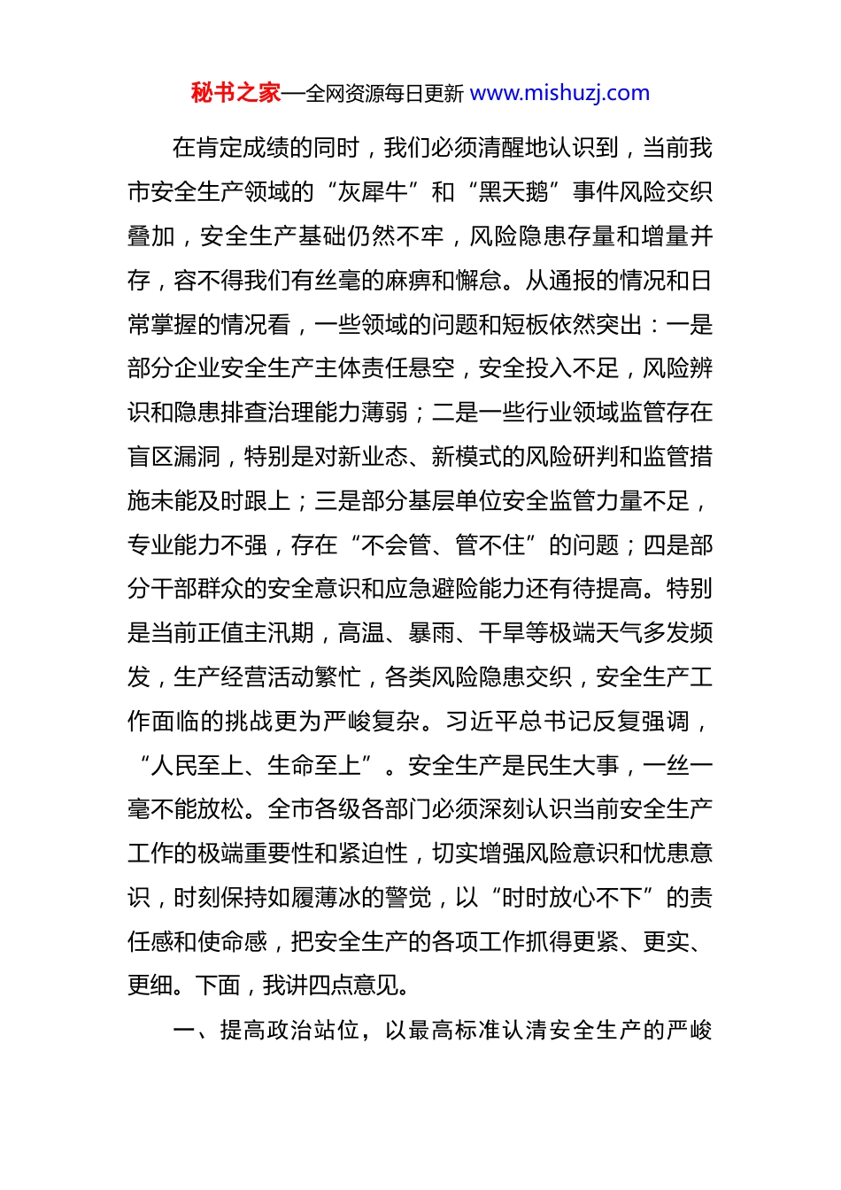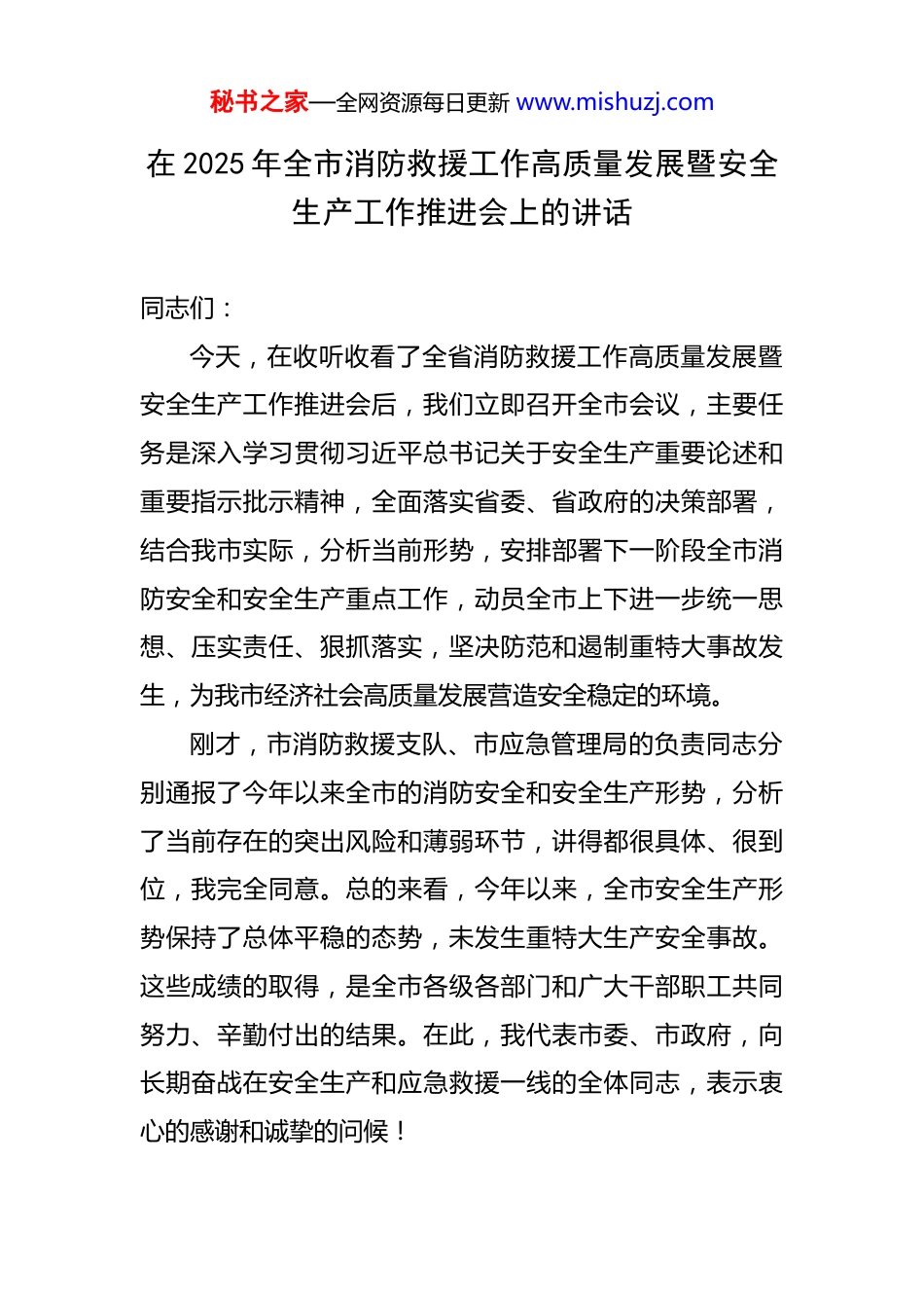 秘书之家—全网资源每日更新 www.mishuzj.com在 2025 年全市消防救援工作高质量发展暨安全生产工作推进会上的讲话 同志们:今天,在收听收看了全省消防救援工作高质量发展暨安全生产工作推进会后,我们立即召开全市会议,主要任务是深入学习贯彻习近平总书记关于安全生产重要论述和重要指示批示精神,全面落实省委、省政府的决策部署,结合我市实际,分析当前形势,安排部署下一阶段全市消防安全和安全生产重点工作,动员全市上下进一步统一思想、压实责任、狠抓落实,坚决防范和遏制重特大事故发生,为我市经济社会高质量发展营造安全稳定的环境。刚才,市消防救援支队、市应急管理局的负责同志分别通报了今年以来全市的消防安全和安全生产形势,分析了当前存在的突出风险和薄弱环节,讲得都很具体、很到位,我完全同意。总的来看,今年以来,全市安全生产形势保持了总体平稳的态势,未发生重特大生产安全事故。这些成绩的取得,是全市各级各部门和广大干部职工共同努力、辛勤付出的结果。在此,我代表市委、市政府,向长期奋战在安全生产和应急救援一线的全体同志,表示衷心的感谢和诚挚的问候!秘书之家—全网资源每日更新 www.mishuzj.com在肯定成绩的同时,我们必须清醒地认识到,当前我市安全生产领域的“灰犀牛”和“黑天鹅”事件风险交织叠加,安全生产基础仍然不牢,风险隐患存量和增量并存,容不得我们有丝毫的麻痹和懈怠。从通报的情况和日常掌握的情况看,一些领域的问题和短板依然突出:一是部分企业安全生产主体责任悬空,安全投入不足,风险辨识和隐患排查治理能力薄弱;二是一些行业领域监管存在盲区漏洞,特别是对新业态、新模式的风险研判和监管措施未能及时跟上;三是部分基层单位安全监管力量不足,专业能力不强,存在“不会管、管不住”的问题;四是部分干部群众的安全意识和应急避险能力还有待提高。特别是当前正值主汛期,高温、暴雨、干旱等极端天气多发频发,生产经营活动繁忙,各类风险隐患交织,安全生产工作面临的挑战更为严峻复杂。习近平总书记反复强调,“人民至上、生命至上”。安全生产是民生大事,一丝一毫不能放松。全市各级各部门必须深刻认识当前安全生产工作的极端重要性和紧迫性,切实增强风险意识和忧患意识,时刻保持如履薄冰的警觉,以“时时放心不下”的责任感和使命感,把安全生产的各项工作抓得更紧、更实、更细。下面,我讲四点意见。一、提高政治站位,以最高标准认清安全生产的严峻秘书之家—全网资源每日更新 www.mishuzj.com形势安全是发展的前提,发展是安全的保障。没有安全,一切发展都无从谈起。全市上下必须从战略和全局的高度,深刻把握安全生产工作的极端重要性,始终把保障人民群众生命财产安全放在第一位。第一,要深刻领会安全生产的政治属性。安全生产工作不仅是经济问题、社会问题,更是重大的政治问题。能不能守住安全生产的底线,直接关系到人民群众的切身利益,关系到党和政府的形象,关系到社会大局的和谐稳定。各级领导干部要不断提高政治判断力、政治领悟力、政治执行力,把学习贯彻习近平总书记关于安全生产重要论述作为重要的政治任务,真正做到入脑入心、见行见效,自觉地把“两个至上”的要求落实到决策、部署、执行的全过程各环节,以实际行动和工作成效坚定拥护“两个确立”、坚决做到“两个维护”。第二,要清醒认识安全生产的复杂形势。当前,我们正处在经济恢复发展的关键时期,各类生产经营活动进入高峰期,人流、物流、车流高度集中。同时,我市产业结构转型升级过程中,传统高危行业风险尚未完全化解,新兴产业领域的安全风险又不断显现。比如,新能源、新材料、平台经济等领域,都伴生着新的安全挑战。加之今年秘书之家—全网资源每日更新 www.mishuzj.com以来,全国范围内发生了一些影响重大的安全事故,教训极其深刻。以 2024 年为例,全国共接报处置各类灾害事故90.8 万起,造成 2001 人死亡,直接财产损失高达 77.4亿元。这些冰冷的数字背后,是一个个破碎的家庭和沉重的社会代价,我们必须引以为戒,警钟长鸣。我们必须坚持底线思维,增强忧患意识,把困难和风险想得更充分一...