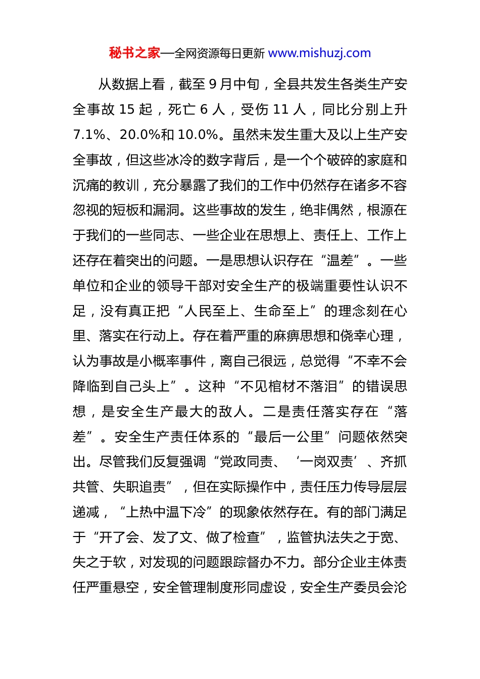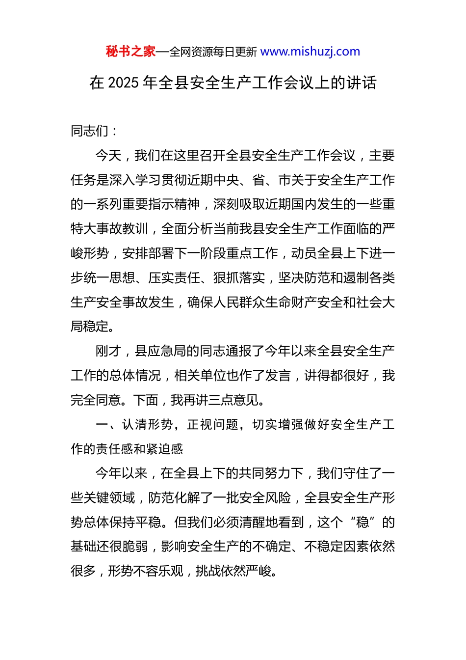 秘书之家—全网资源每日更新 www.mishuzj.com在 2025 年全县安全生产工作会议上的讲话 同志们:今天,我们在这里召开全县安全生产工作会议,主要任务是深入学习贯彻近期中央、省、市关于安全生产工作的一系列重要指示精神,深刻吸取近期国内发生的一些重特大事故教训,全面分析当前我县安全生产工作面临的严峻形势,安排部署下一阶段重点工作,动员全县上下进一步统一思想、压实责任、狠抓落实,坚决防范和遏制各类生产安全事故发生,确保人民群众生命财产安全和社会大局稳定。刚才,县应急局的同志通报了今年以来全县安全生产工作的总体情况,相关单位也作了发言,讲得都很好,我完全同意。下面,我再讲三点意见。一、认清形势,正视问题,切实增强做好安全生产工作的责任感和紧迫感今年以来,在全县上下的共同努力下,我们守住了一些关键领域,防范化解了一批安全风险,全县安全生产形势总体保持平稳。但我们必须清醒地看到,这个“稳”的基础还很脆弱,影响安全生产的不确定、不稳定因素依然很多,形势不容乐观,挑战依然严峻。秘书之家—全网资源每日更新 www.mishuzj.com从数据上看,截至 9 月中旬,全县共发生各类生产安全事故 15 起,死亡 6 人,受伤 11 人,同比分别上升7.1%、20.0%和 10.0%。虽然未发生重大及以上生产安全事故,但这些冰冷的数字背后,是一个个破碎的家庭和沉痛的教训,充分暴露了我们的工作中仍然存在诸多不容忽视的短板和漏洞。这些事故的发生,绝非偶然,根源在于我们的一些同志、一些企业在思想上、责任上、工作上还存在着突出的问题。一是思想认识存在“温差”。一些单位和企业的领导干部对安全生产的极端重要性认识不足,没有真正把“人民至上、生命至上”的理念刻在心里、落实在行动上。存在着严重的麻痹思想和侥幸心理,认为事故是小概率事件,离自己很远,总觉得“不幸不会降临到自己头上”。这种“不见棺材不落泪”的错误思想,是安全生产最大的敌人。二是责任落实存在“落差”。安全生产责任体系的“最后一公里”问题依然突出。尽管我们反复强调“党政同责、‘一岗双责’、齐抓共管、失职追责”,但在实际操作中,责任压力传导层层递减,“上热中温下冷”的现象依然存在。有的部门满足于“开了会、发了文、做了检查”,监管执法失之于宽、失之于软,对发现的问题跟踪督办不力。部分企业主体责任严重悬空,安全管理制度形同虚设,安全生产委员会沦秘书之家—全网资源每日更新 www.mishuzj.com为摆设,安全培训教育“走过场”,特种作业人员无证上岗、违规操作等现象屡禁不止。企业主要负责人作为安全生产第一责任人的责任意识淡薄,对安全生产状况心中无数,对存在的重大风险隐患视而不见。三是隐患排查存在“偏差”。从近期的检查情况看,一些领域的隐患排查治理工作还不够深入、不够彻底。有的排查满足于“翻箱倒柜式”的表面功夫,对深层次、根源性的问题发现不了、解决不掉。比如,在建筑施工领域,高处作业、有限空间作业等高风险环节的安全措施依然存在薄弱点。在工贸行业,一些企业对粉尘防爆、涉氨制冷等领域的安全风险辨识不清,整改措施不到位。在消防安全方面,电动自行车违规停放充电、“三合一”场所等火灾隐患依然是我们的心头大患。特别是一些新业态、新模式带来的新型风险与传统风险交织叠加,我们的监管能力和手段还没有完全跟上,导致一些隐患长期存在,成了随时可能引爆的“定时炸弹”。四是监管执法存在“温情”。在执法过程中,一些同志碍于情面,不愿、不敢较真碰硬,存在“老好人”思想,对违法违规行为“高高举起、轻轻放下”,以罚代管、一罚了之。执法检查的专业性、精准性不强,难以真正发现问题、震慑违法。这种“温情”执法,实际上是对人民群众生命财产安全的“无情”和“冷漠”,必须坚决秘书之家—全网资源每日更新 www.mishuzj.com予以纠正。同志们,安全生产责任重于泰山。任何一丝一毫的松懈、一点一滴的疏忽,都可能酿成无法挽回的悲剧。我们必须深刻吸取教训,时刻保持如履薄冰、如临深渊的警觉,以对党和人民高度负责的态度,把安全生产这根弦绷得更紧、更牢。二、突出重点,精准发力,坚...