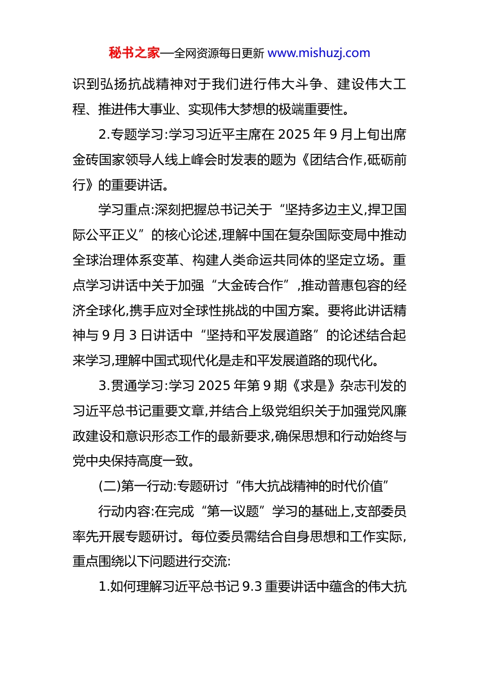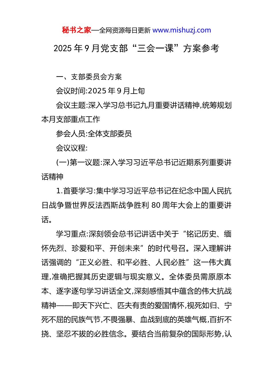 秘书之家—全网资源每日更新 www.mishuzj.com2025 年 9 月党支部“三会一课”方案参考 一、支部委员会方案会议时间:2025 年 9 月上旬会议主题:深入学习总书记九月重要讲话精神,统筹规划本月支部重点工作参会人员:全体支部委员会议议程:(一)第一议题:深入学习习近平总书记近期系列重要讲话精神1.首要学习:集中学习习近平总书记在纪念中国人民抗日战争暨世界反法西斯战争胜利 80 周年大会上的重要讲话。学习重点:深刻领会总书记讲话中关于“铭记历史、缅怀先烈、珍爱和平、开创未来”的时代号召。深入理解讲话强调的“正义必胜、和平必胜、人民必胜”这一伟大真理,准确把握其历史逻辑与现实意义。全体委员需原原本本、逐字逐句学习讲话全文,深刻感悟其中蕴含的伟大抗战精神——即天下兴亡、匹夫有责的爱国情怀,视死如归、宁死不屈的民族气节,不畏强暴、血战到底的英雄气概,百折不挠、坚忍不拔的必胜信念。要结合当前复杂的国际形势,认秘书之家—全网资源每日更新 www.mishuzj.com识到弘扬抗战精神对于我们进行伟大斗争、建设伟大工程、推进伟大事业、实现伟大梦想的极端重要性。2.专题学习:学习习近平主席在 2025 年 9 月上旬出席金砖国家领导人线上峰会时发表的题为《团结合作,砥砺前行》的重要讲话。学习重点:深刻把握总书记关于“坚持多边主义,捍卫国际公平正义”的核心论述,理解中国在复杂国际变局中推动全球治理体系变革、构建人类命运共同体的坚定立场。重点学习讲话中关于加强“大金砖合作”,推动普惠包容的经济全球化,携手应对全球性挑战的中国方案。要将此讲话精神与 9 月 3 日讲话中“坚持和平发展道路”的论述结合起来学习,理解中国式现代化是走和平发展道路的现代化。3.贯通学习:学习 2025 年第 9 期《求是》杂志刊发的习近平总书记重要文章,并结合上级党组织关于加强党风廉政建设和意识形态工作的最新要求,确保思想和行动始终与党中央保持高度一致。(二)第一行动:专题研讨“伟大抗战精神的时代价值”行动内容:在完成“第一议题”学习的基础上,支部委员率先开展专题研讨。每位委员需结合自身思想和工作实际,重点围绕以下问题进行交流:1.如何理解习近平总书记 9.3 重要讲话中蕴含的伟大抗秘书之家—全网资源每日更新 www.mishuzj.com战精神的深刻内涵?2.在当前工作中,我们面临的“新长征路上的‘娄山关’‘腊子口’”是什么?应如何从抗战精神中汲取智慧和力量?3.如何将弘扬抗战精神与我们单位(部门)的核心业务、攻坚克难任务结合起来,转化为推动高质量发展的具体行动?行动要求:研讨要务求实效,避免空谈。要形成初步共识,为后续在党员大会和党小组会上引领学习、深化讨论打下坚实基础。(三)党内事务1.研究并确定本月党员大会及党课的详细方案,明确主题、形式、主讲人和具体安排。2.审议并通过本月党小组会的学习重点和讨论提纲。3.结合中秋、国庆“双节”临近的节点,研究部署节前廉洁自律教育工作,组织学习相关通报案例,筑牢党员干部拒腐防变的思想防线。二、支部党员大会方案活动时间:2025 年 9 月中旬活动主题:铭记光辉历史,弘扬抗战精神,奋进伟大新征程参会人员:全体党员秘书之家—全网资源每日更新 www.mishuzj.com活动流程:(一)集中学习:深入学习贯彻习近平总书记 9.3 重要讲话精神学习形式:由支部书记领学,重点解读习近平总书记在纪念中国人民抗日战争暨世界反法西斯战争胜利 80 周年大会上重要讲话的核心要义。学习过程可穿插播放 9.3 阅兵式及总书记讲话的视频片段,增强现场感和感染力。学习内容:聚焦讲话中关于中国人民抗日战争伟大胜利的历史贡献、伟大抗战精神的时代价值、以及中国坚持走和平发展道路的庄严宣示等关键部分。引导全体党员深刻认识到,我们今天的幸福生活是无数先烈用鲜血和生命换来的,必须倍加珍惜,并自觉肩负起实现中华民族伟大复兴的历史使命。(二)主题实践活动:“三个一”系列活动1.观看一部红色影片:组织全体党员集中观看一部反映抗战历史的经典或新近推出的优秀影视作品 ,如《捍卫者》、《东京审判》等。观影后,利用 15-20 分钟时间,请几位党员代表分享观后感,深化情感共鸣和思想升华。2.组织一次现...